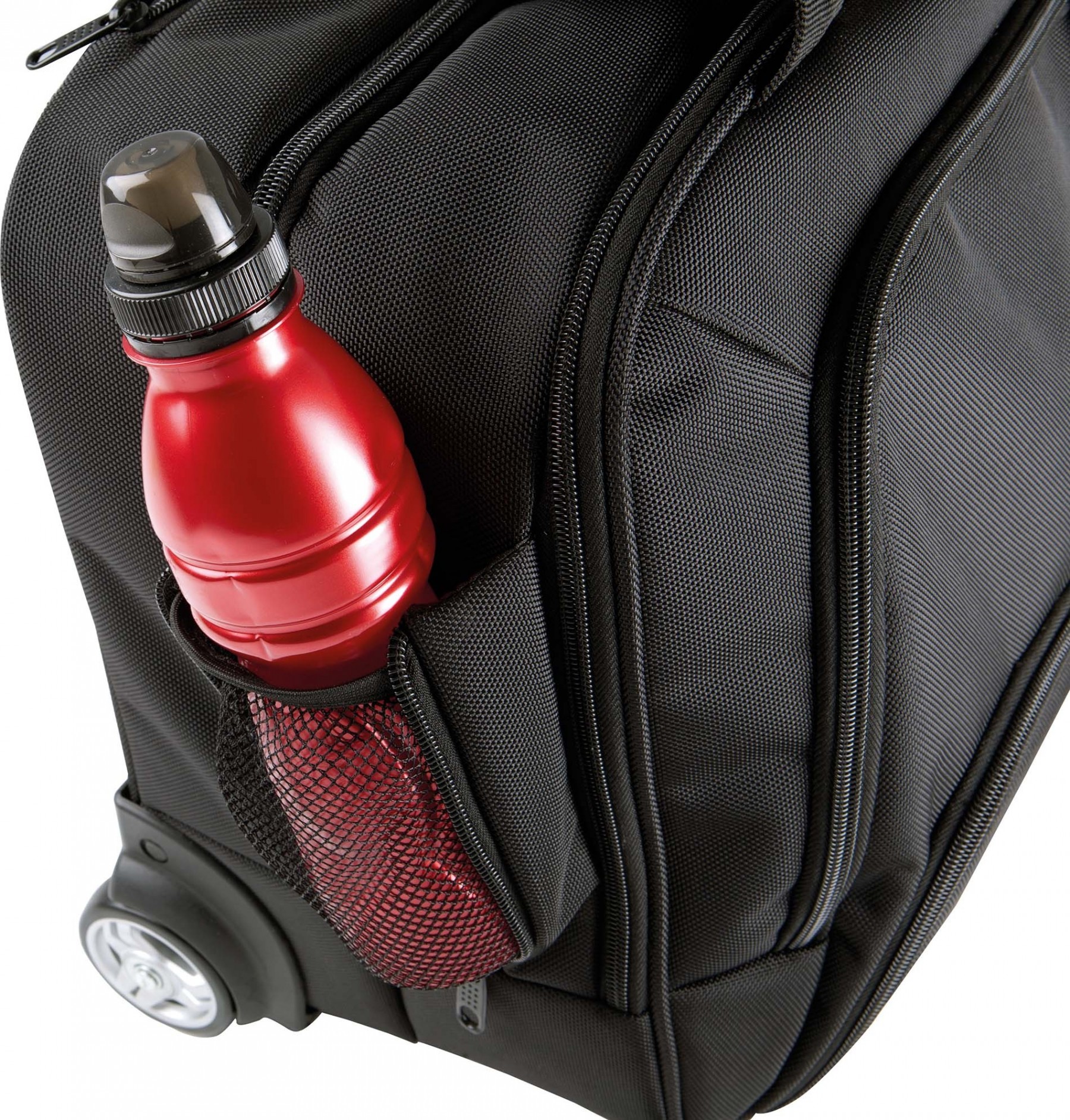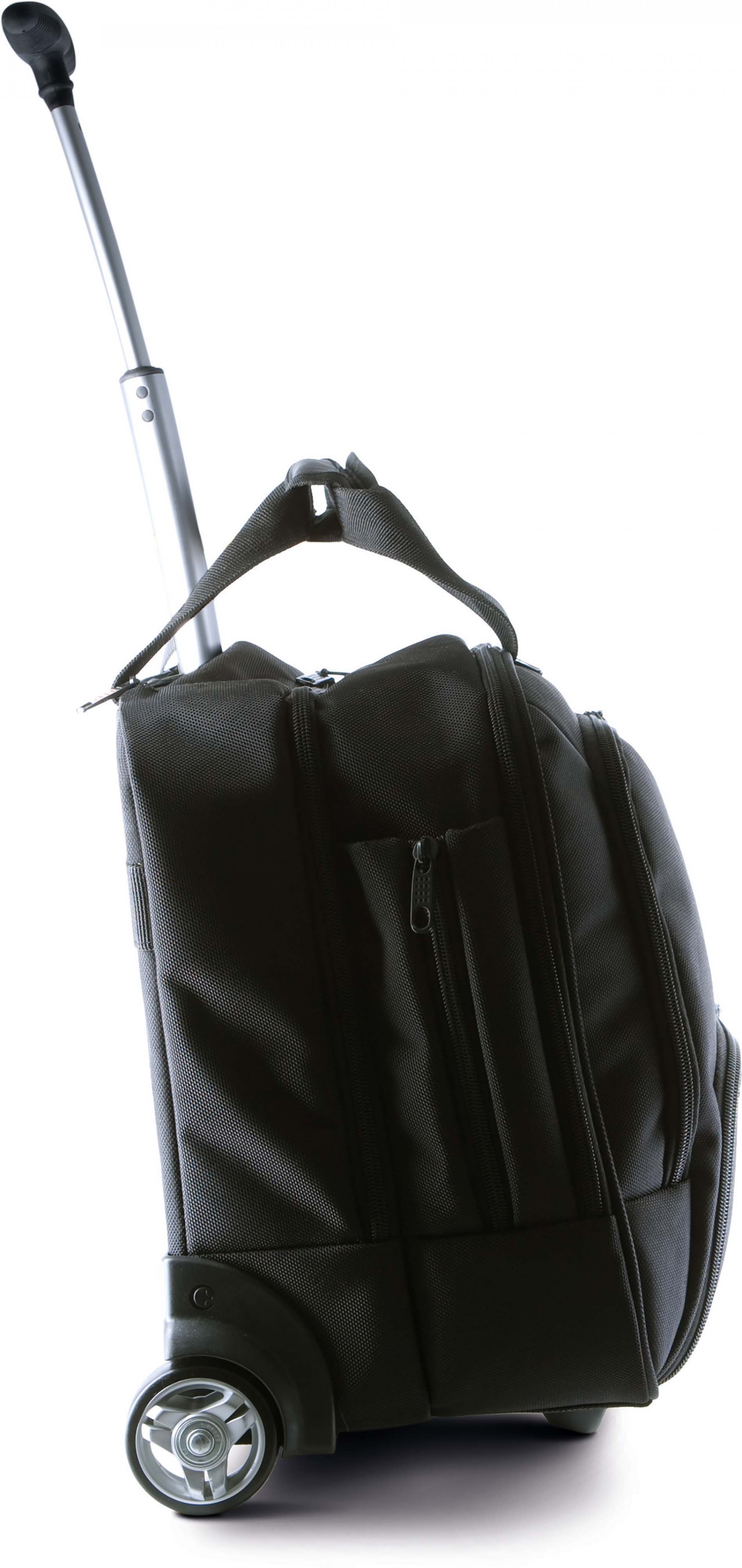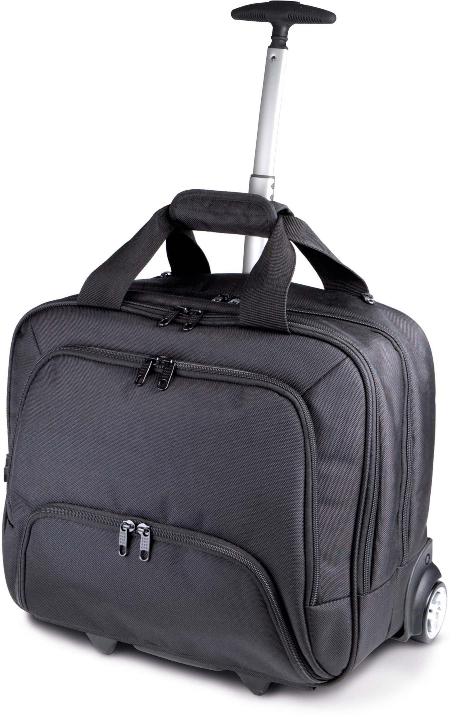 Trolley ordinateur en polyester 1680D, poignée rigide incurvée ajustable en aluminium. 2 compartiments principaux : 1 central avec emplacement ordinateur jusqu'à 15''et 1 pour porte-documents et vêtements (maximum pour une nuit), 2 poches devant : 1 pour recevoir les accessoires ordinateur et 1 pour le porte-clefs. Attache-fixation trolley au dos.