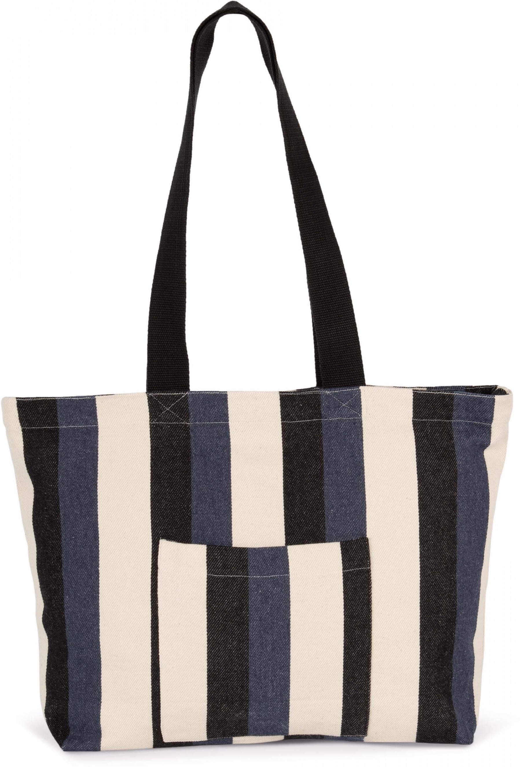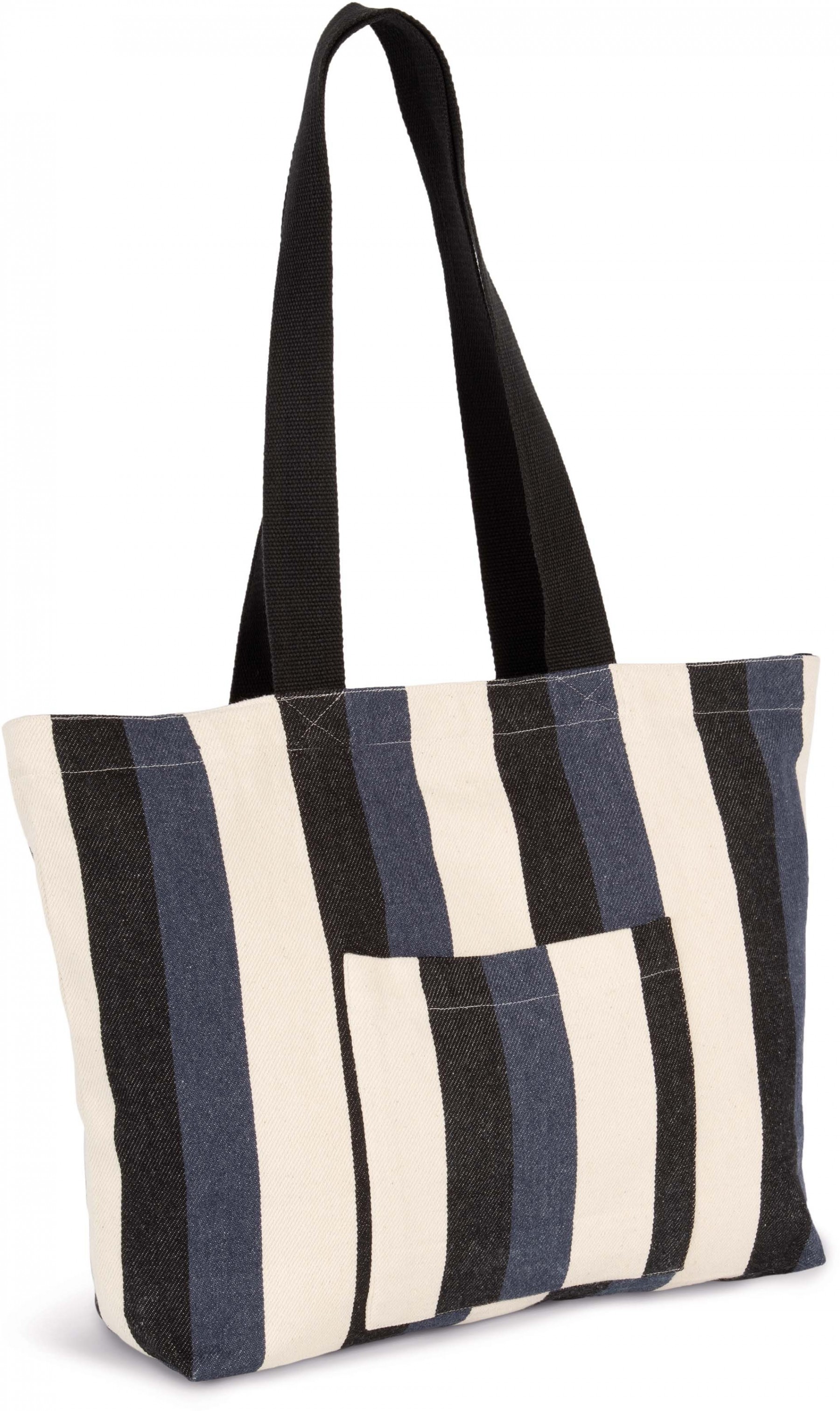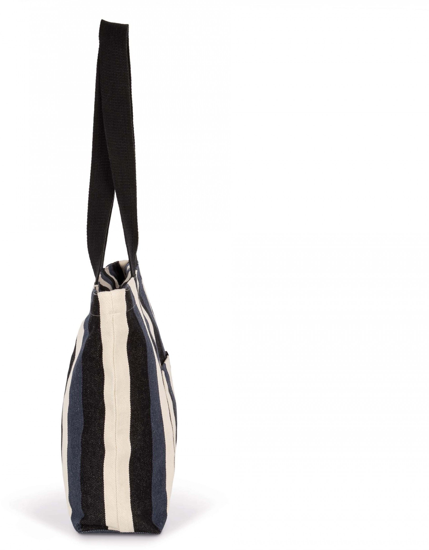 78% coton / 20% polyester/ 2% autres fibres. Sac shopping composé de 78% de coton recyclé 20% de polyester recyclé. Le certificat GRS (Global Recycet led Standard) est délivré par Ecocert Greenlife. L'intérieur du sac est doublé avec un tissu de couleur contrastée. Le compartiment principal comporte une fermeture zippée. Le sac est doté d'une poche intérieure avec fermeture zippée et de anses de 4 cm de largeur pour plus de confort. Le tissu sergé rayé confère un aspect unique à chaque pièce.