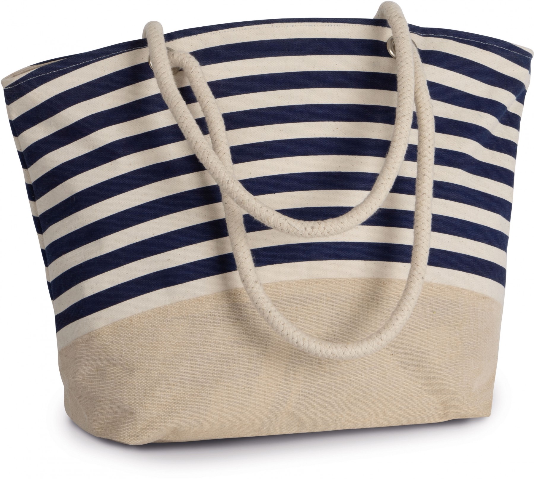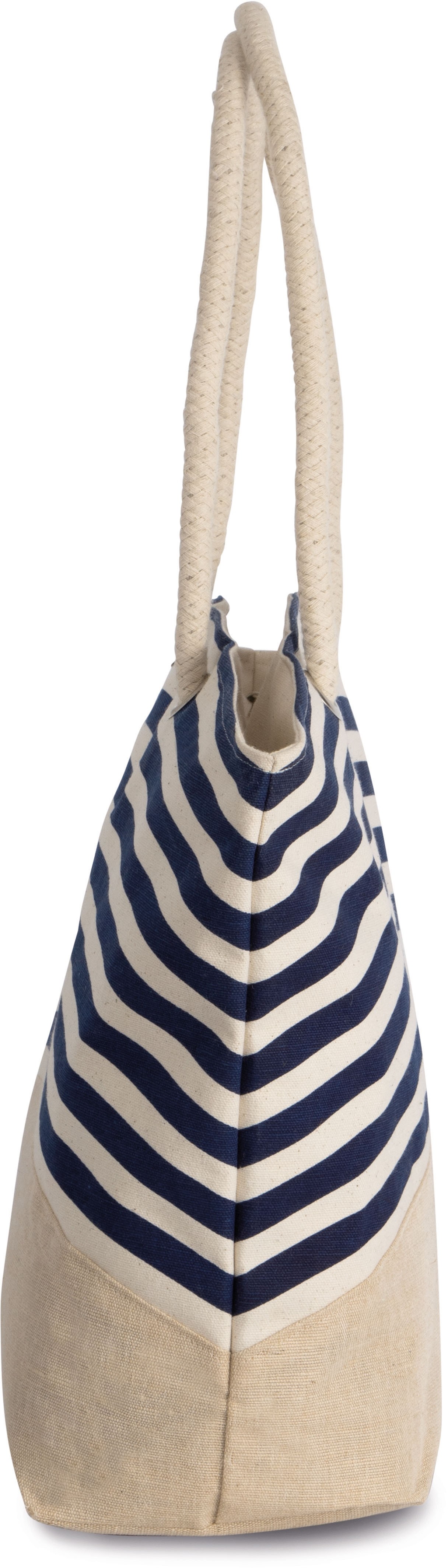 70% jute / 30% coton. Sac shopping/ Sac à main, avec imprimé marinière, en coton canvas et jute. Anses en coton avec cordelette intérieure en coloris naturel. Poche interne. Fermeture zippée. S'accorde parfaitement avec à la pochette KI0752 de la même collection.