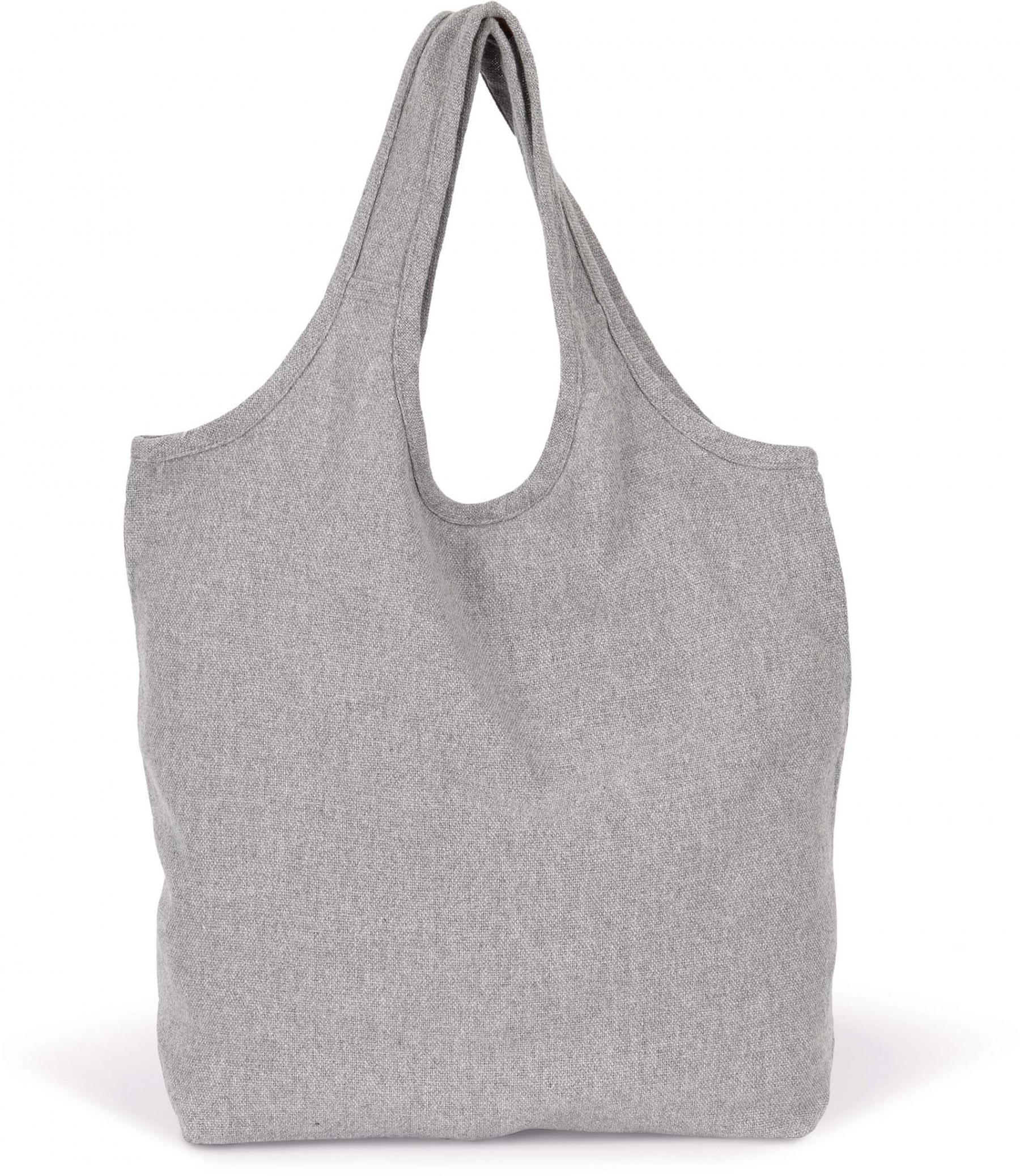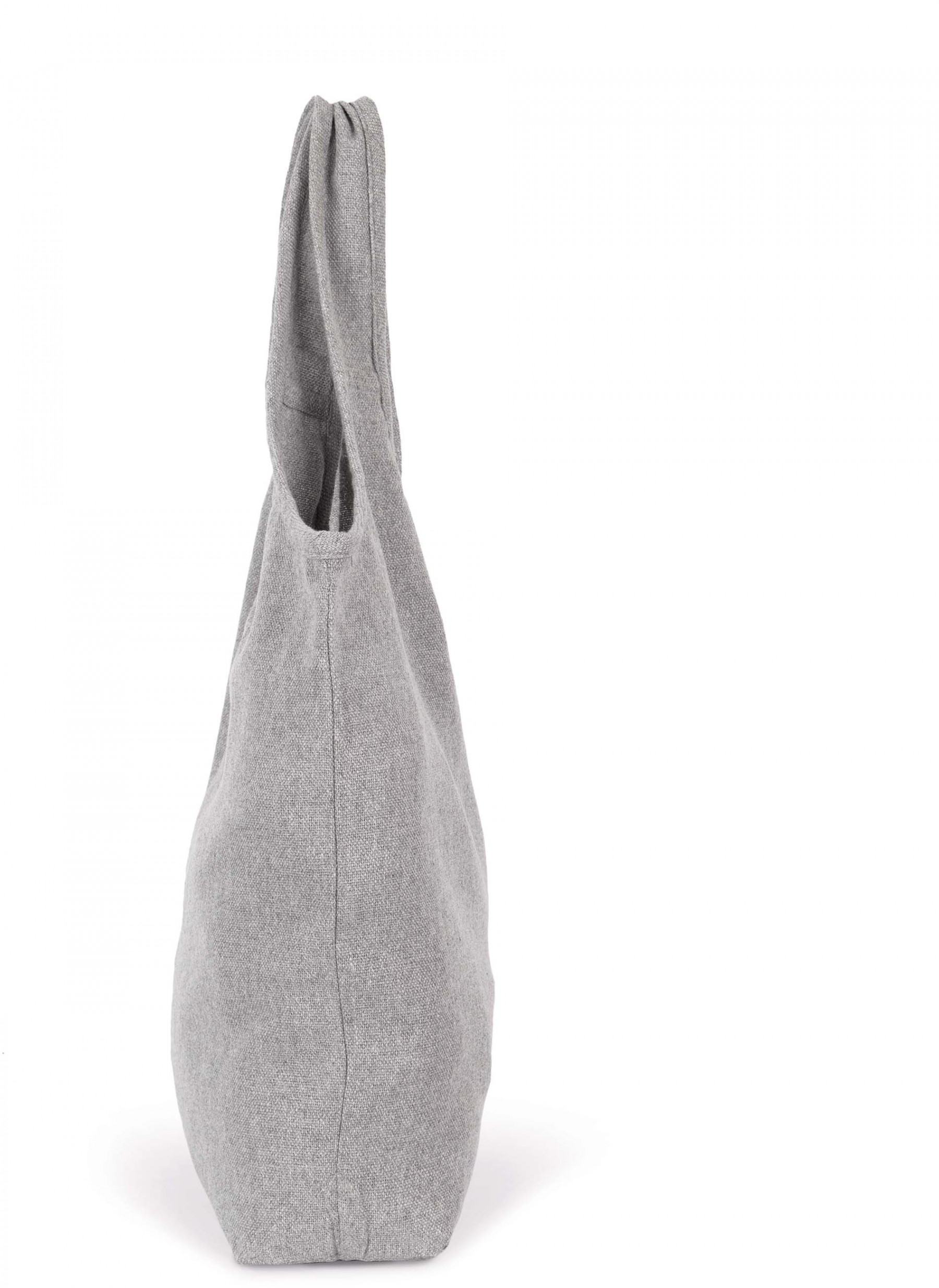 70% coton / 25% polyester/ 5% autres fibres. Sac shopping réalisé à partir de fil de matières recyclées. Le sac est cousu main avec des métiers à tisser traditionnels du Bengladesh, appelé "Tant". Le tissage traditionnel donne un aspect artisanal particulier et unique à la toile. Ce sac s'inscrit dans la collection "Handloom recycled project" issue d'une collaboration entre la marque Kimood et la société HandTouch, membre de ECOTA : Organisation par le commerce equitable au Bengladesh. Cet article contribue à soutenir l'économie des familles vivant dans les villages reculés du Bengladesh, et surtout favorise le travail des femmes évitant ainsi la désertification de ces villages. Les anses cousues tout le long du corps du sac sont fabriquées à partir de la même toile que le sac. A l'intérieur du sac, se trouve une étiquette détaillant le projet et proposant aussi un espace de personnalisation pour apposer logos et/ou messages.