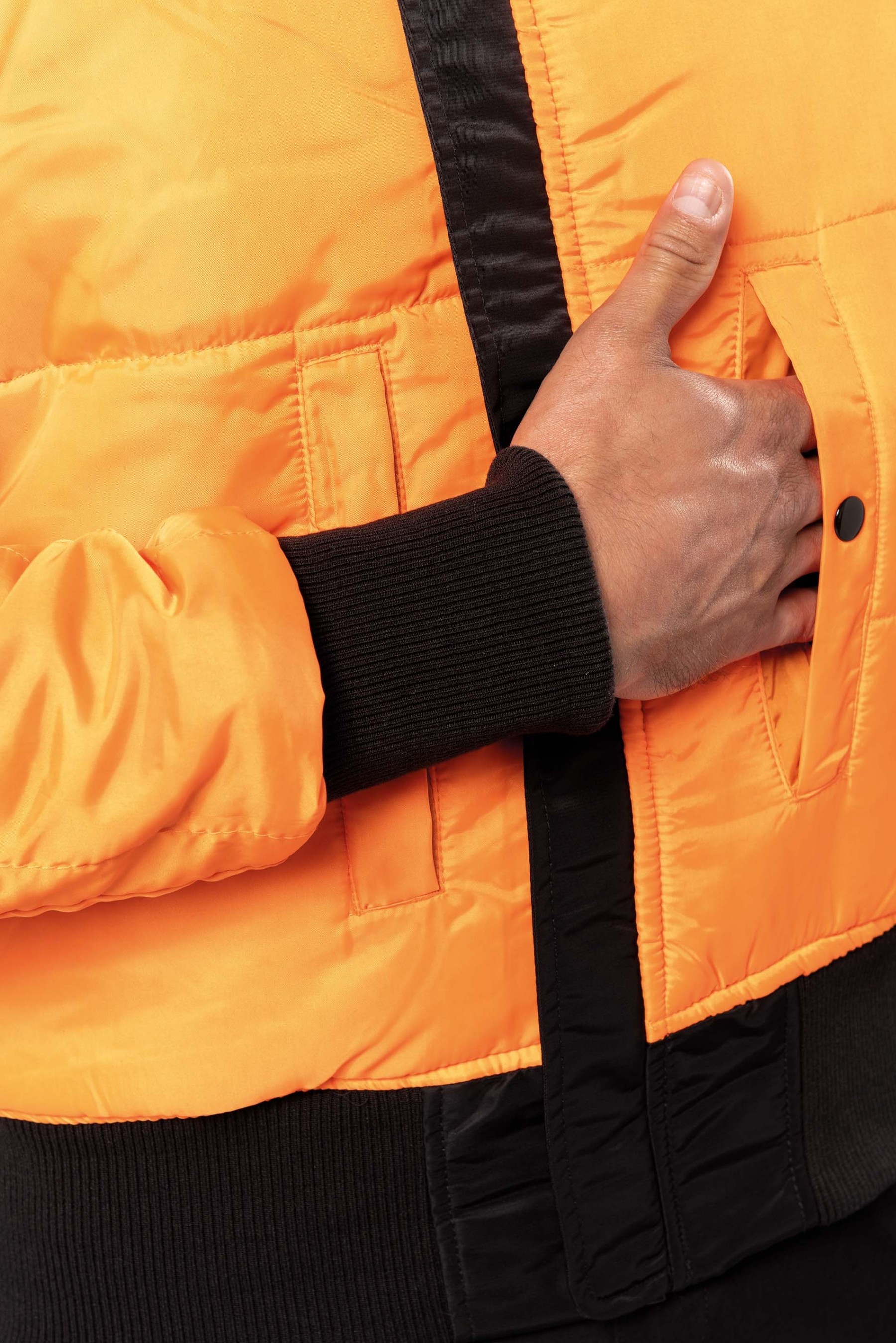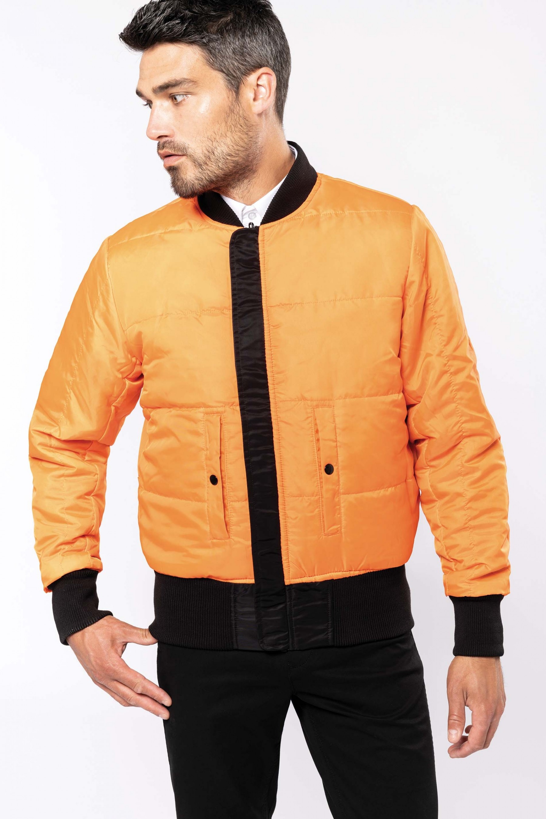 100% polyamide. Garniture intérieure 100% polyester. Doublure contrastée matelassée 100% polyester taffetas. Fermeture zippée avec curseur réversible. 2 poches passepoilées devant avec rabat et bouton pression. Poche plaquée zippée avec emplacement stylo sur la manche gauche. Bord-côte 2x2 au col, bas de manches et de vêtement. Côté réversible (intérieur - coloris orange) : 2 poches côté passepoilées avec bouton pression. 1 zip au bas du vêtement pour accès personnalisation. Pas d'étiquette de marque au col, uniquement une puce de taille autocollante amovible.
