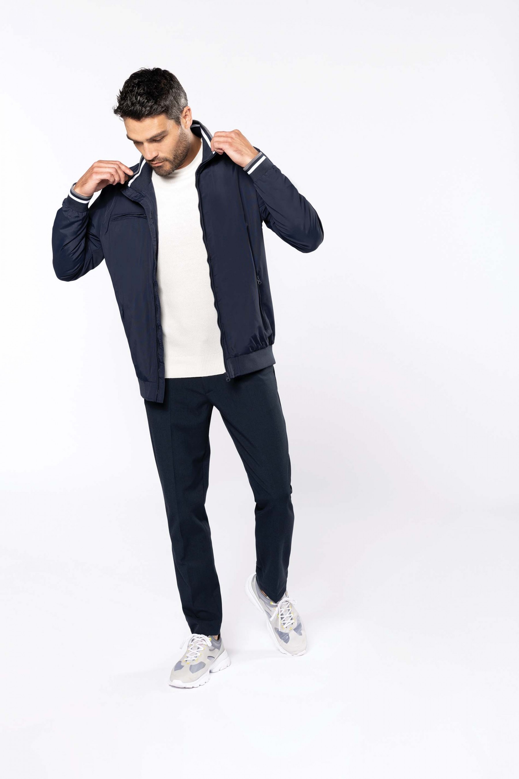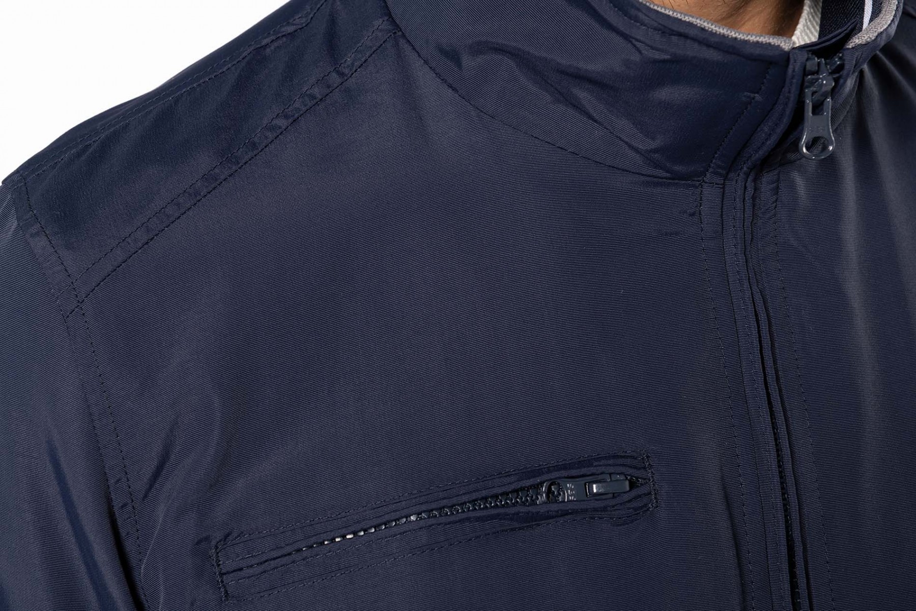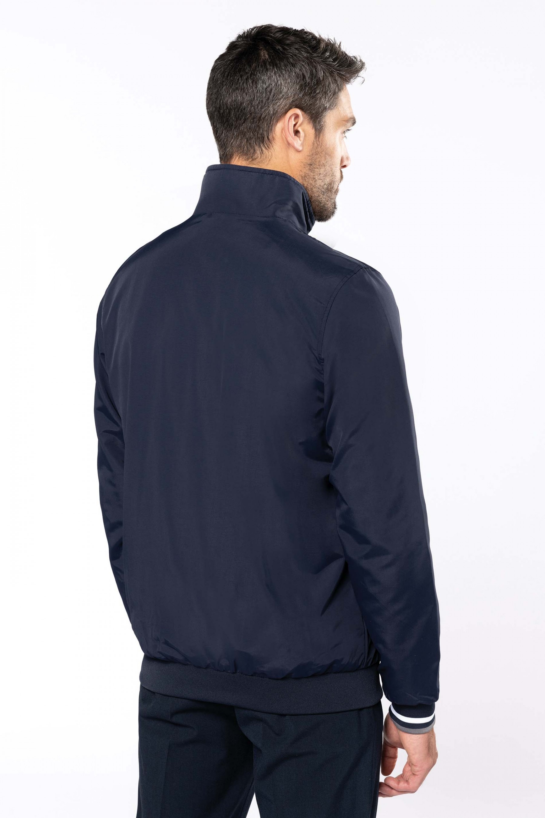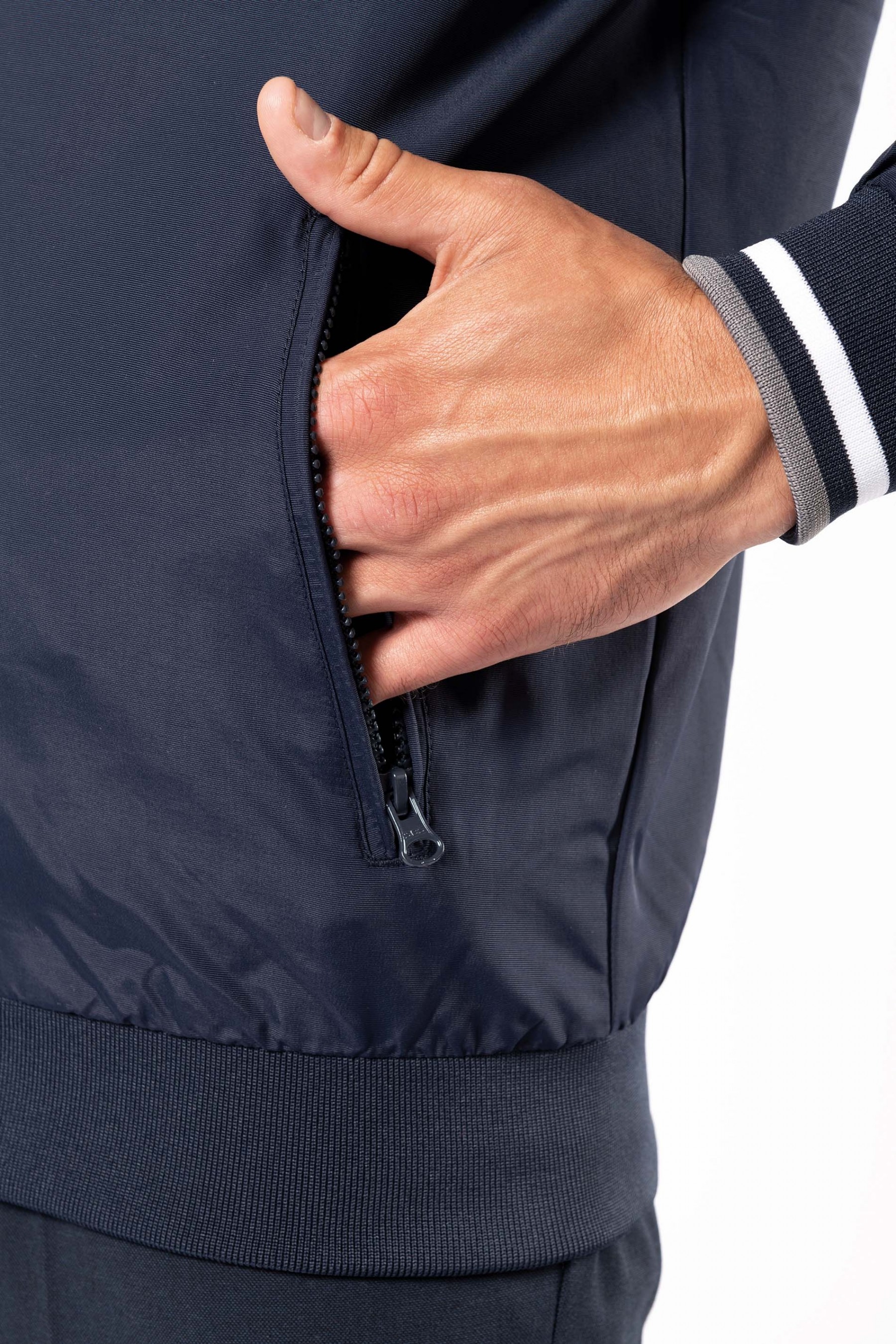 100% polyamide ottoman Taslan. Doublure filet 100% polyester. Tissu résistant et mat. 2 poches zippées devant. 1 poche zippée poitrine. 1 poche intérieure. Intérieur col en bord-côte avec rayures contrastées. Doublure filet. Bas de vêtement en bord-côte uni. Bas de manches en bord-côte avec rayures contrastées. Zip pour la personnalisation.