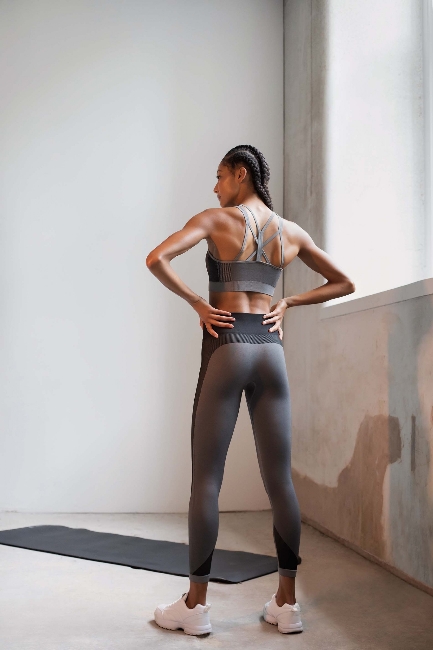61% nylon / 32% polyester / 7% élasthanne. Brassière à empiècement sans coutures. Dos nageur en bretelles croisées. S'accorde avec le legging TL350.