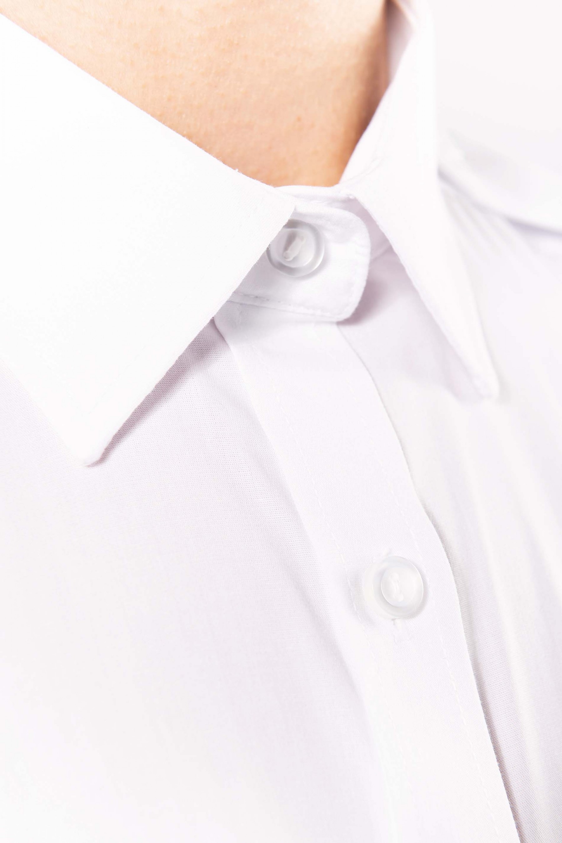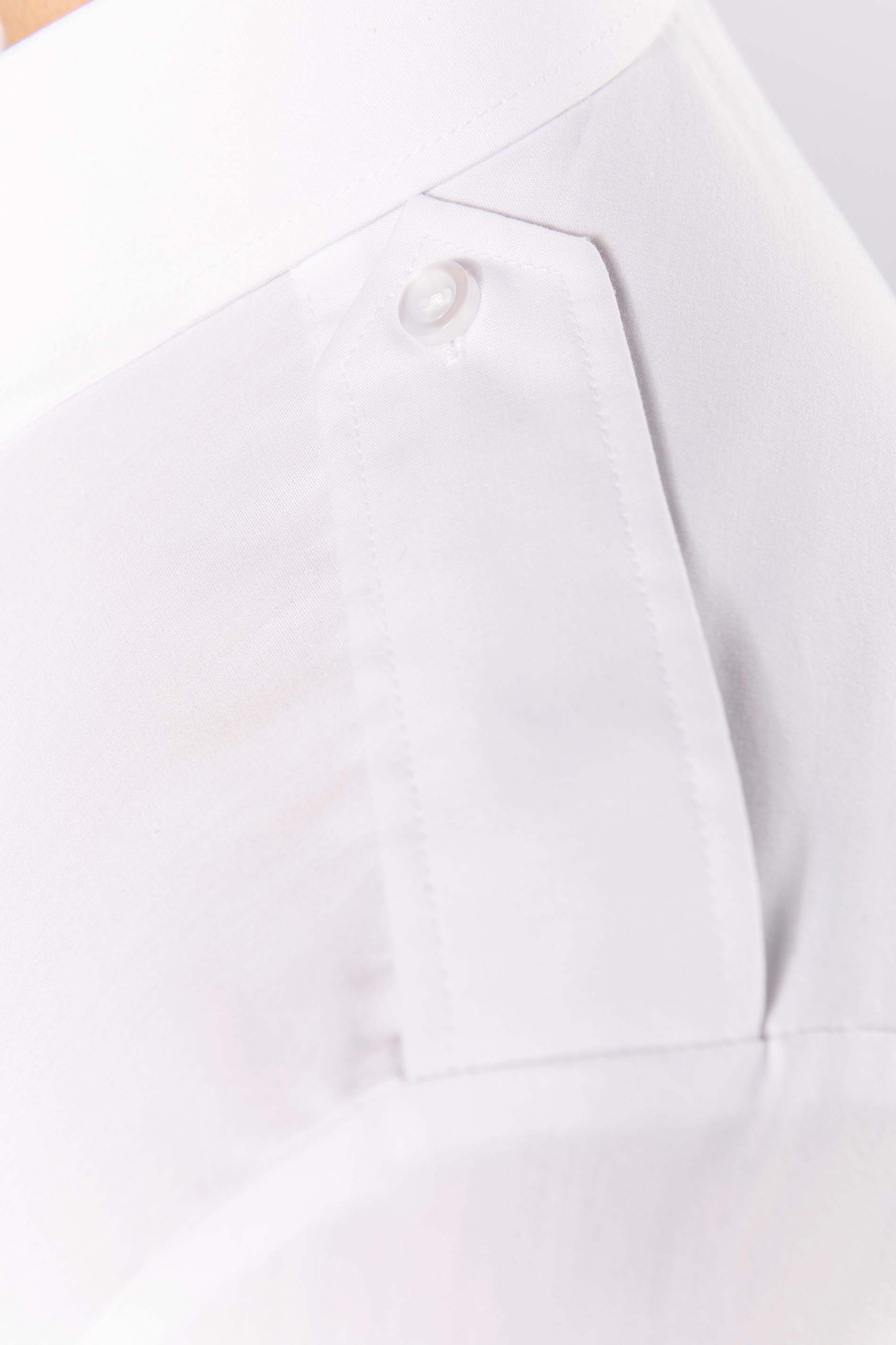 65% polyester / 35% coton. Tissu popeline. Entretien facile (traitement Easy Care). Boutons ton sur ton. 2 poches poitrine à rabat dont une avec emplacement stylo côté coeur. Patte boutonnée sur les épaules pour la pose de galons (galons non fournis). Poignets boutonnés réglables.