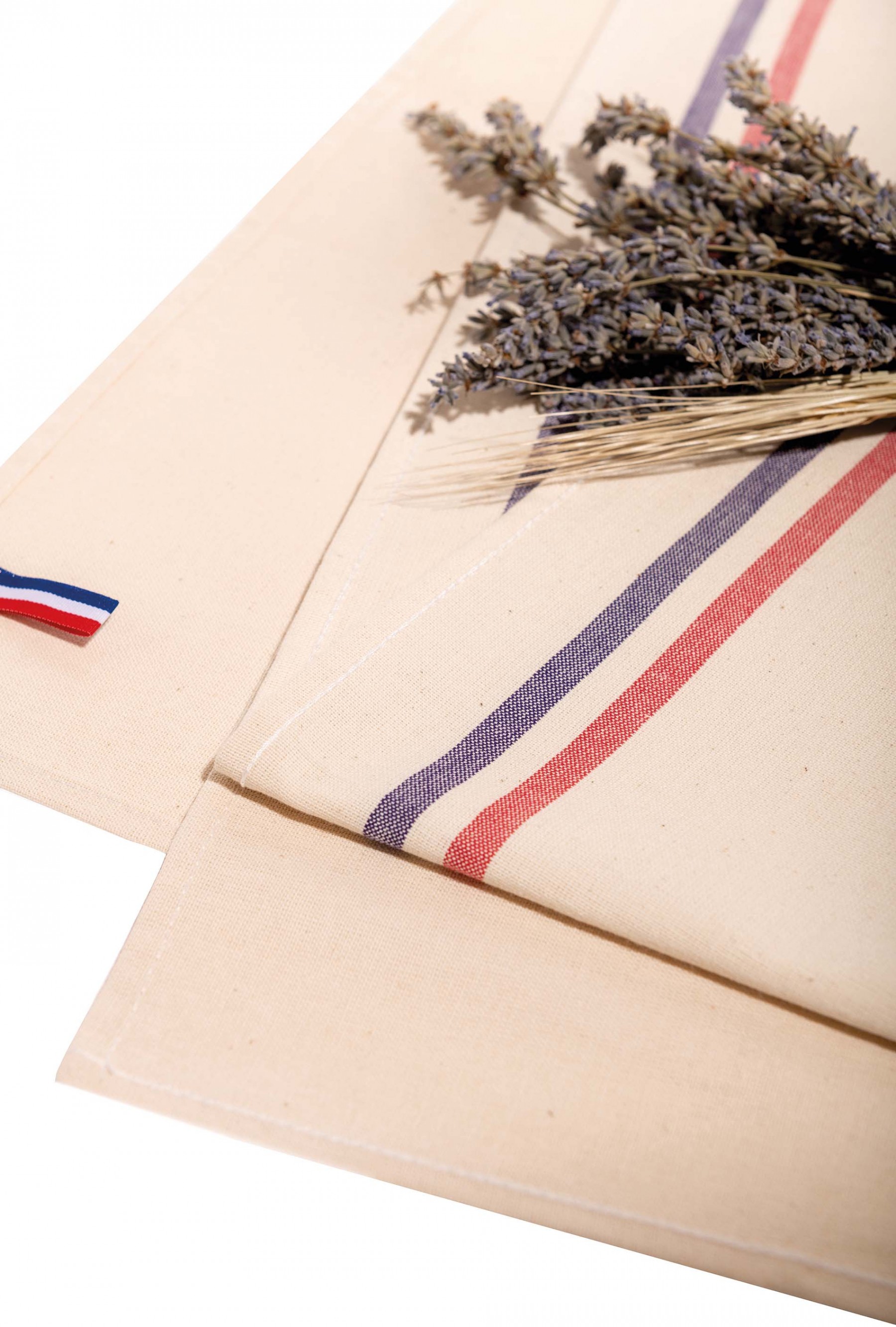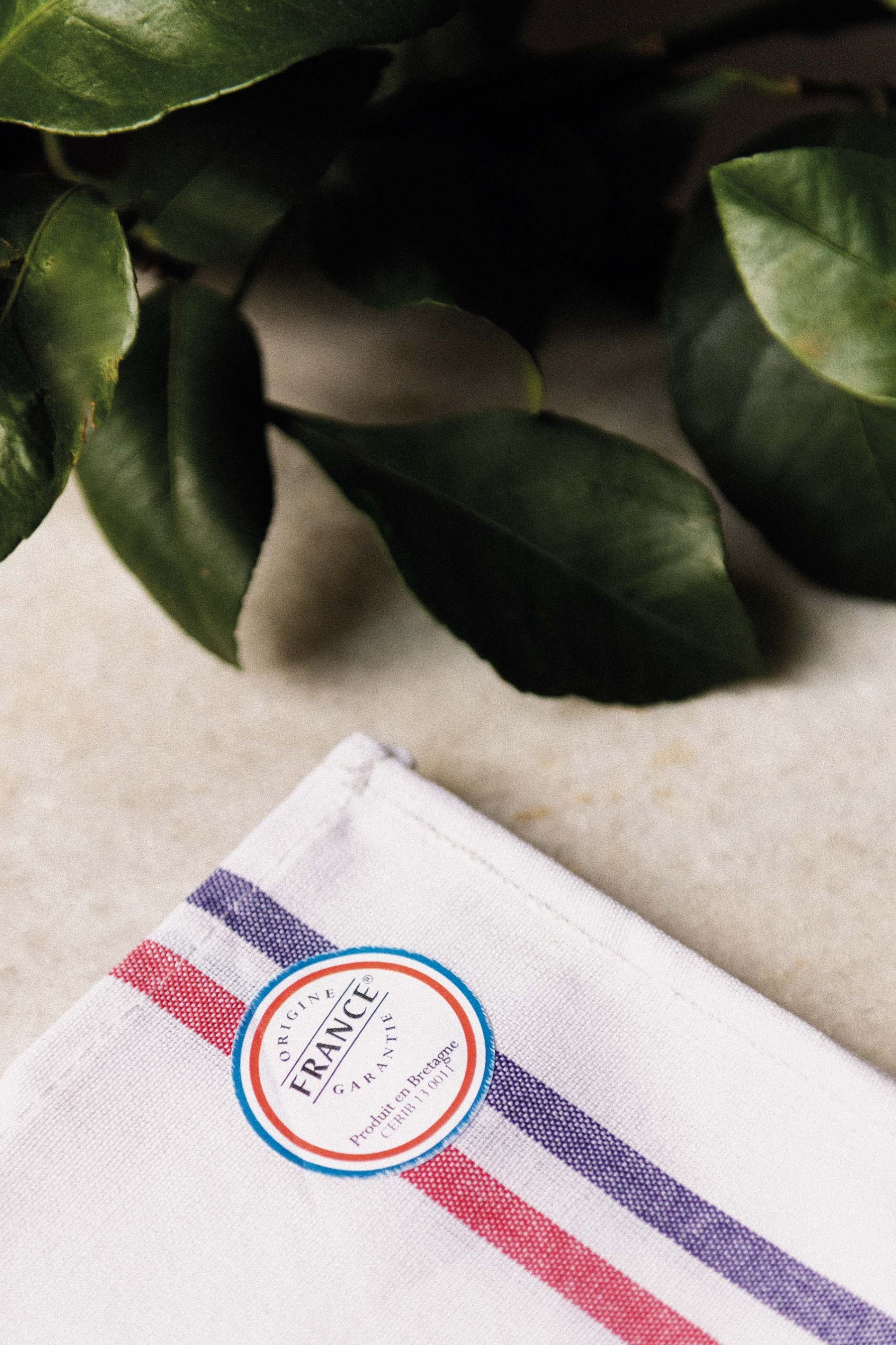 100% coton. Toile de coton. 2 rayures de chaque côté. Étiquette tricolore servant de lien d'accrochage. Label "Origine France Garantie - Produit en Bretagne". Recommandation pour un essuyage parfait : laissez tremper 12 h dans l'eau froide, puis lavez 2 à 3 fois à température recommandée.