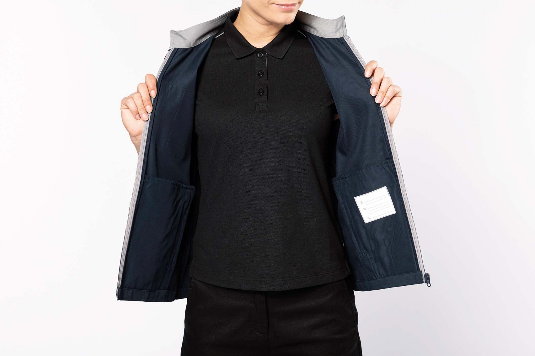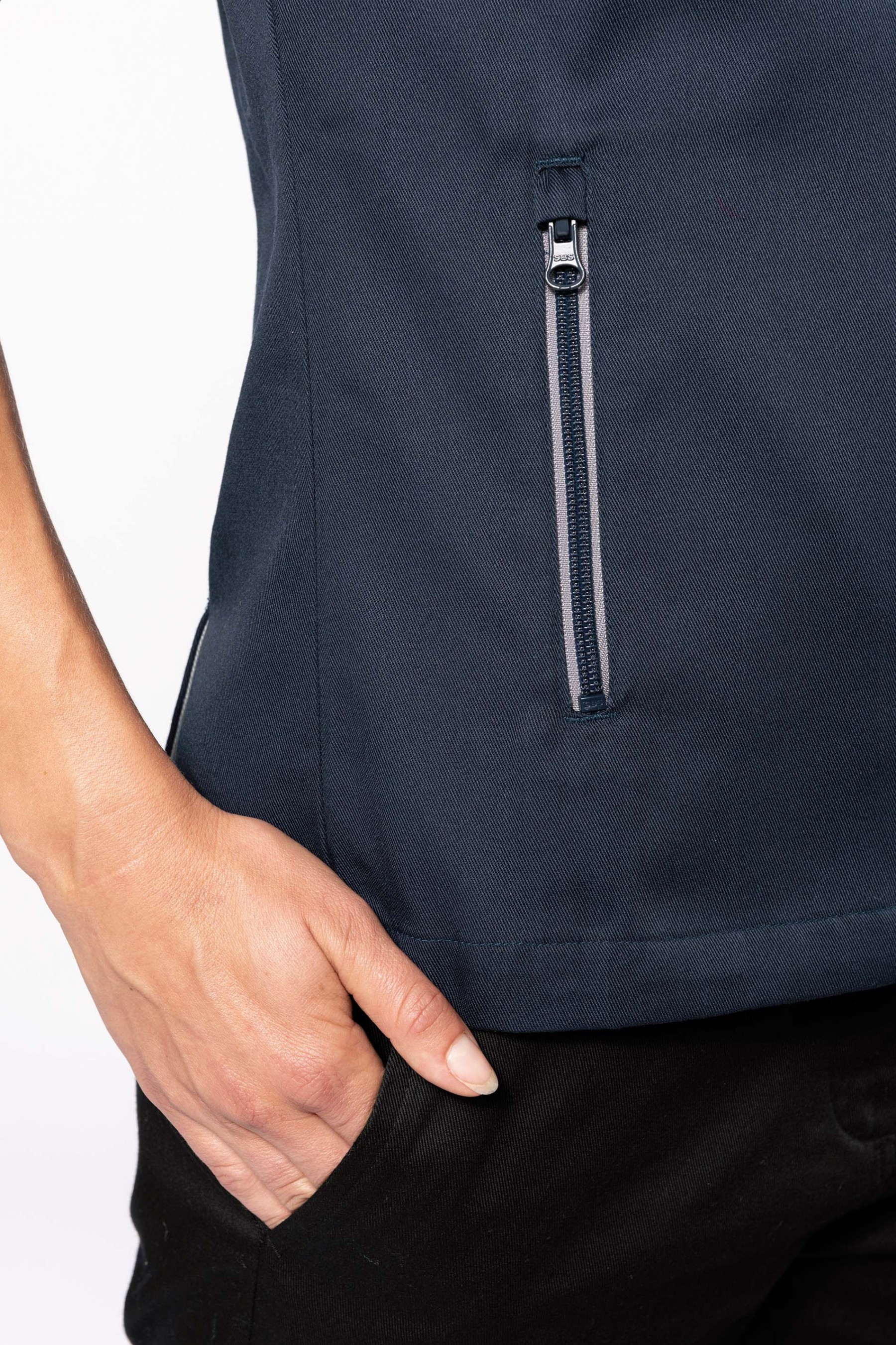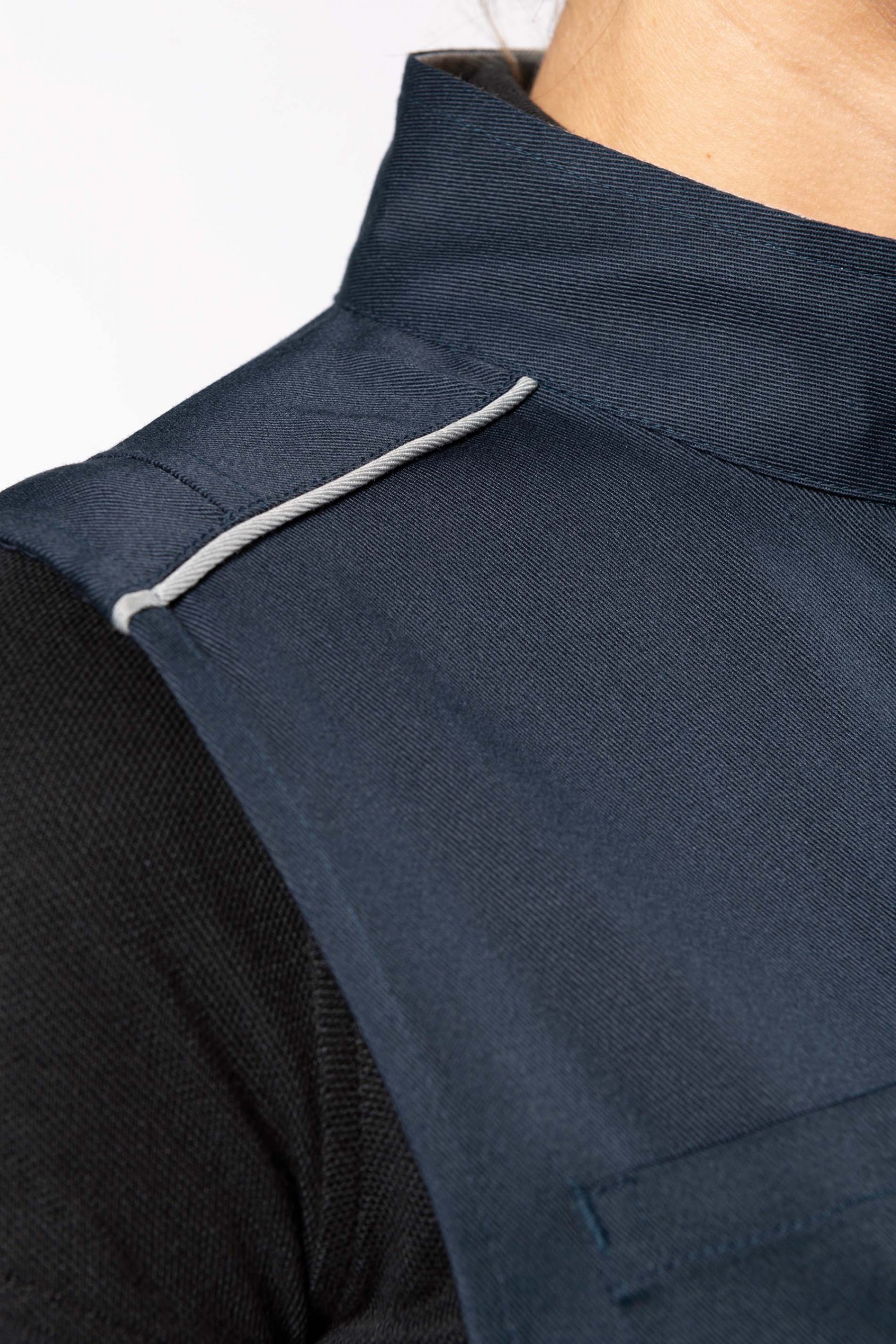 65% polyester / 35% coton. Lavable 60°. 2 poches zippées côtés. 1 poche poitrine ouverte à droite avec porte-stylo. 1 étiquette nom à l'intérieur. Fermeture zippée avant et poches contrastée. Passepoil contrasté sur épaules. Intérieur du col contrasté avec lien d'accrochage. 2 fentes d'aisance au dos. Idéal pour une utilisation quotidienne.