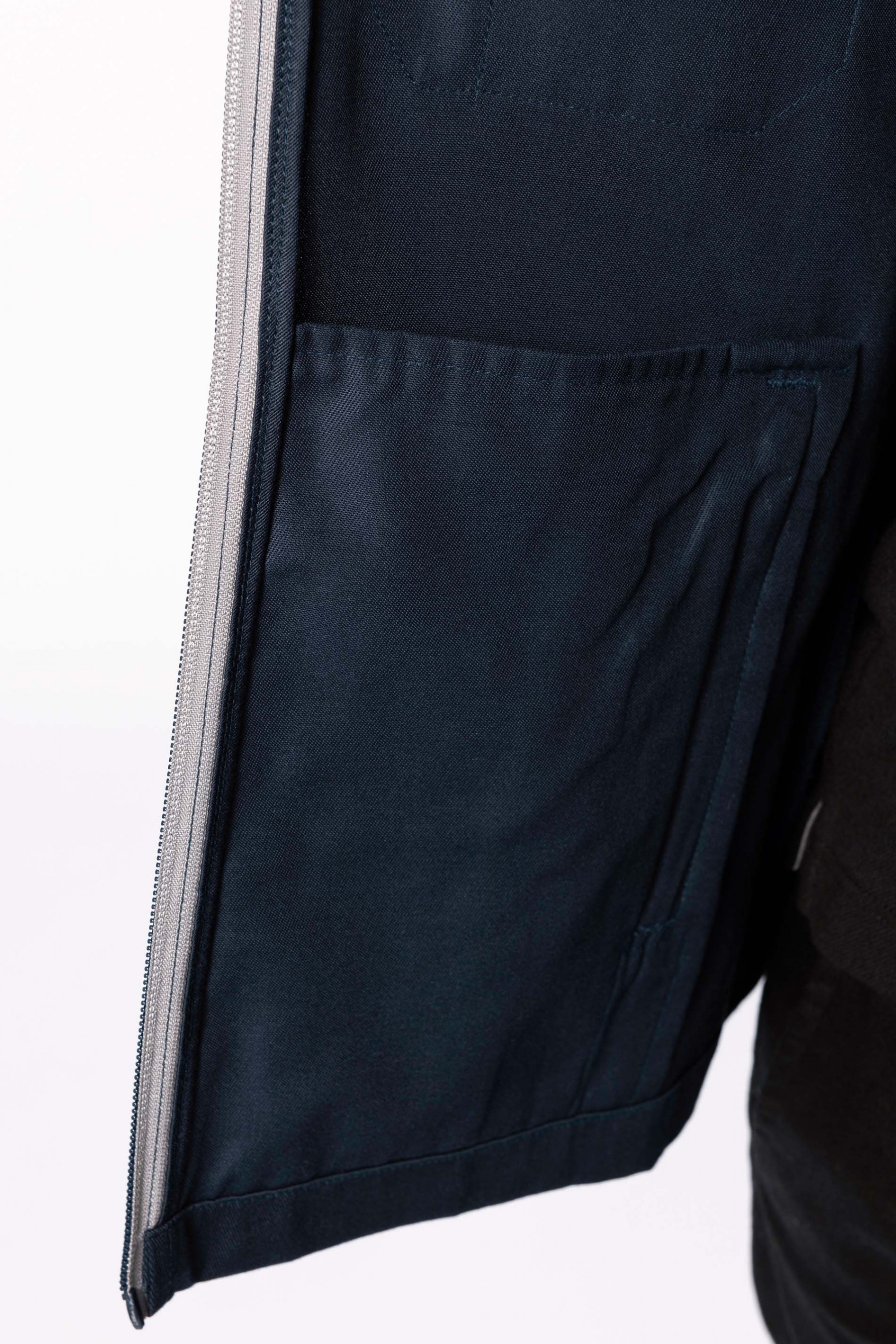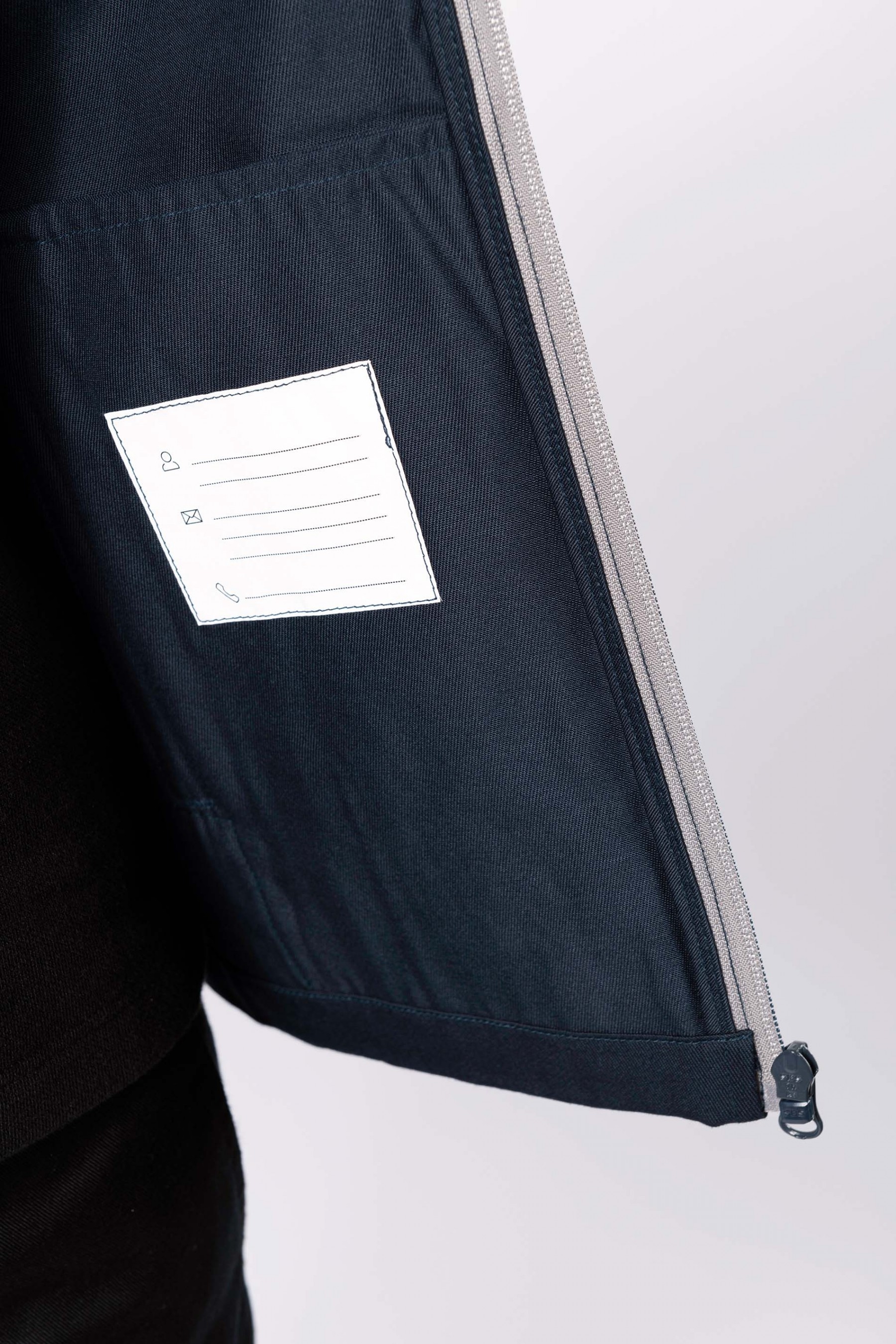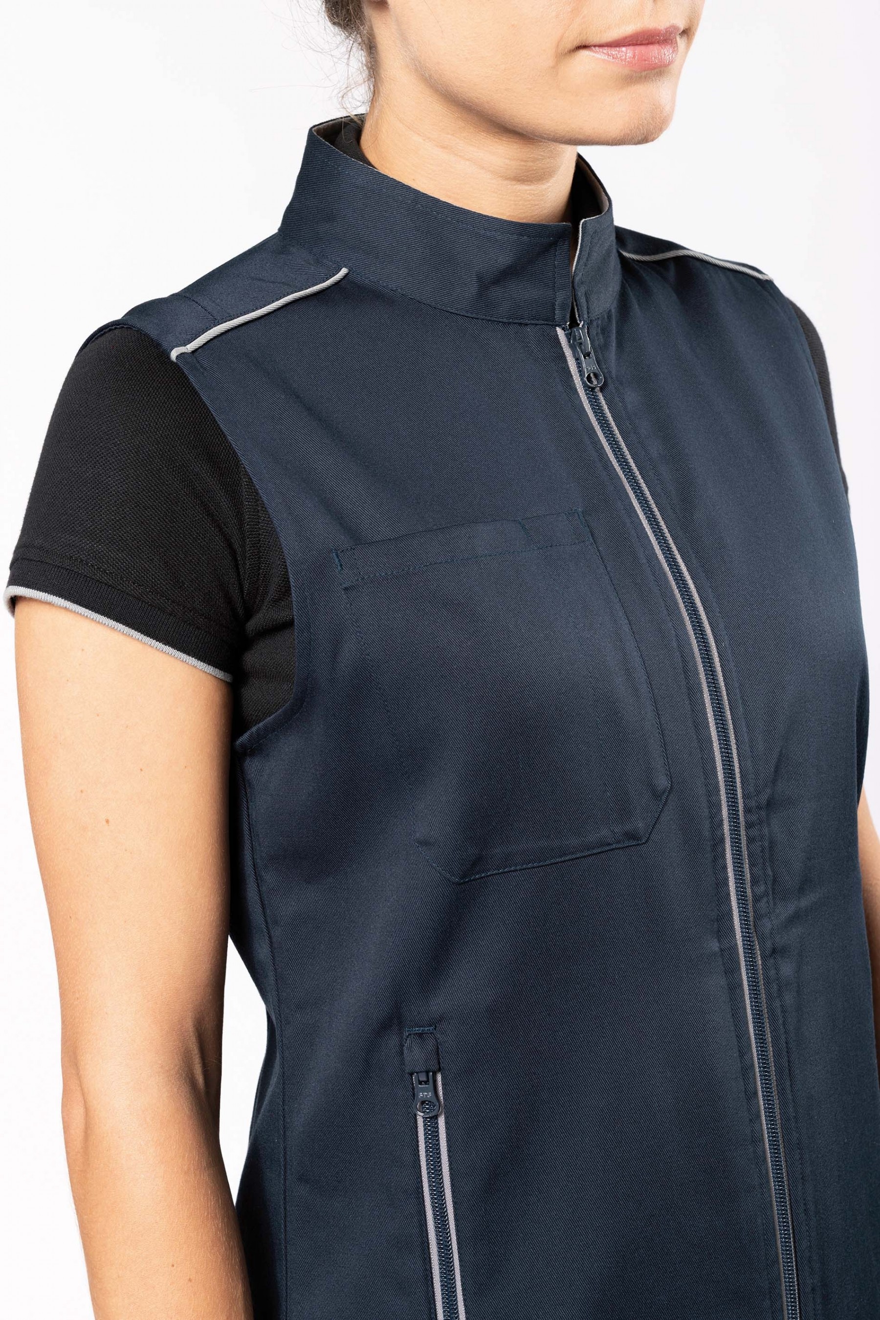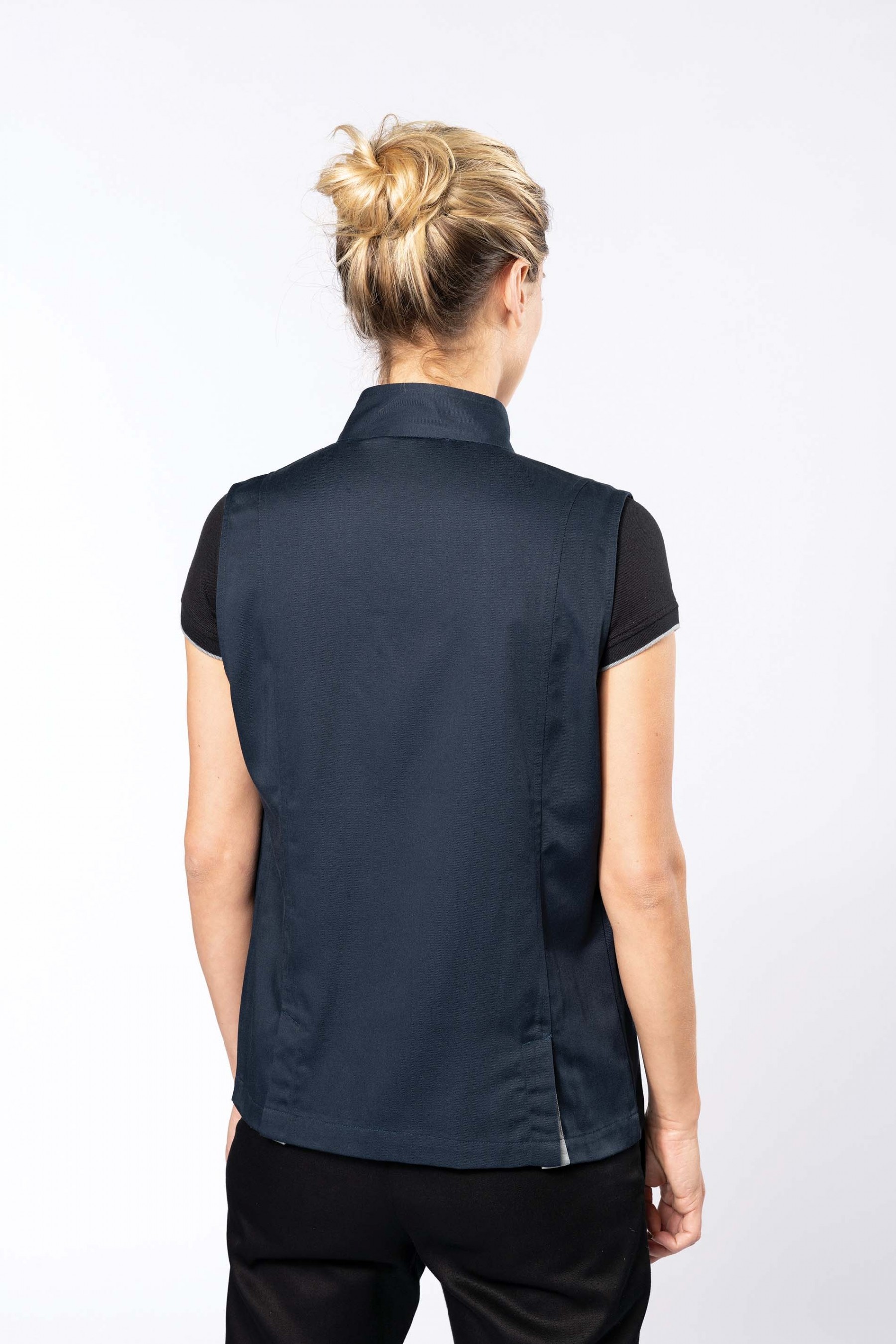 65% polyester / 35% coton. Lavable 60°. 2 poches zippées côtés. 1 poche poitrine ouverte à droite avec porte-stylo. 1 étiquette nom à l'intérieur. Fermeture zippée avant et poches contrastée. Passepoil contrasté sur épaules. Intérieur du col contrasté avec lien d'accrochage. 2 fentes d'aisance au dos. Idéal pour une utilisation quotidienne.