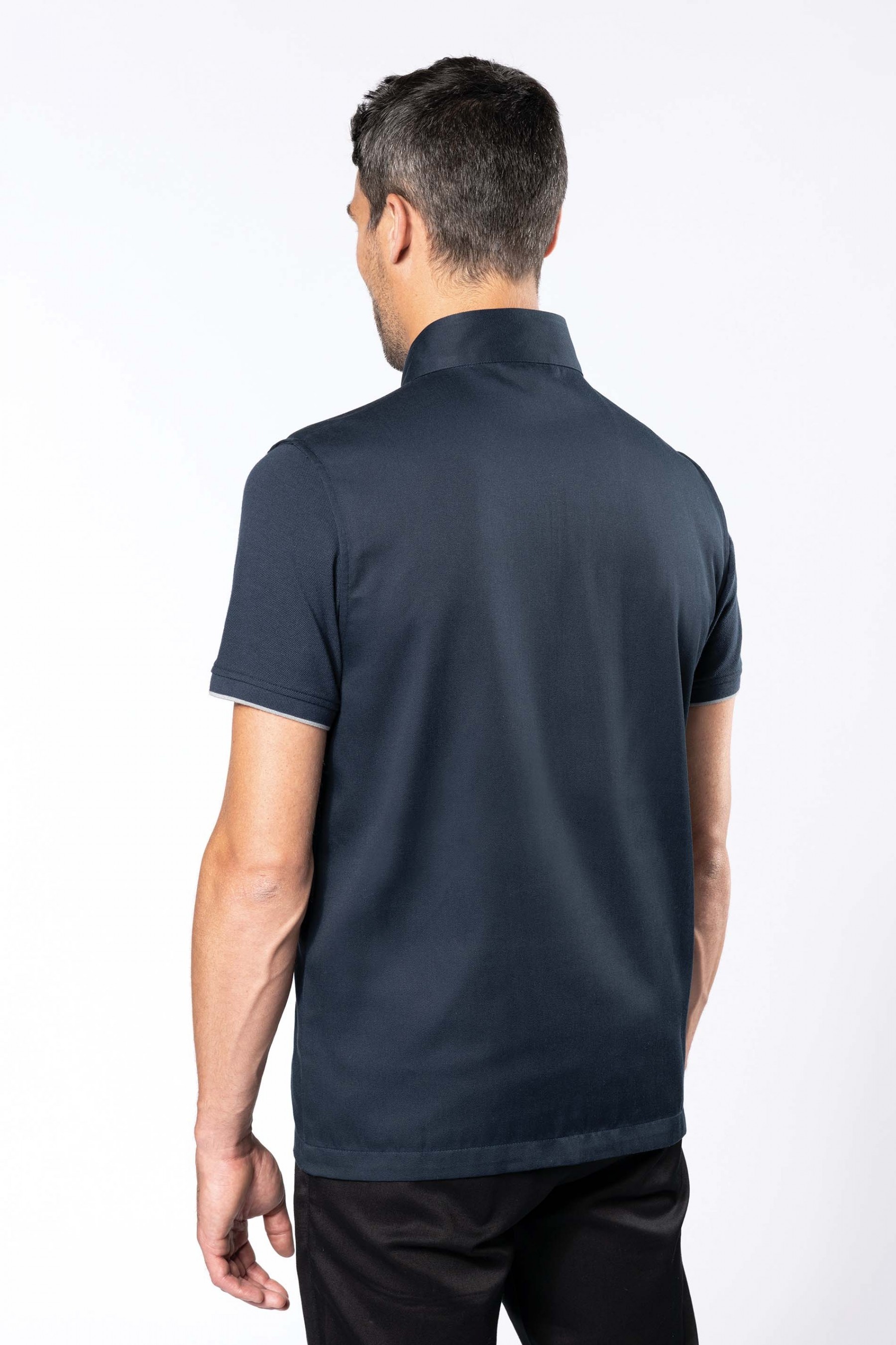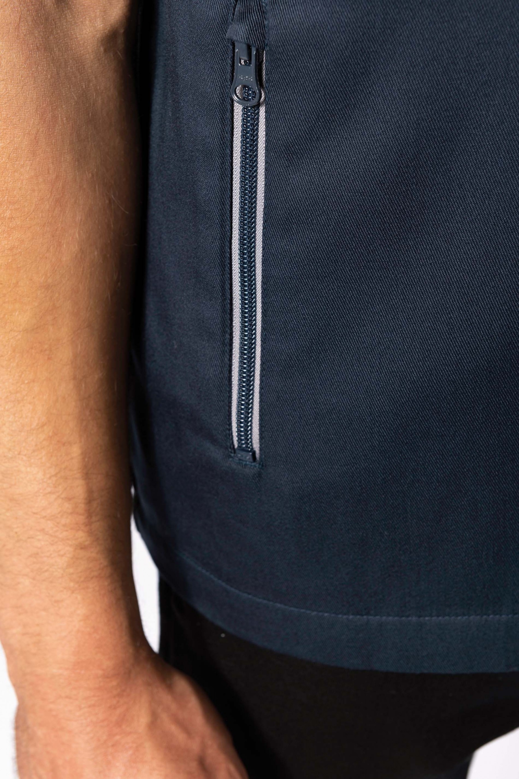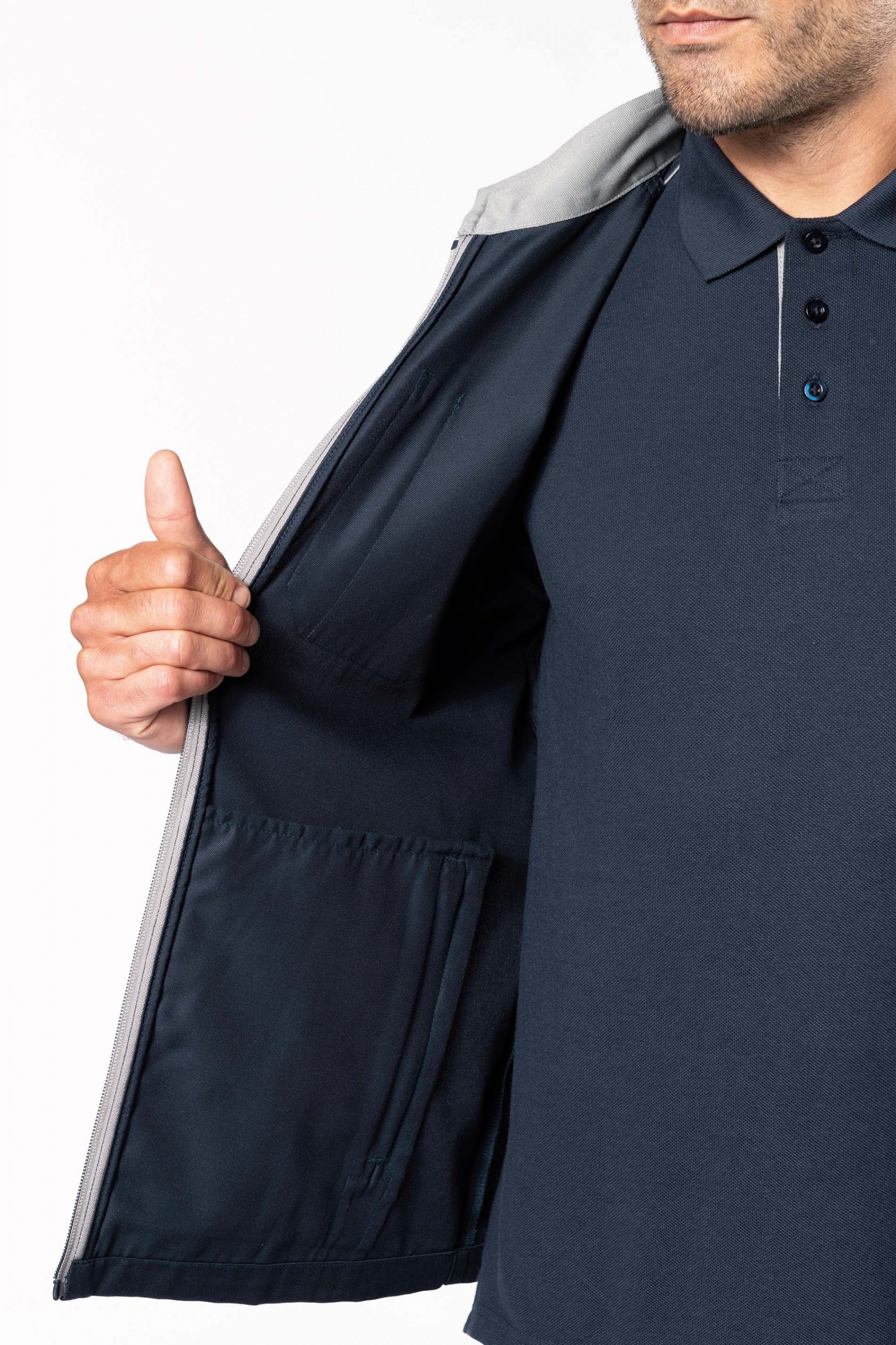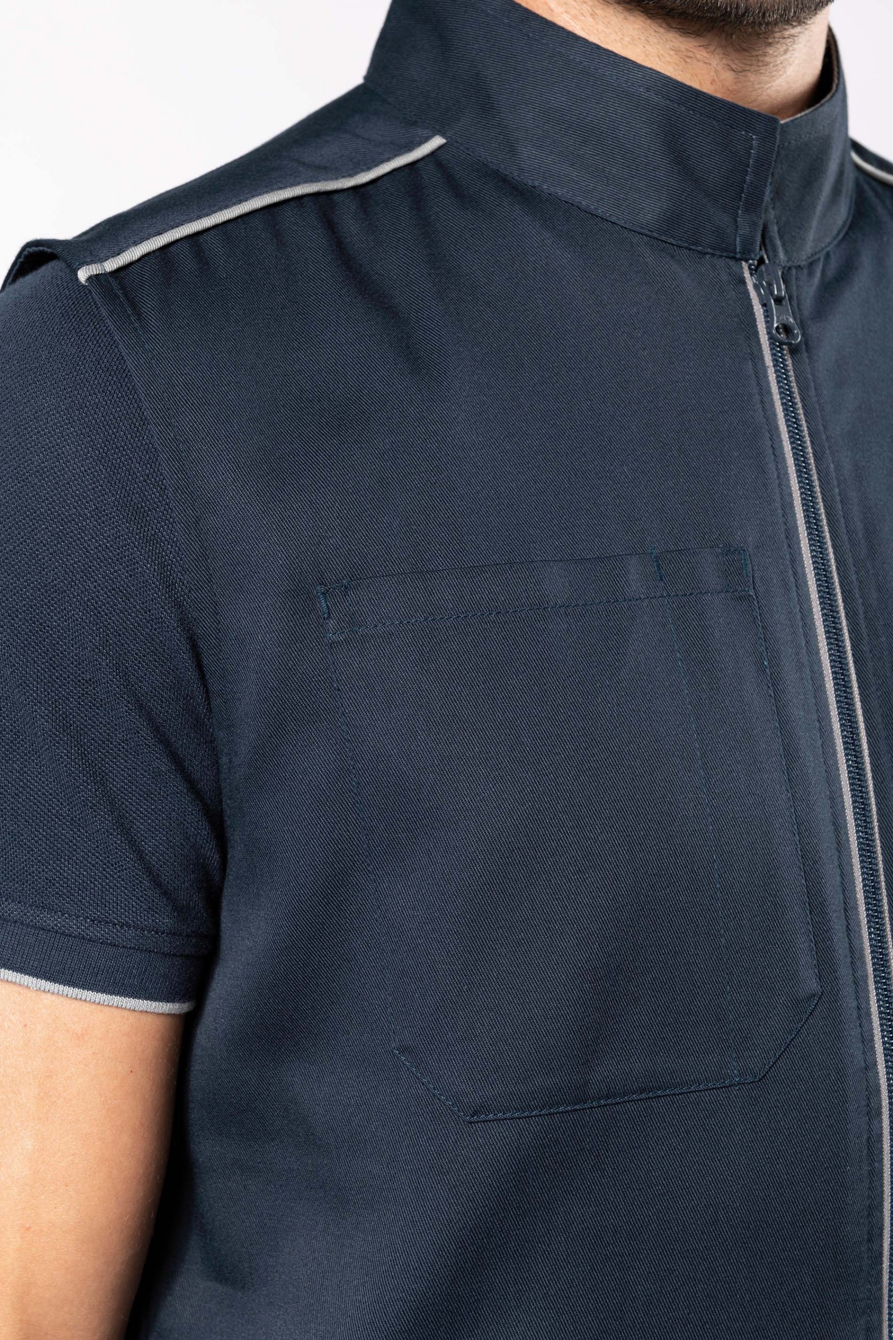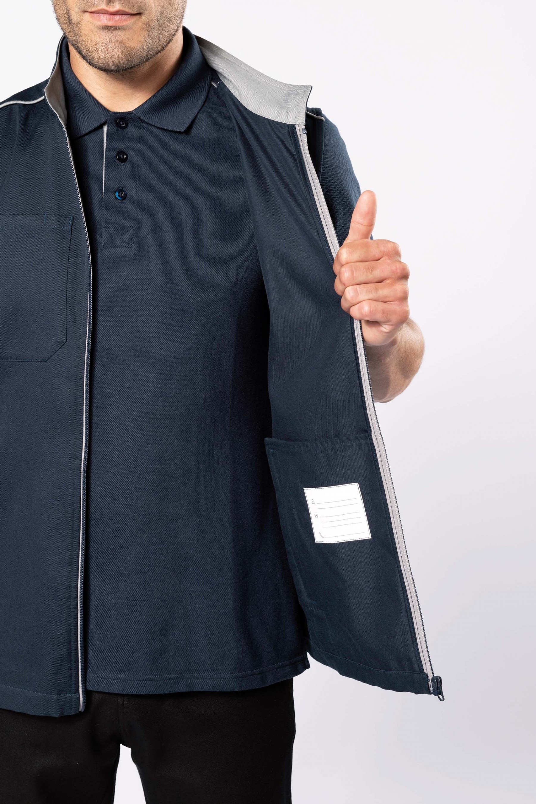 65% polyester / 35% coton. Lavable 60°. 2 poches zippées côtés. 1 poche poitrine ouverte à droite avec porte-stylo. 1 étiquette nom à l'intérieur. Fermeture zippée avant et poches contrastée. Passepoil contrasté sur épaules. Intérieur col contrasté avec lien d'accrochage. Idéal pour une utilisation quotidienne.