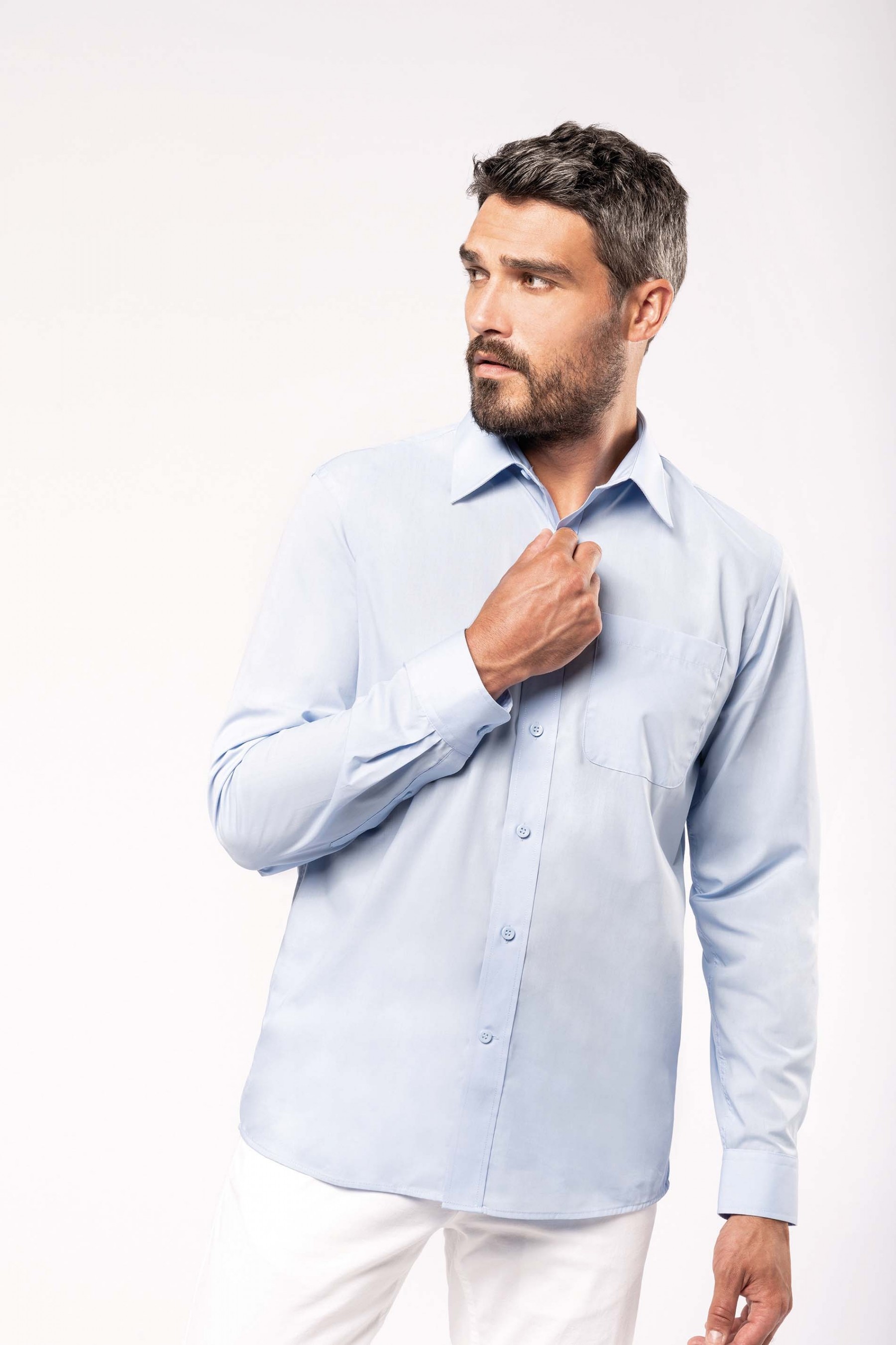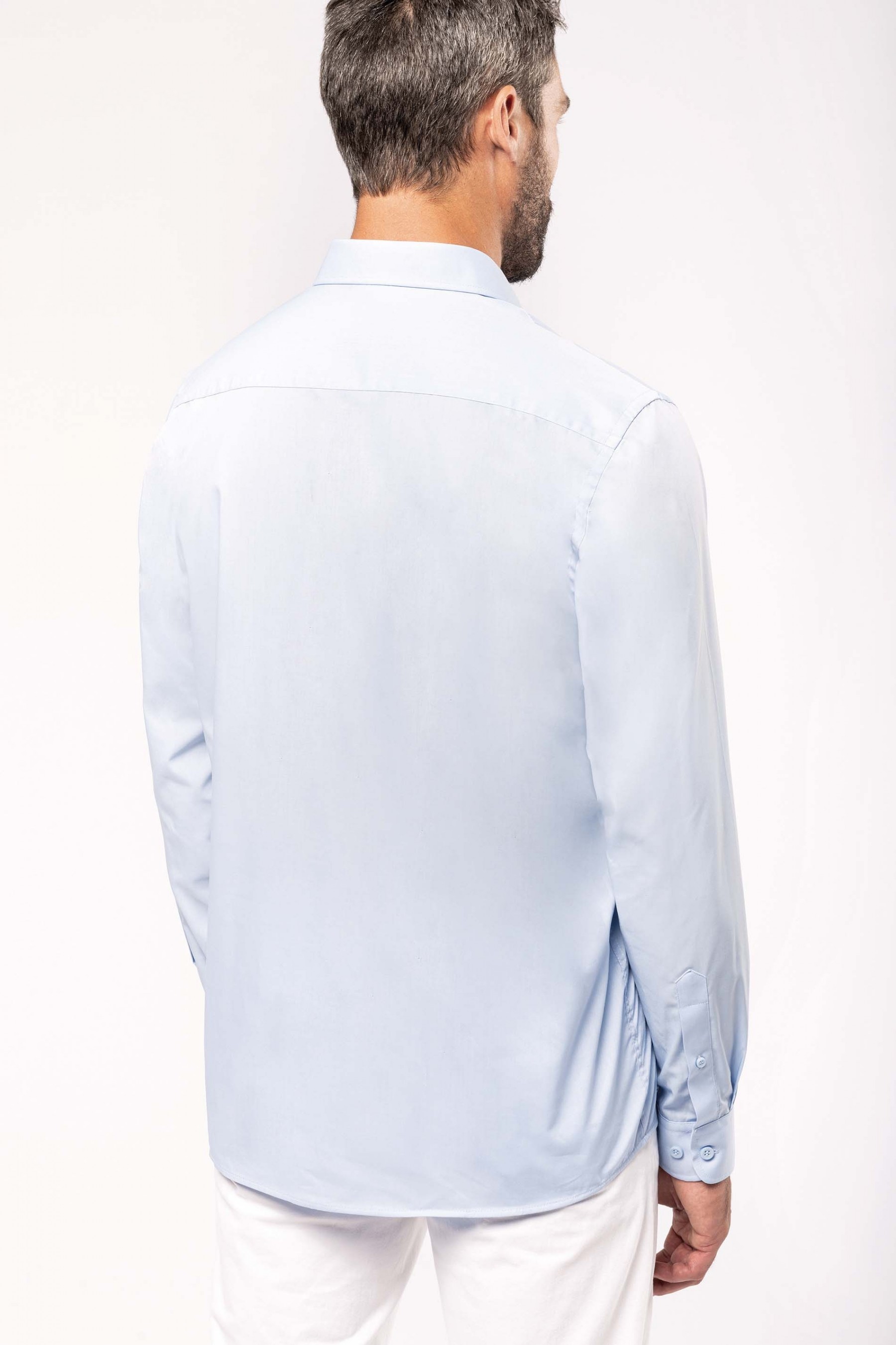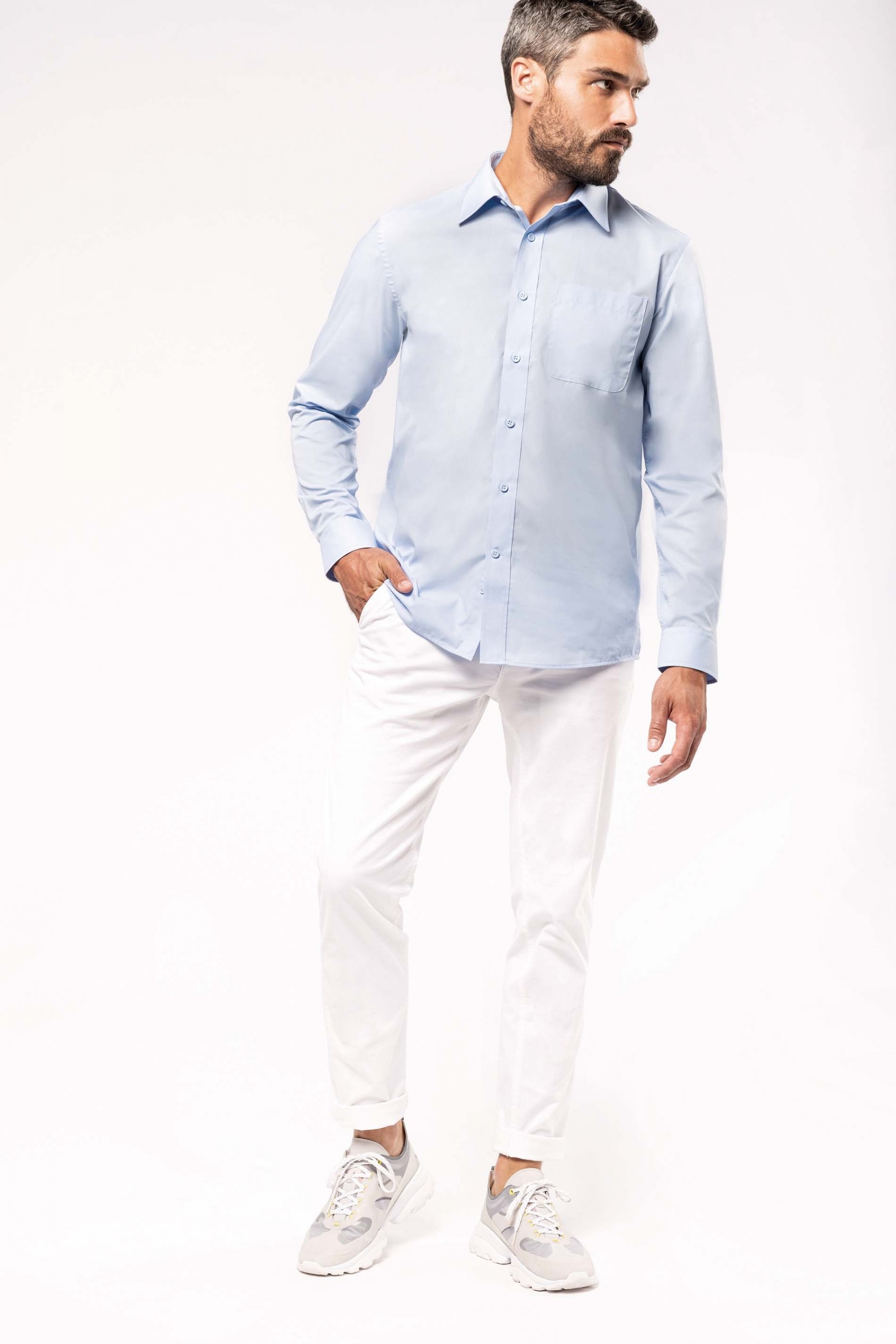 65% polyester / 35% coton. Tissu popeline. Entretien facile. Pointe de col baleinée. Boutons ton sur ton. Poche côté gauche poitrine à angles arrondis. Empiècement dos double. Finition coutures rabattues. Poignet réglable à angles arrondis avec patte de manche capucin boutonnée. 2 boutons de rappel.