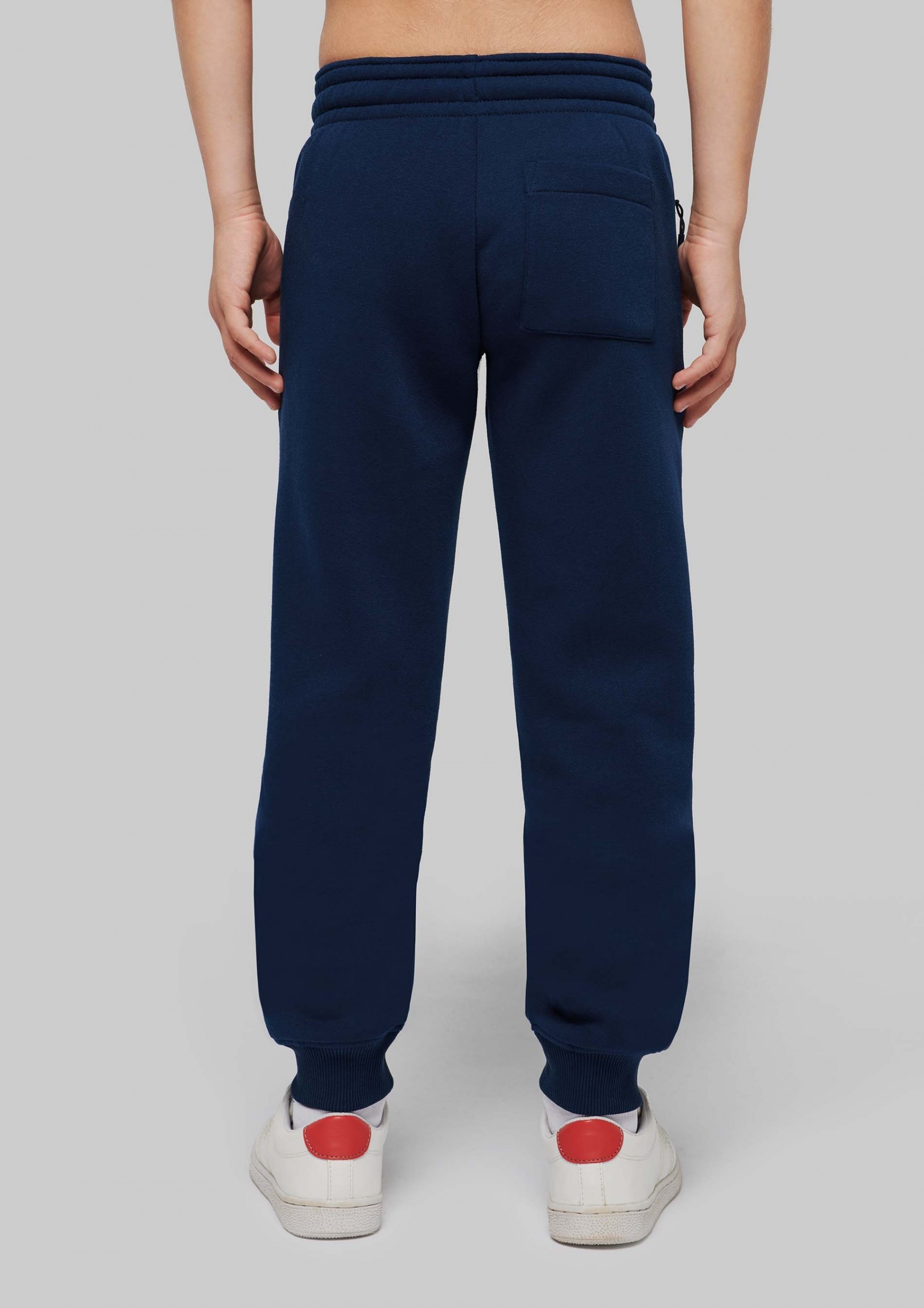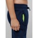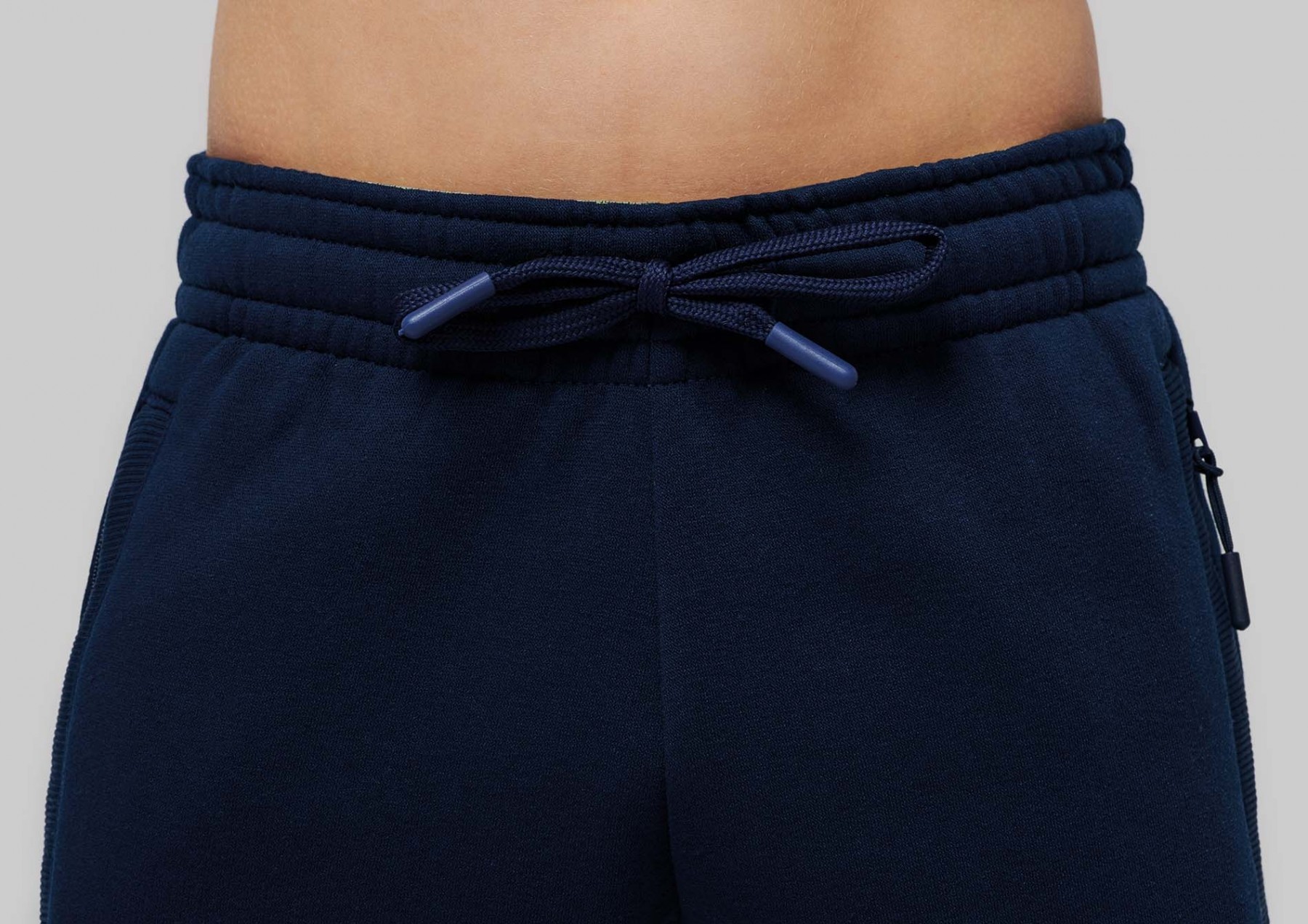 65% polyester / 35% coton. Molleton gratté. Ceinture élastiquée avec cordon de serrage ton sur ton. Pour plus de confort, finition intérieur taille par bande élastique au touché doux, contrastée avec liseré fluorescent. 2 poches côtés fantaisie avec fermeture à glissière, sac de poche en maille filet et une poche téléphone contrastée fluorescente. 1 poche plaquée arrière. Bas de jambe resserré par un bord-côte 2 x 2.