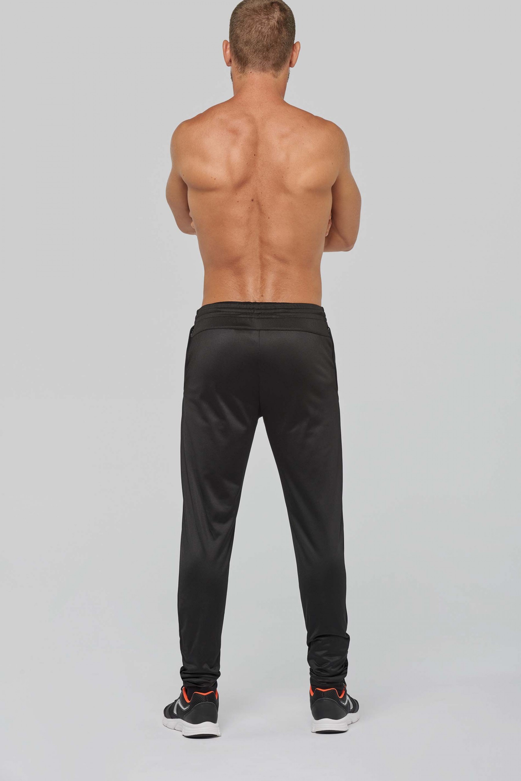 100% polyester tricot. Empiècement dos en mesh pour une meilleure ventilation. 2 poches côtés zippées. Ceinture élastiquée avec cordon de serrage. Bas de jambe zippé. Coupe ajustée moderne.