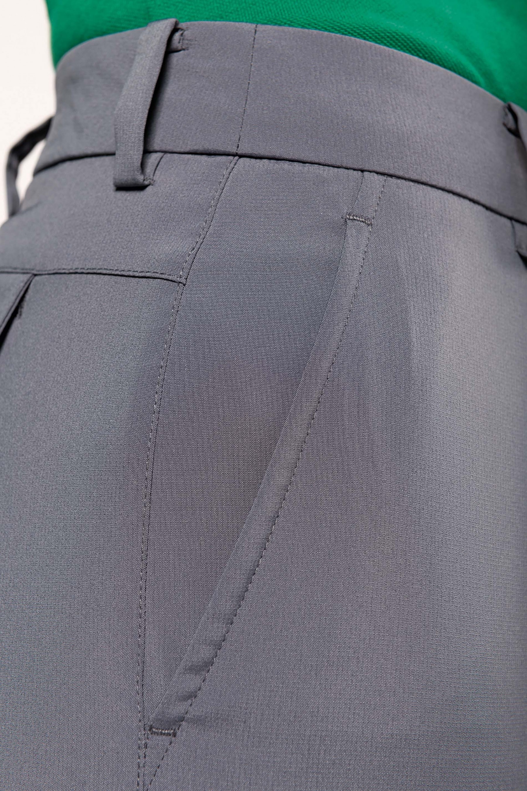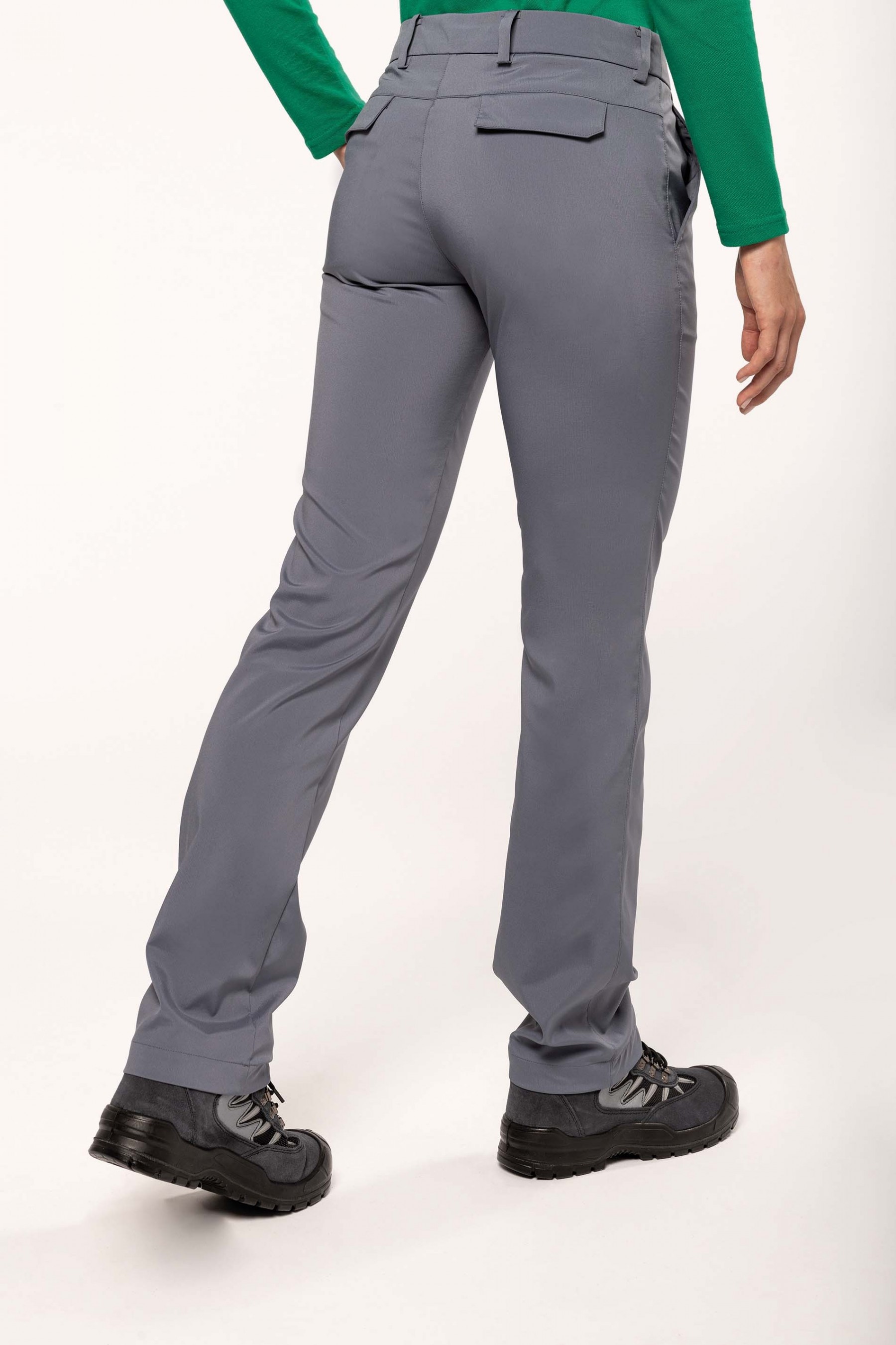 96% polyester / 4% élasthanne. Matière souple et déperlante pour un confort optimal. Coupe élégante et ajustée. Ceinture avec passants, 2 poches profondes côtés et 2 poches arrière passepoilées avec rabat.