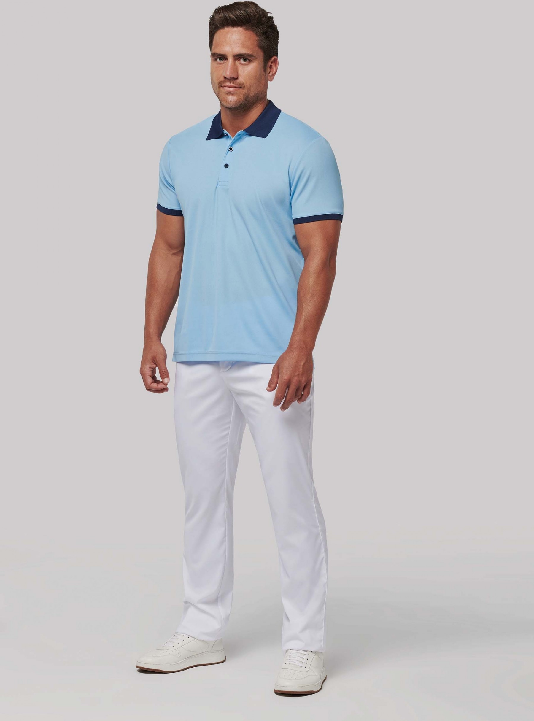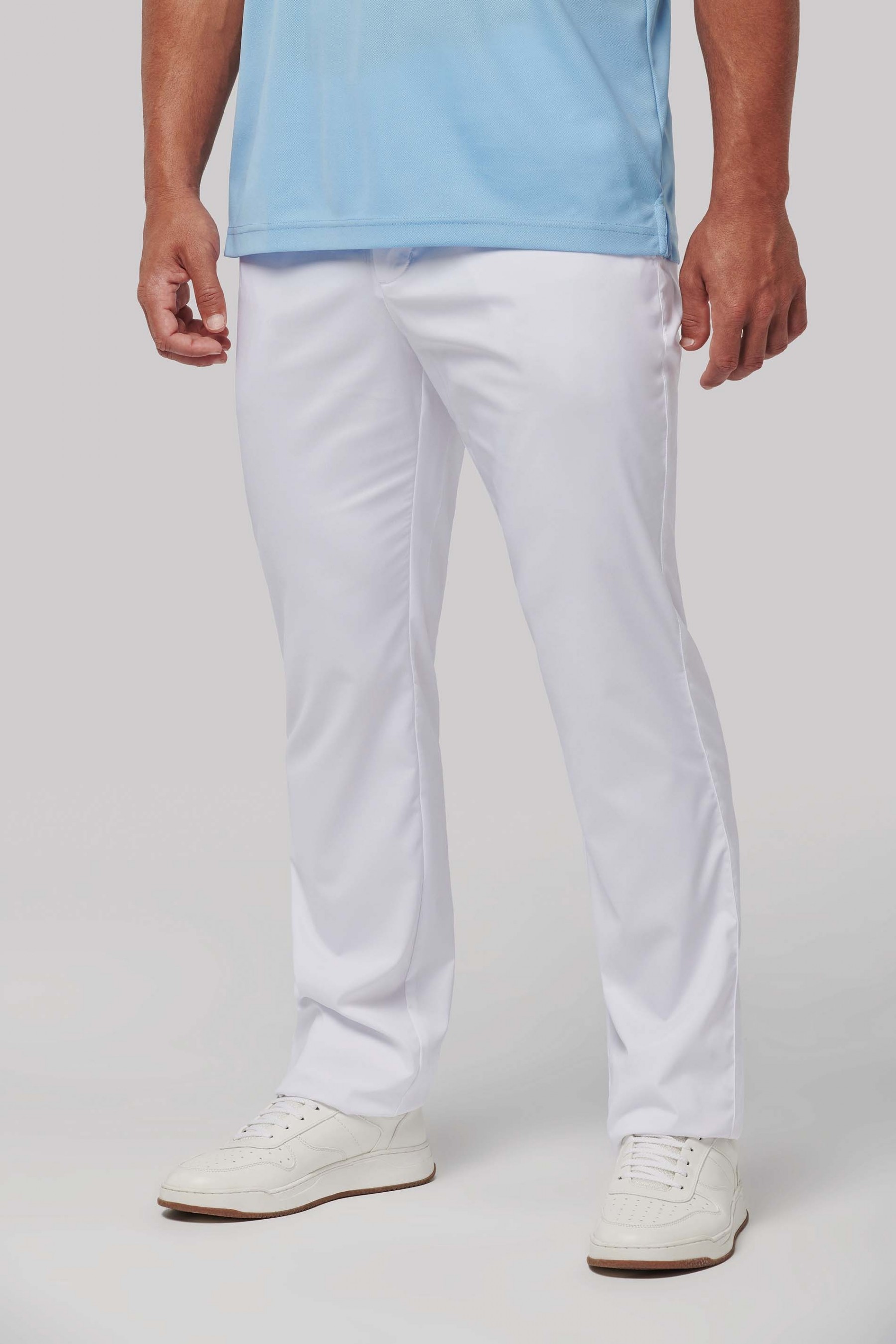 96% polyester / 4% élasthanne. Matière souple et déperlante pour un confort optimal. Coupe ajustée. Ceinture avec passants, 2 poches profondes côtés et 2 poches arrière passepoilées avec rabat.