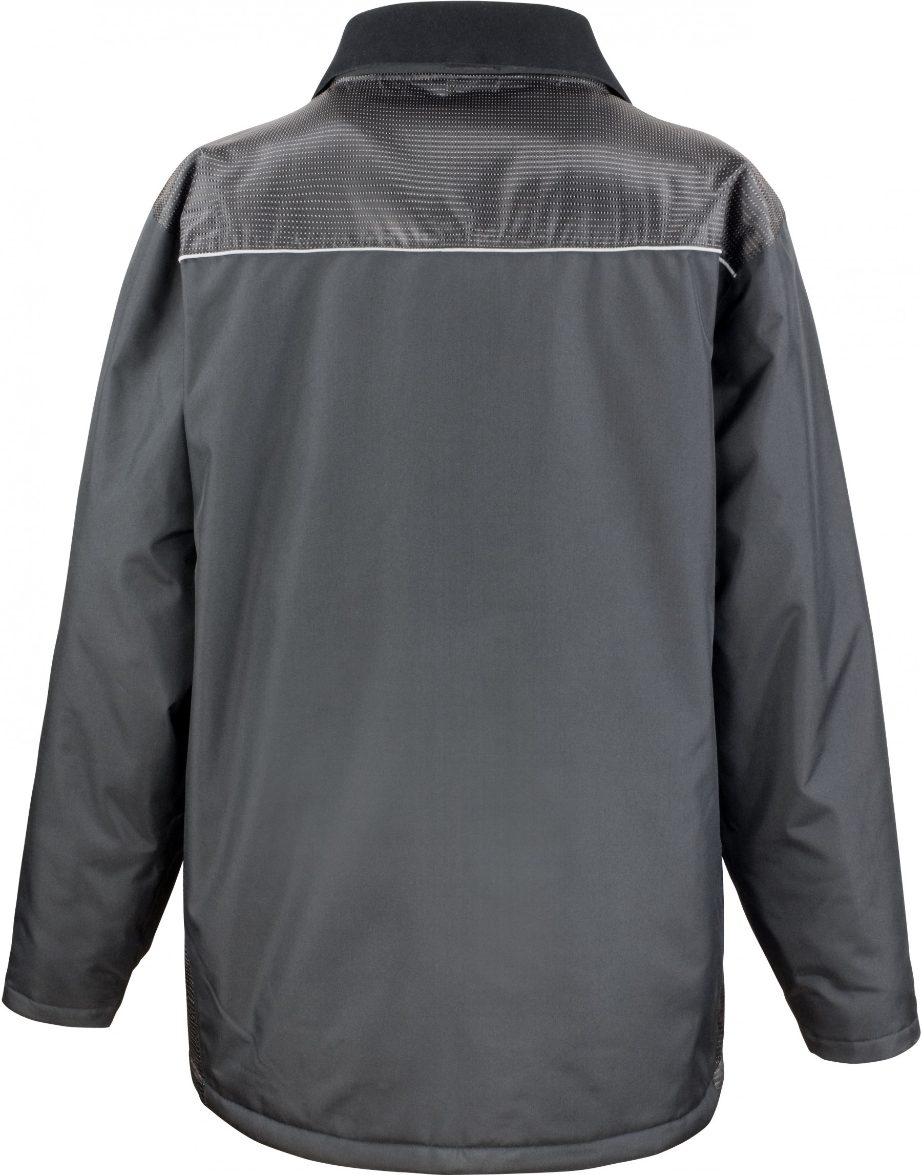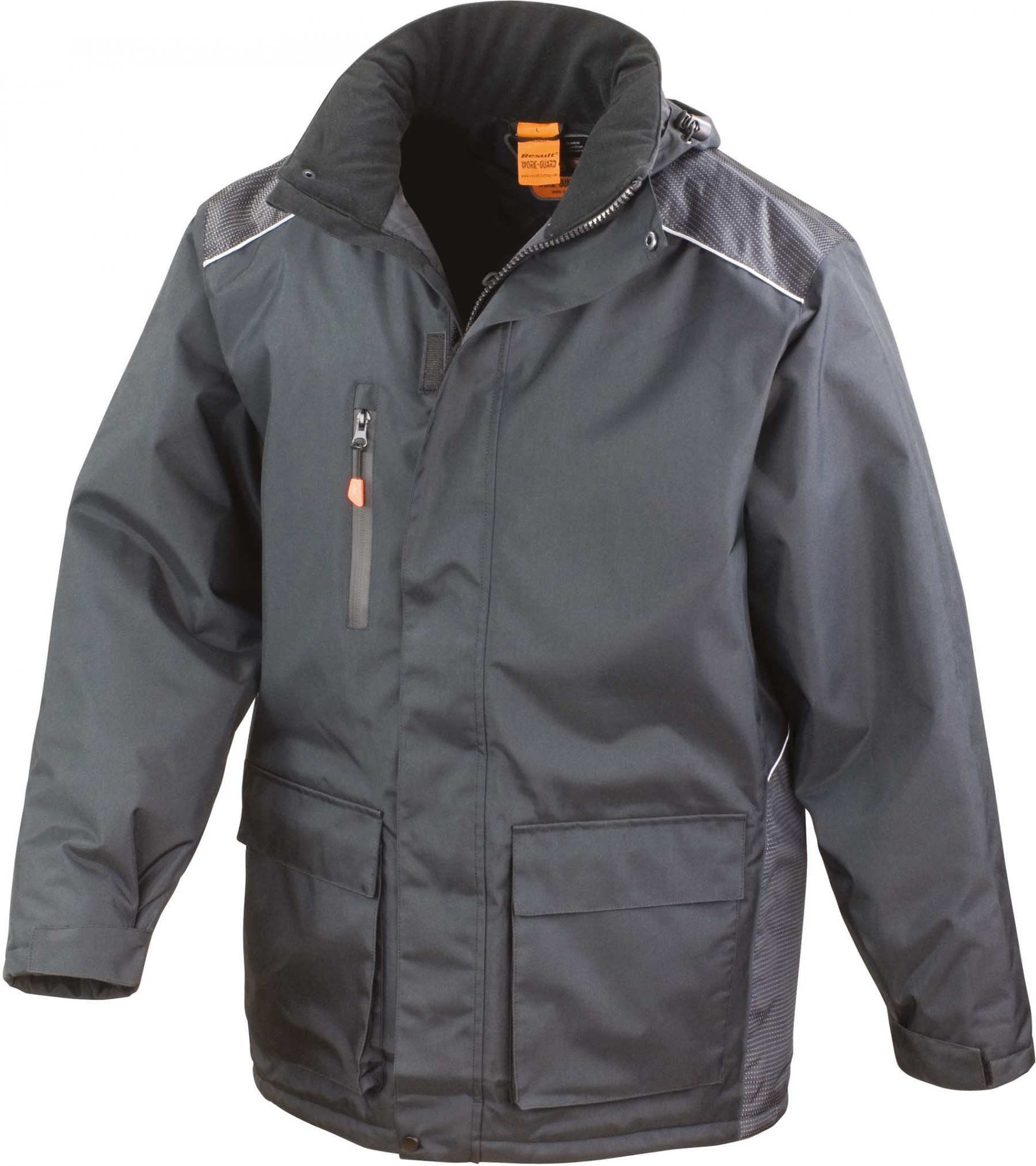 Extérieur : 300D 100% polyester oxford enduit PVC. Doublure : 210T 100% polyester taffeta. Isolation : rembourrage 100% polyester. Imperméable à 2000mm. Coupe-vent. Doublure damassée en losanges. Fermeture zippée 2 directions à l'avant avec rabat de protection fermé par Velcro® et boutons pression. Col doublé en tricot. Capuche ajustable et amovible par zip. Empiècements contrastés en tissu Dobby. Passepoil réfléchissant. Multi poches : poches avant plaquées à fermeture Velcro®, poches latérales chauffe-mains, poche poitrine intérieure. Ourlet réglable par cordon de serrage. Poignets côtelés avec réglage par fermeture Velcro®. Tirettes amovibles sur toutes les fermetures zippées (4 coloris de tirette fournis).