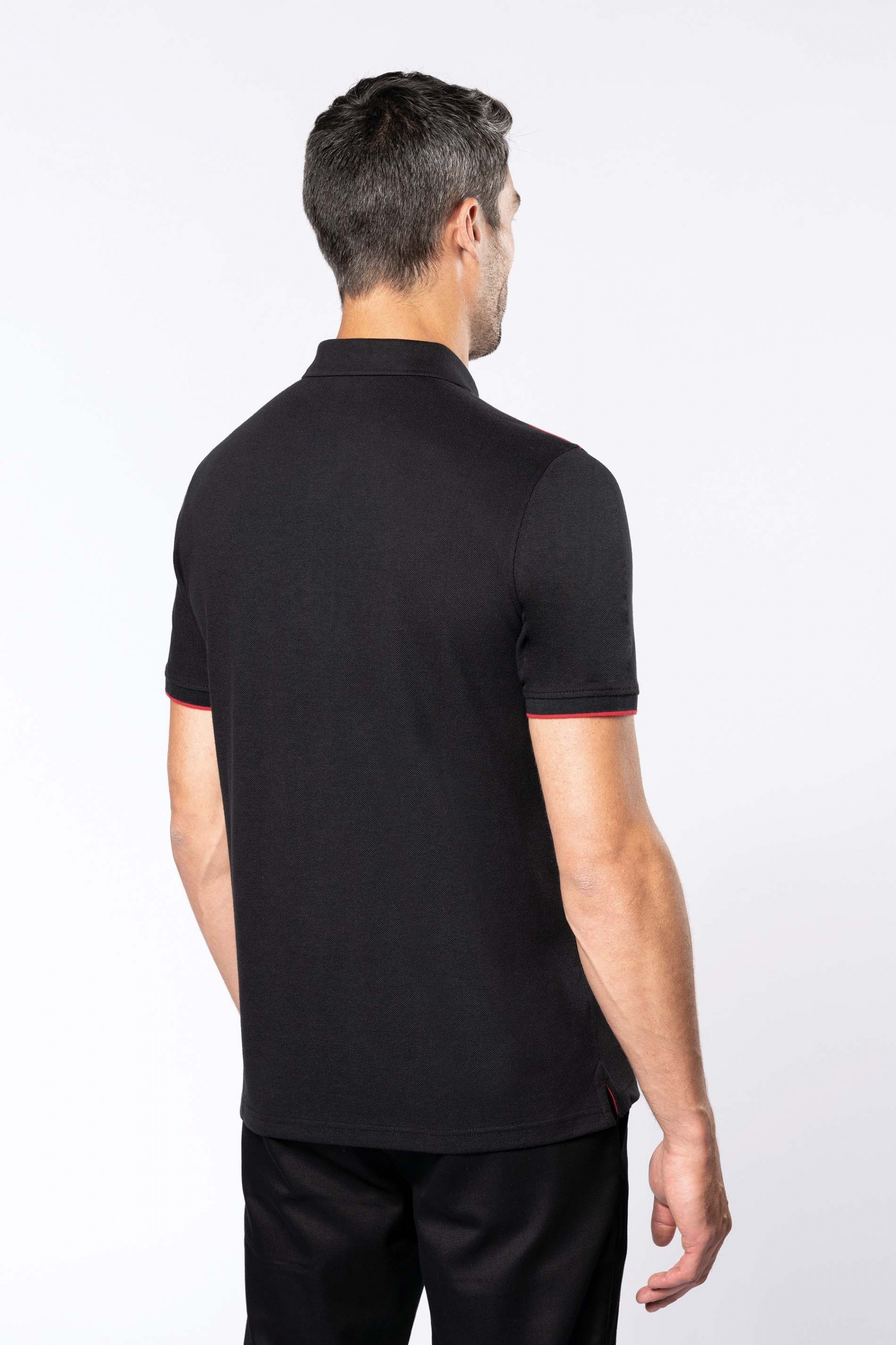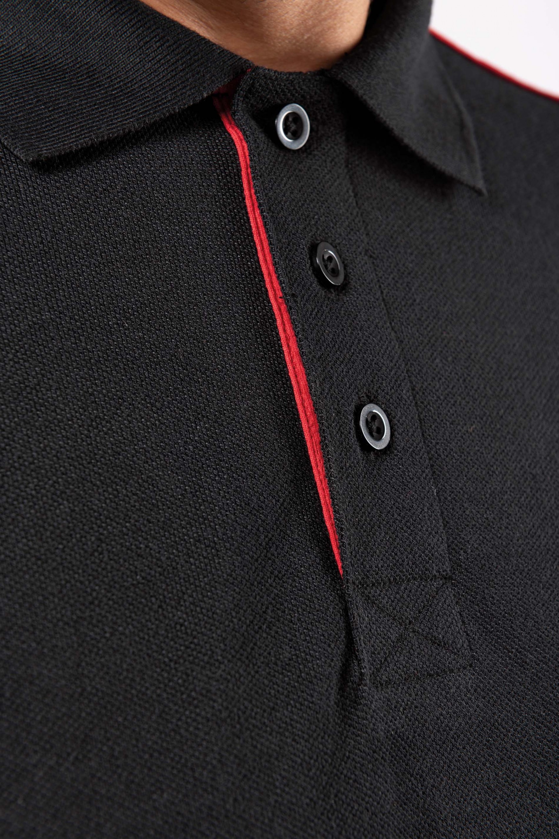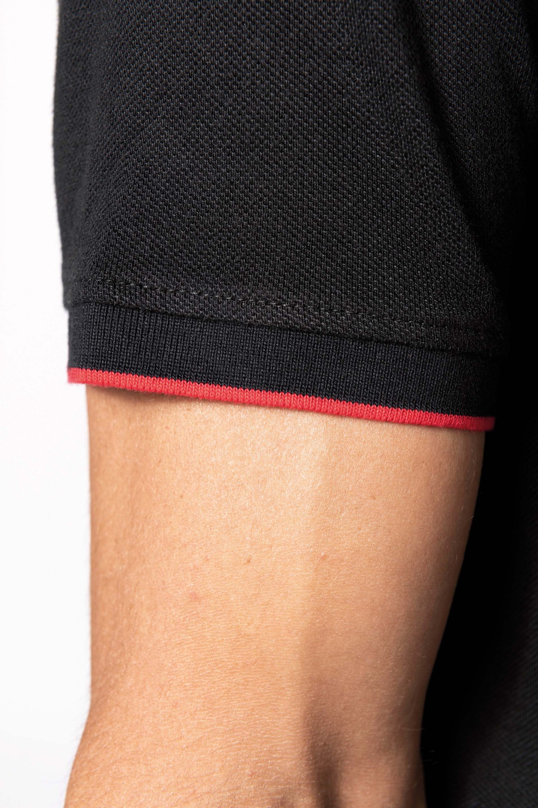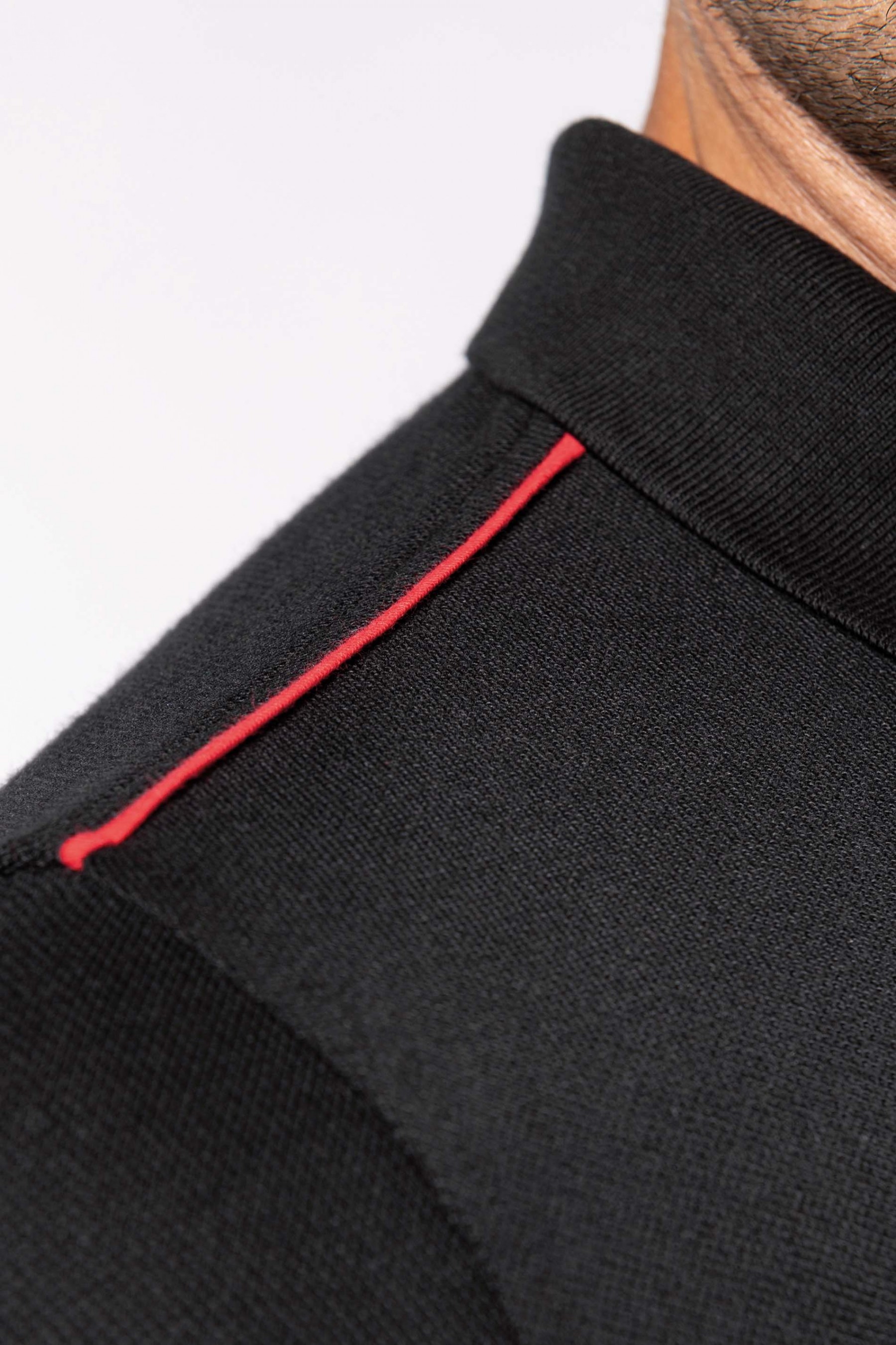 65% polyester / 35% coton. Coton peigné maille piquée. Lavable à 60°. Traitement antiboulochage. Patte 3 boutons avec bande intérieure contrastée. Col en bord-côte avec bande de propreté. Passepoil contrasté intérieur col et épaules. Finitions bord-côte avec liseré contrasté au bas de manches. Fentes latérales avec bande chevron contrastée pour plus de confort. Finition double aiguille au bas de vêtement. Idéal pour une utilisation quotidienne.