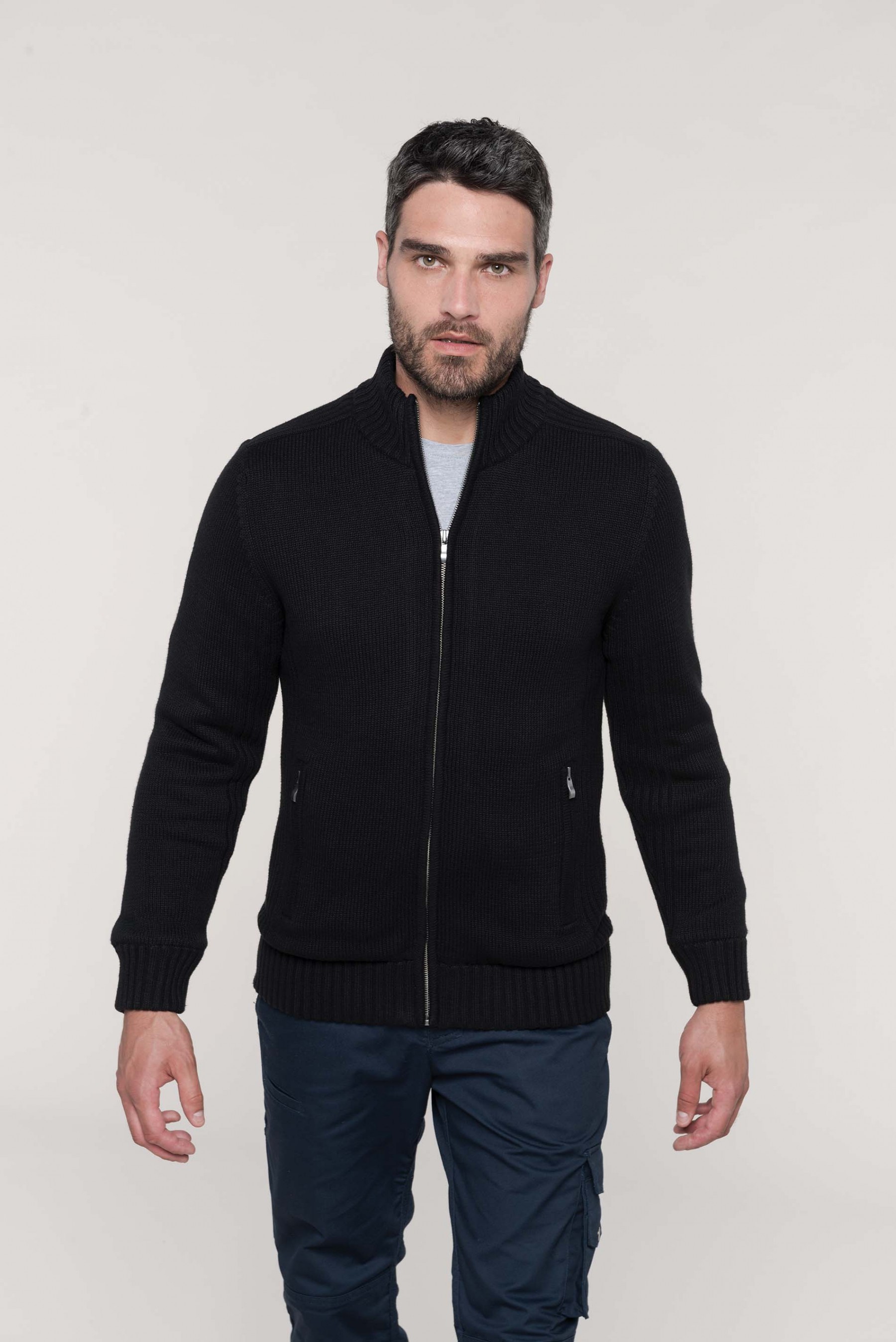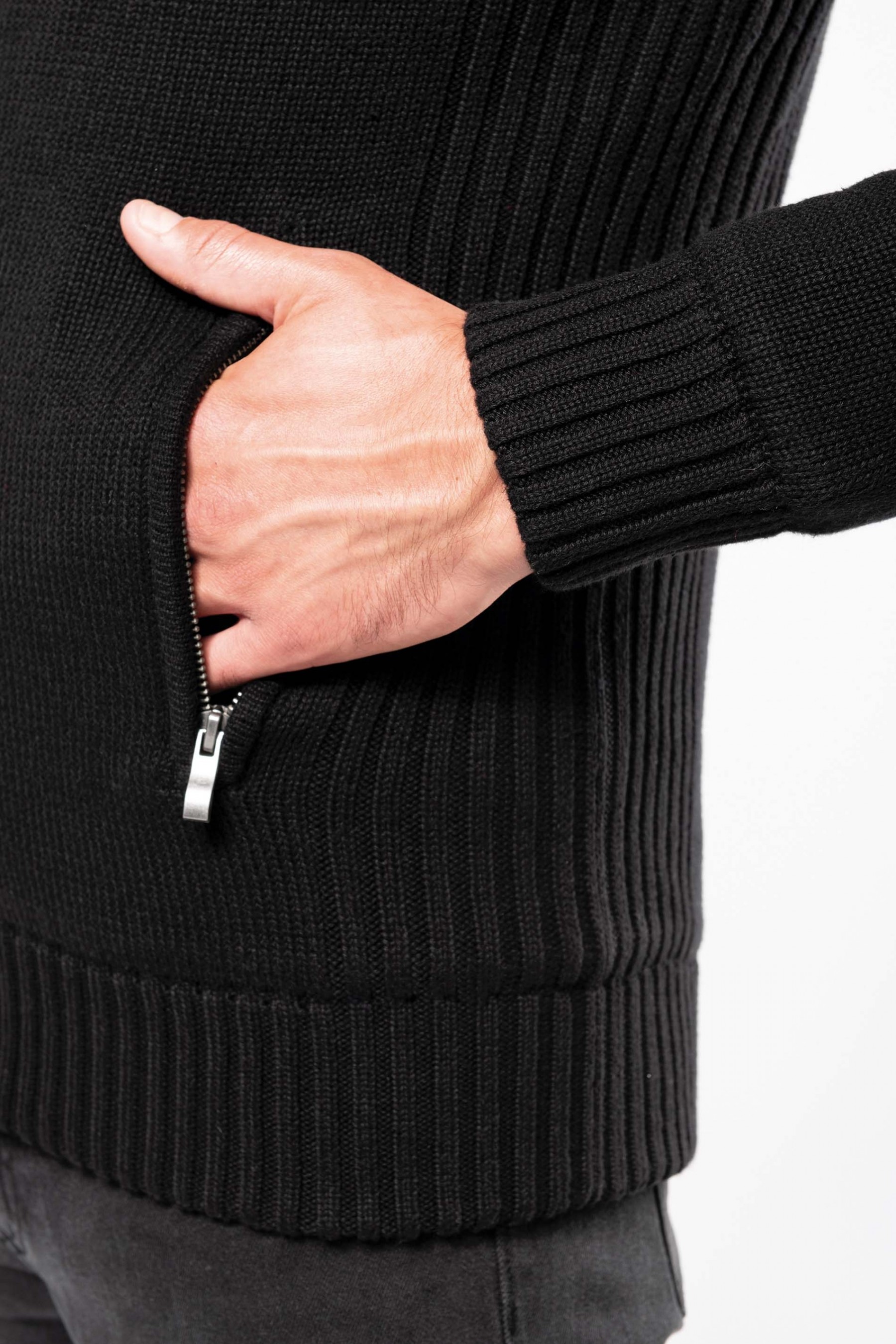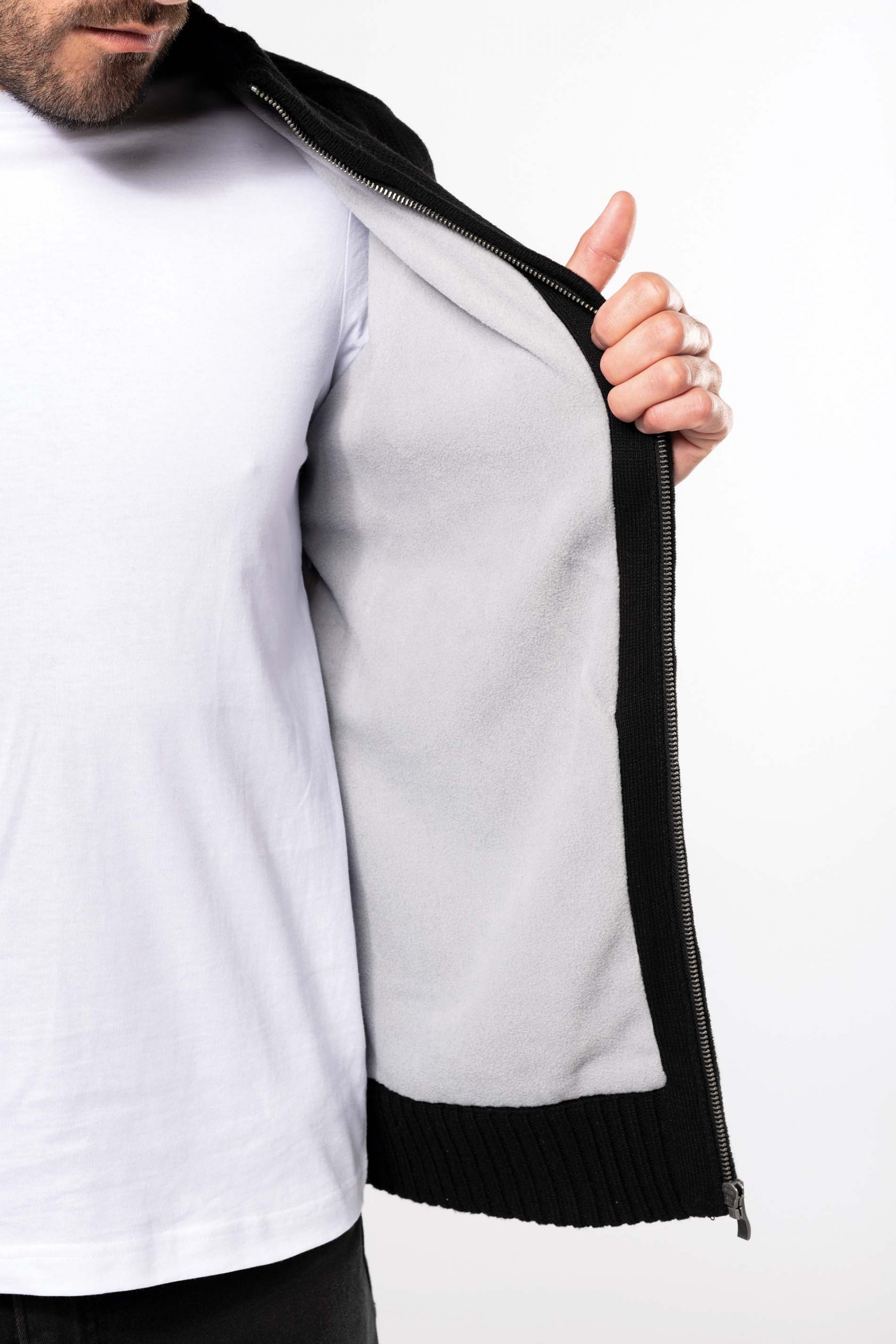 Extérieur : 50% coton / 50% acrylique. Intérieur : 100% polyester micropolaire. Doublure manches et garniture intérieure polyester. Matières chaudes et confortables. 2 poches et fermeture avant zippées. Tricotage en côtes 2 x 2 aux épaules, côtés et manches. Bord-côte 2 x 2 doublé au col, bas de manches et de vêtement. Zip invisible intérieur côté pour accès personnalisation côté ou dos.