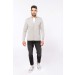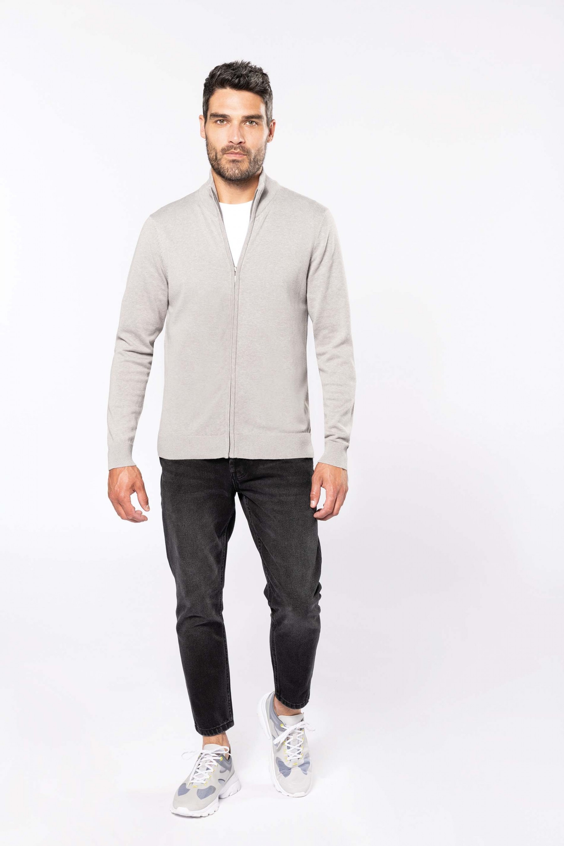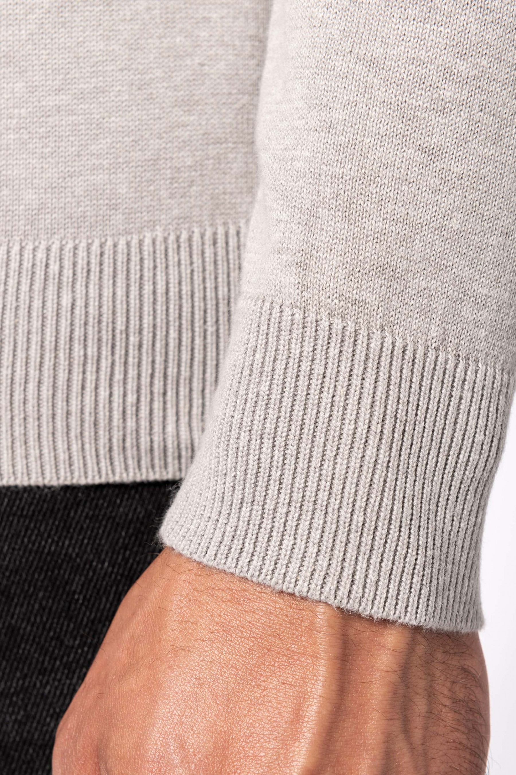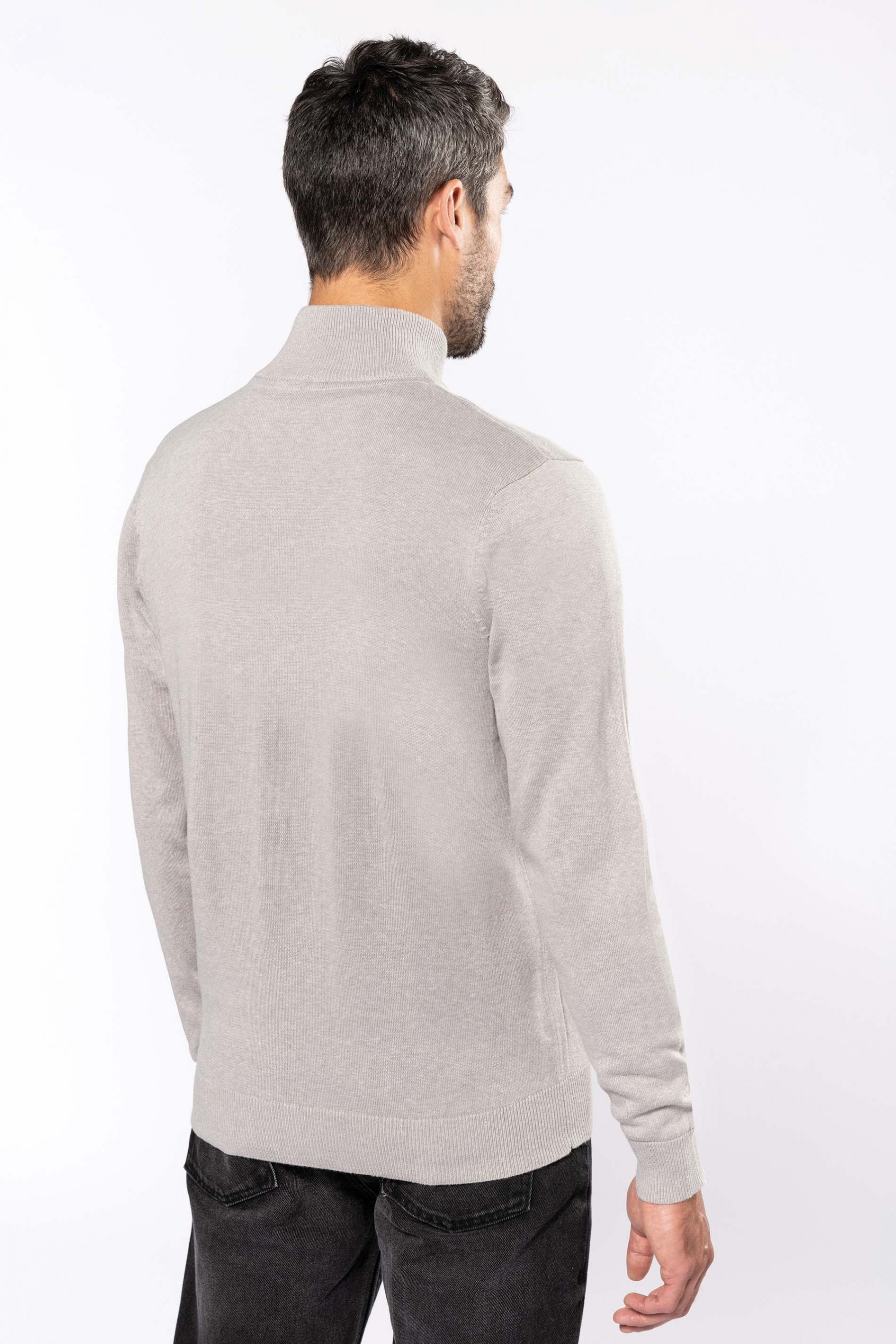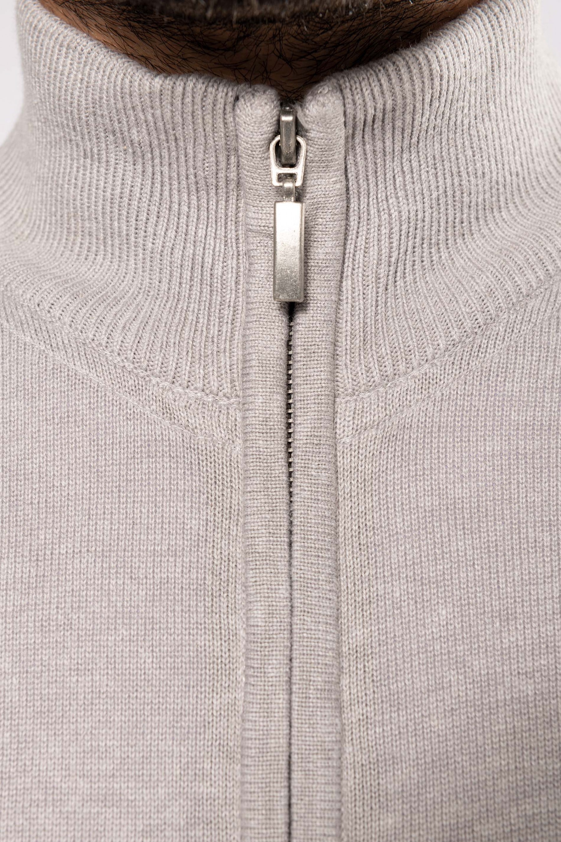 50% coton / 50% acrylique (jauge 12). Coupe ajustée. Col cheminée double épaisseur et fermeture avec zip métal fumé. Bande de propreté à l'encolure.