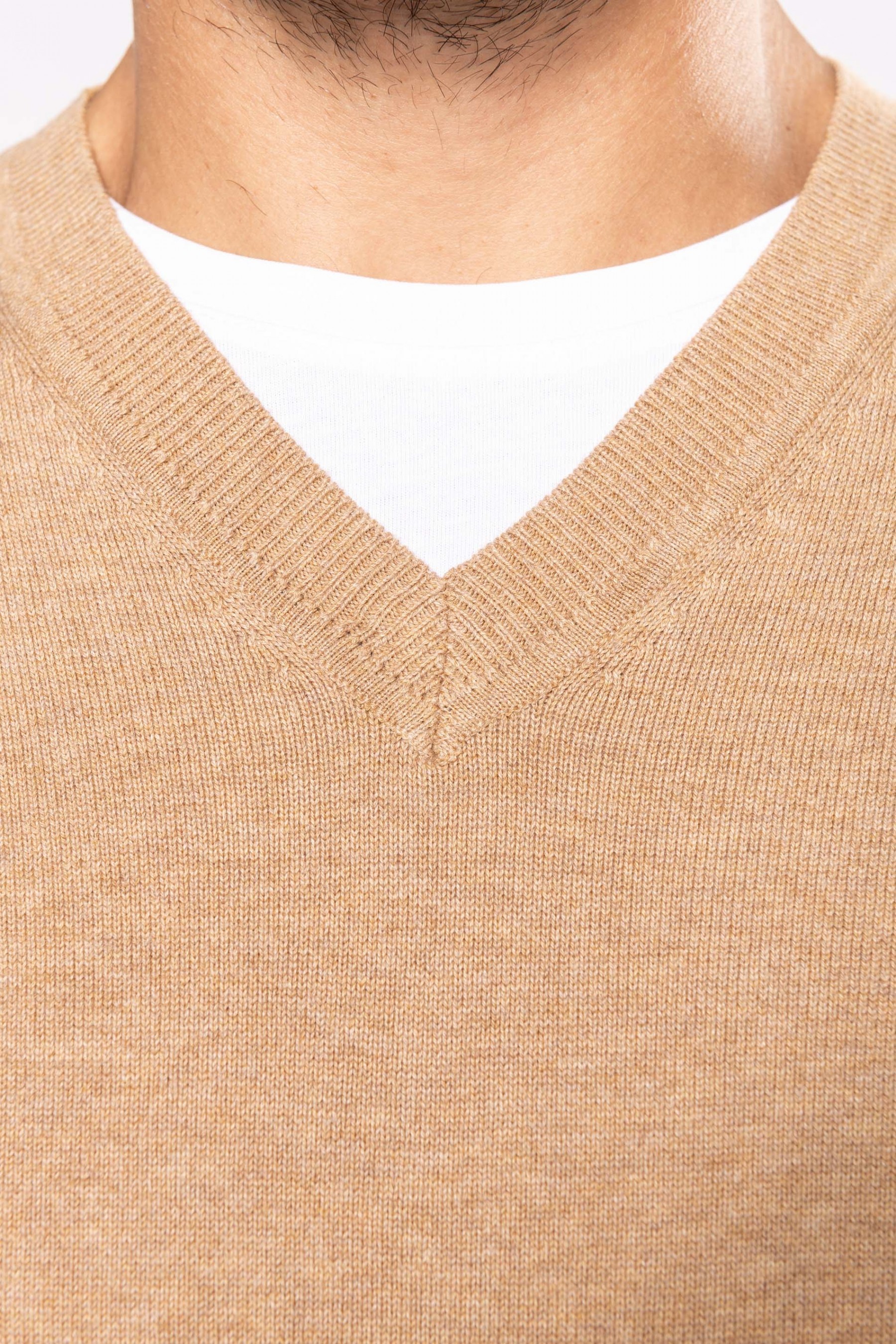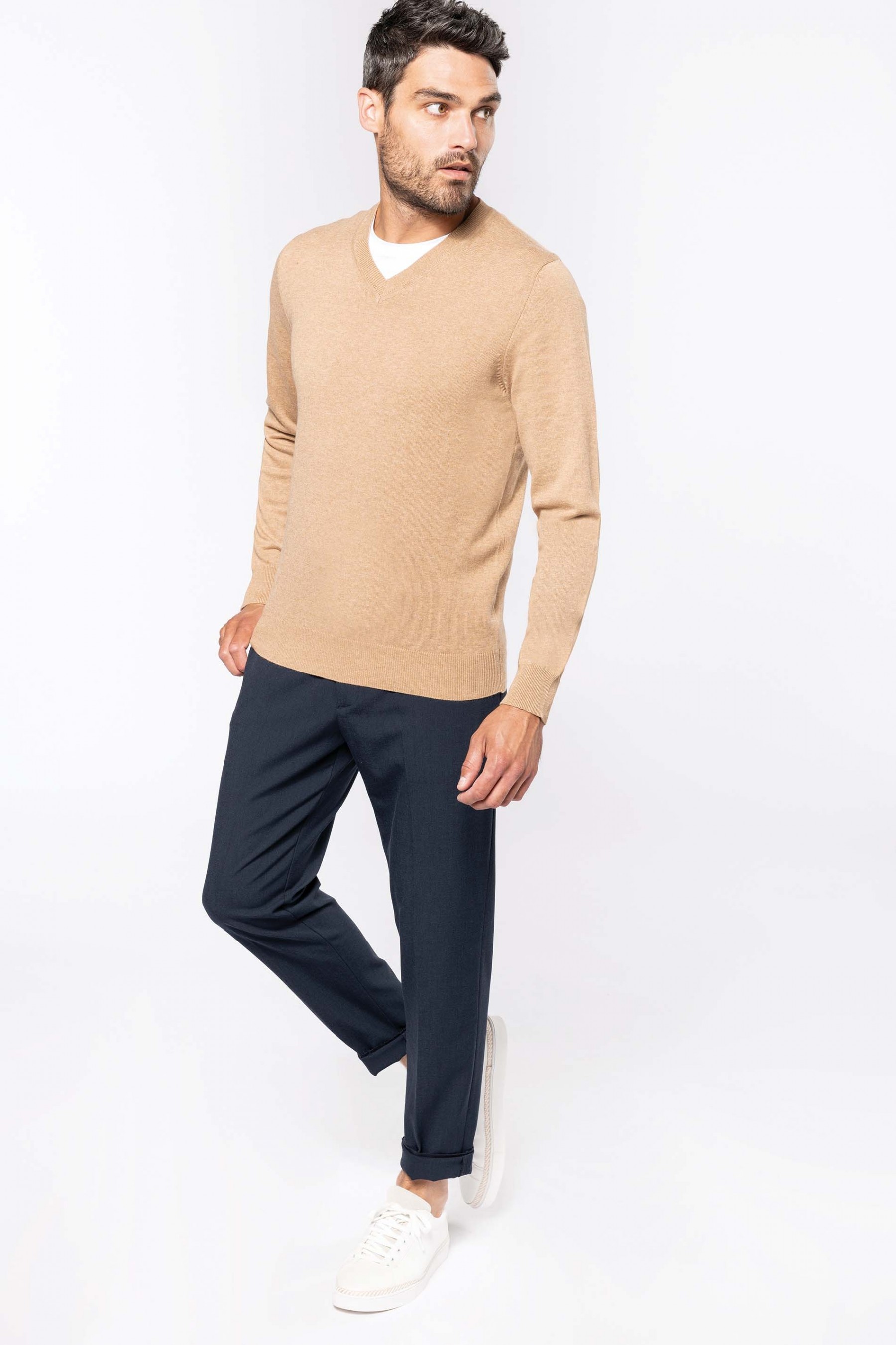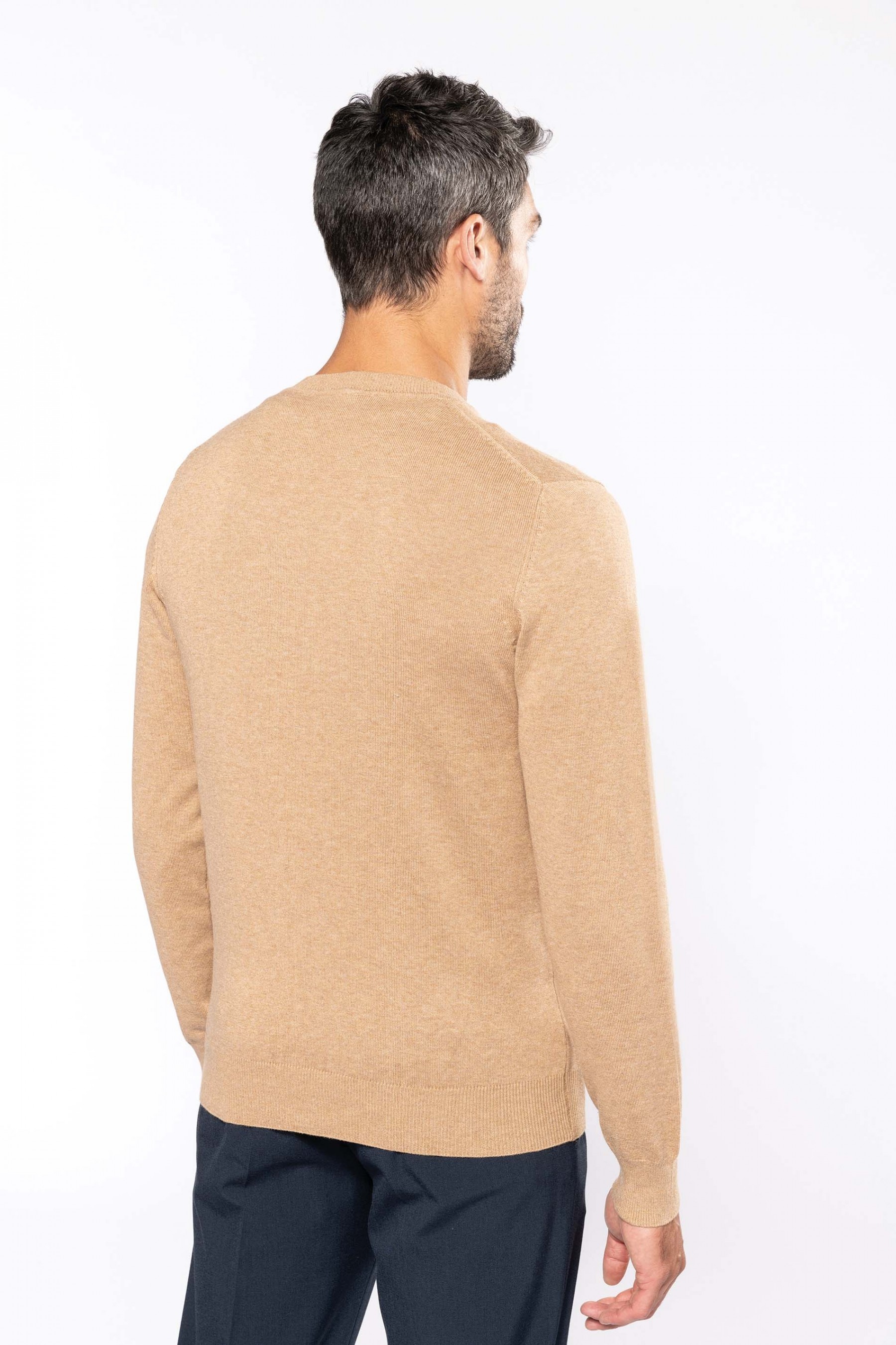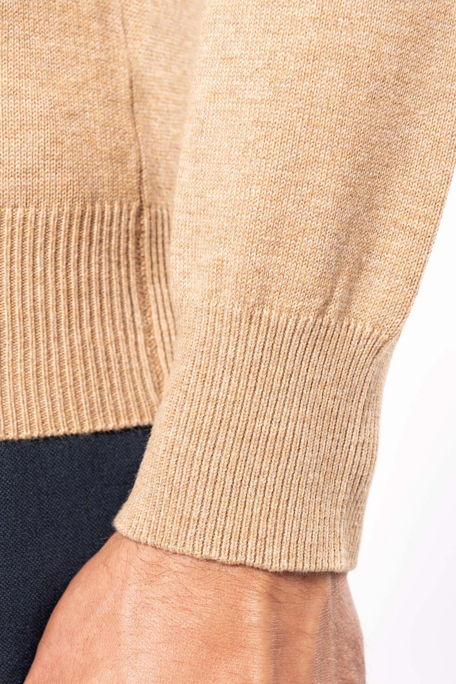 87% coton / 11% polyamide / 2% élasthanne. Col V et bande intérieure tricotée contrastée. Bord-côte 1x1 au col, bas de manches et de vêtement. Coupe élégante et confortable.