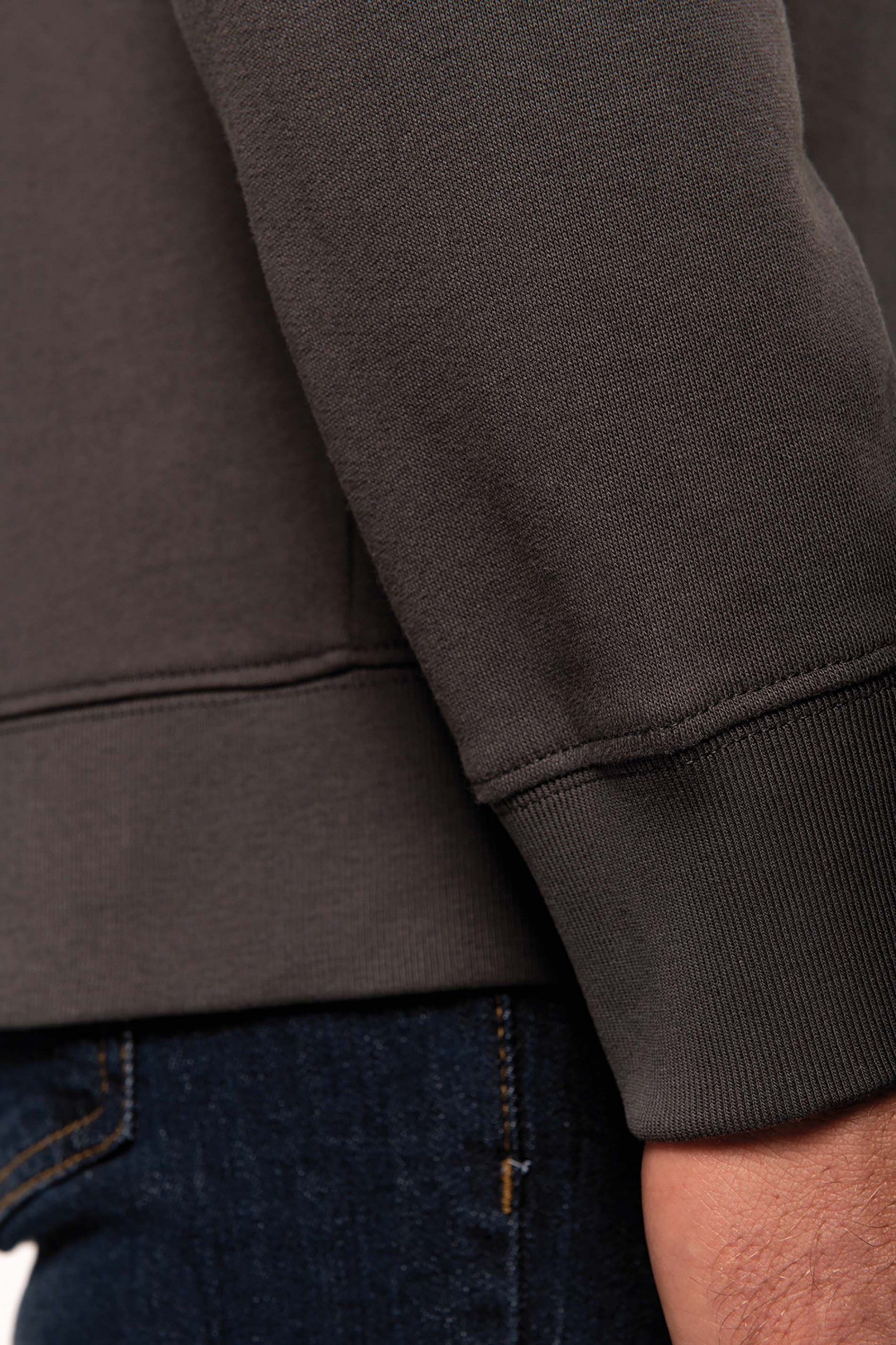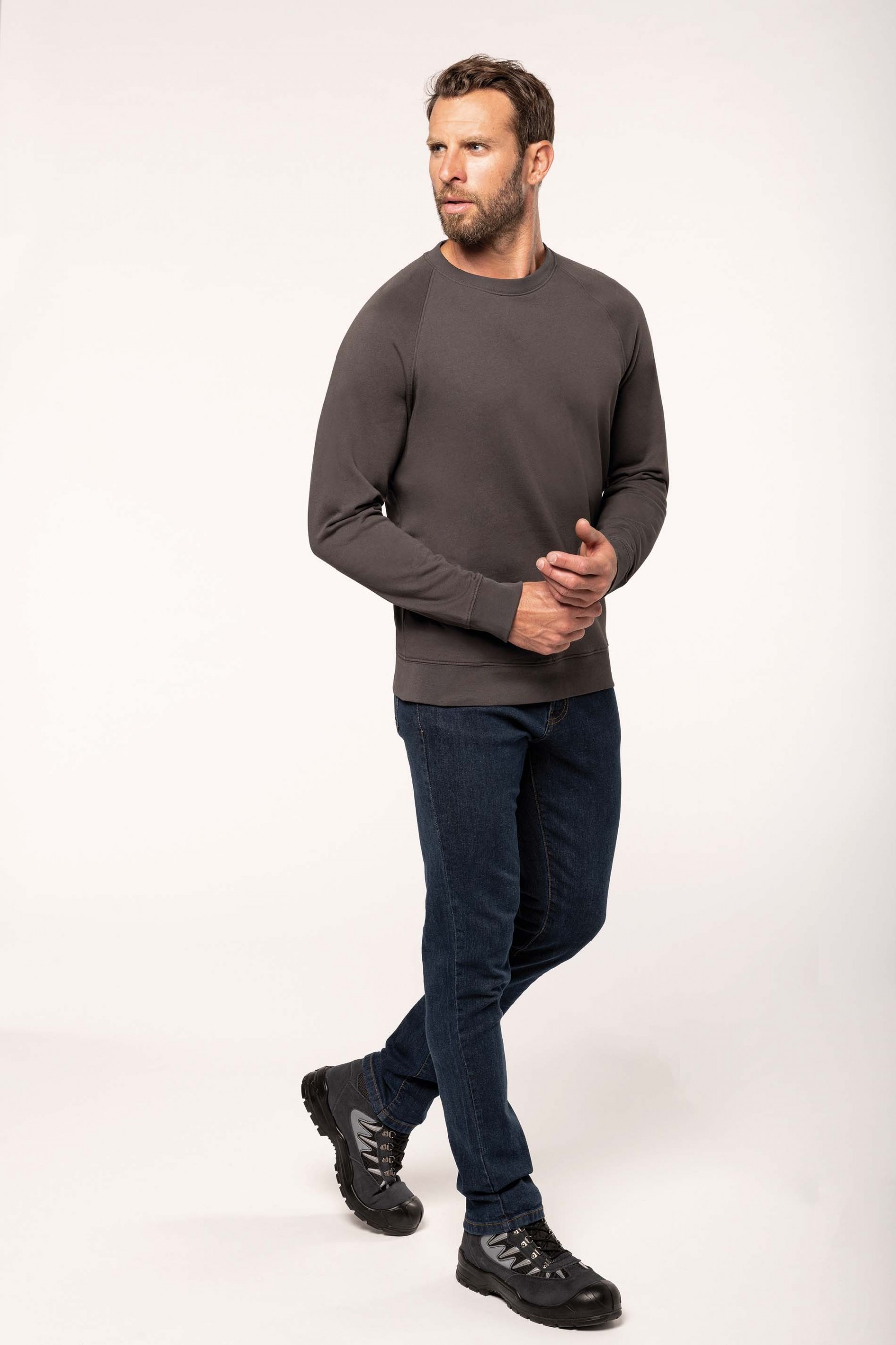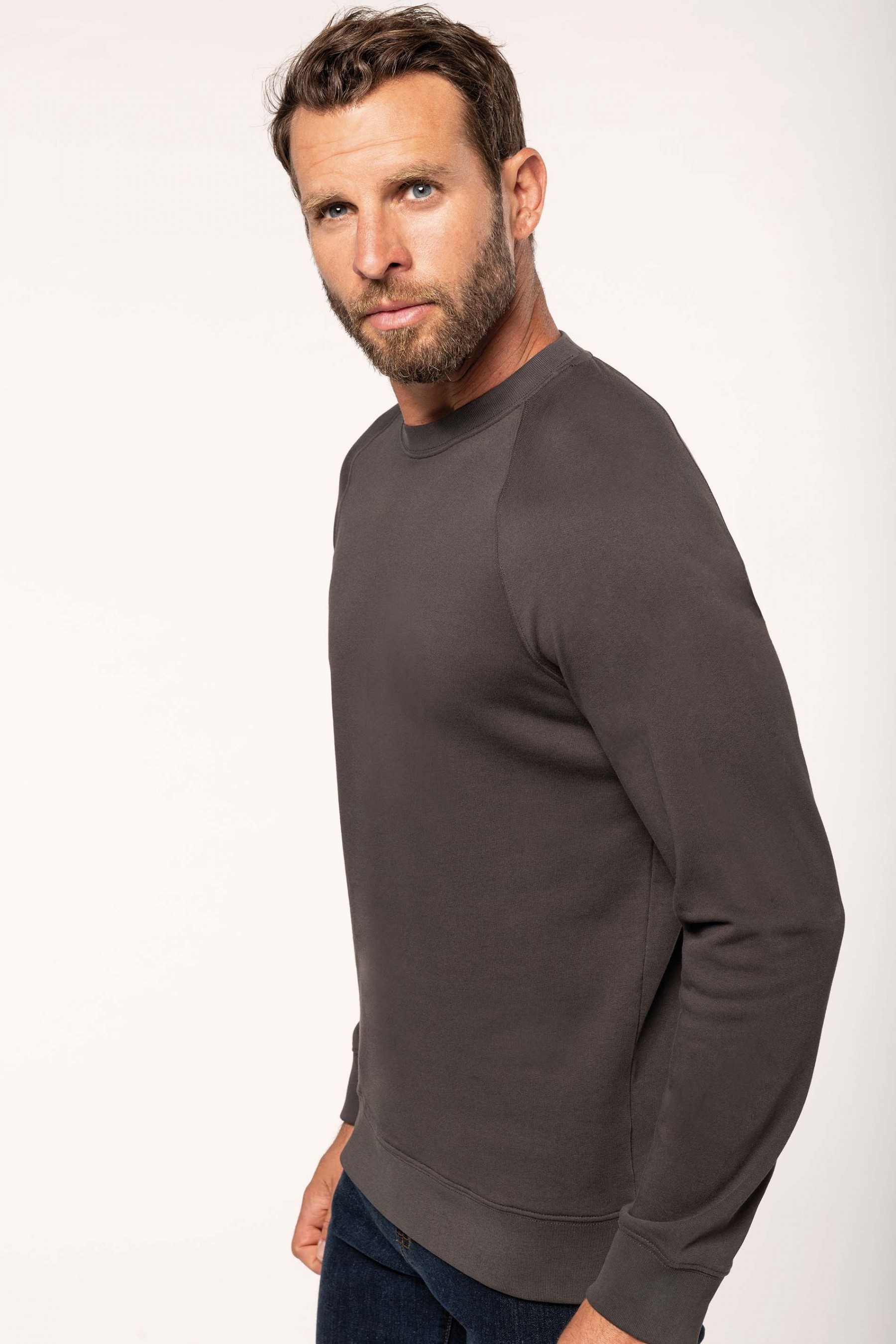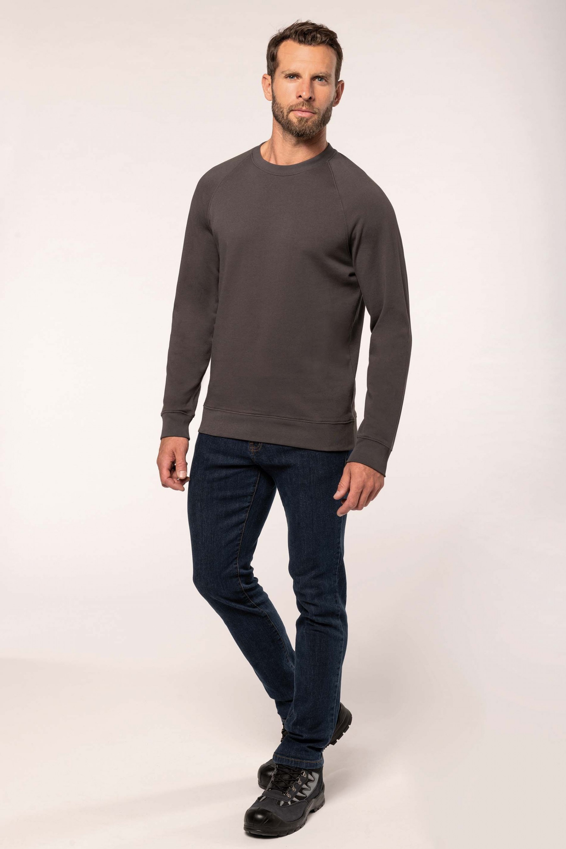 100% coton. Molleton gratté 3 fils. Lavage 60°. Coupe droite. Manches raglan. Bande de propreté intérieur col en chevron ton sur ton. Encolure ronde. Montage bord-côtes 1x1 tubulaire pour une meilleure finition au col, bas de manches et de vêtement. Empiècement demi lune dans le col. Etiquettes en coton.