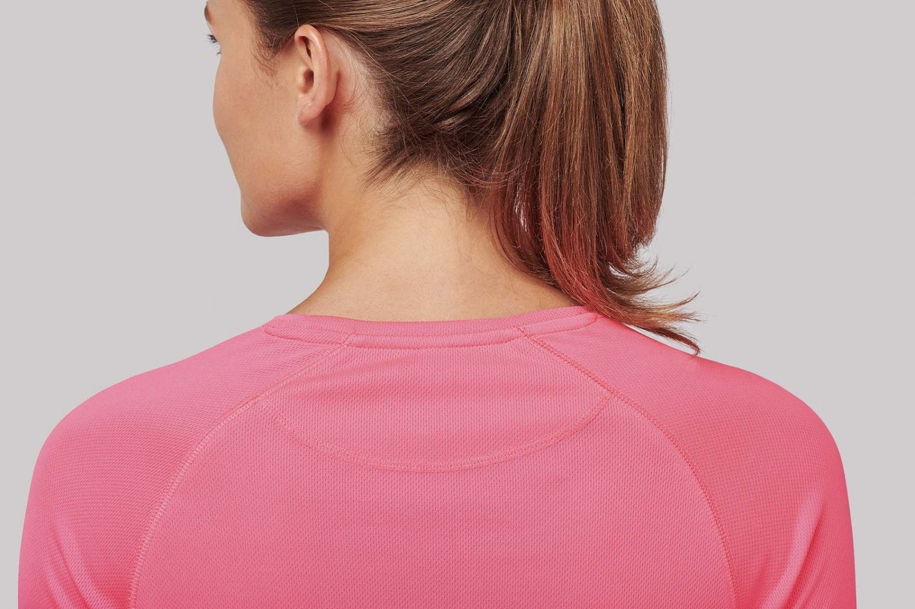 100% polyester. Tissu léger à séchage rapide. Encolure ronde avec bande de propreté. Manche raglan. Points de recouvrement sur les emmanchures et découpes. Finition double aiguille à l'encolure, bas de manche et de vêtement.