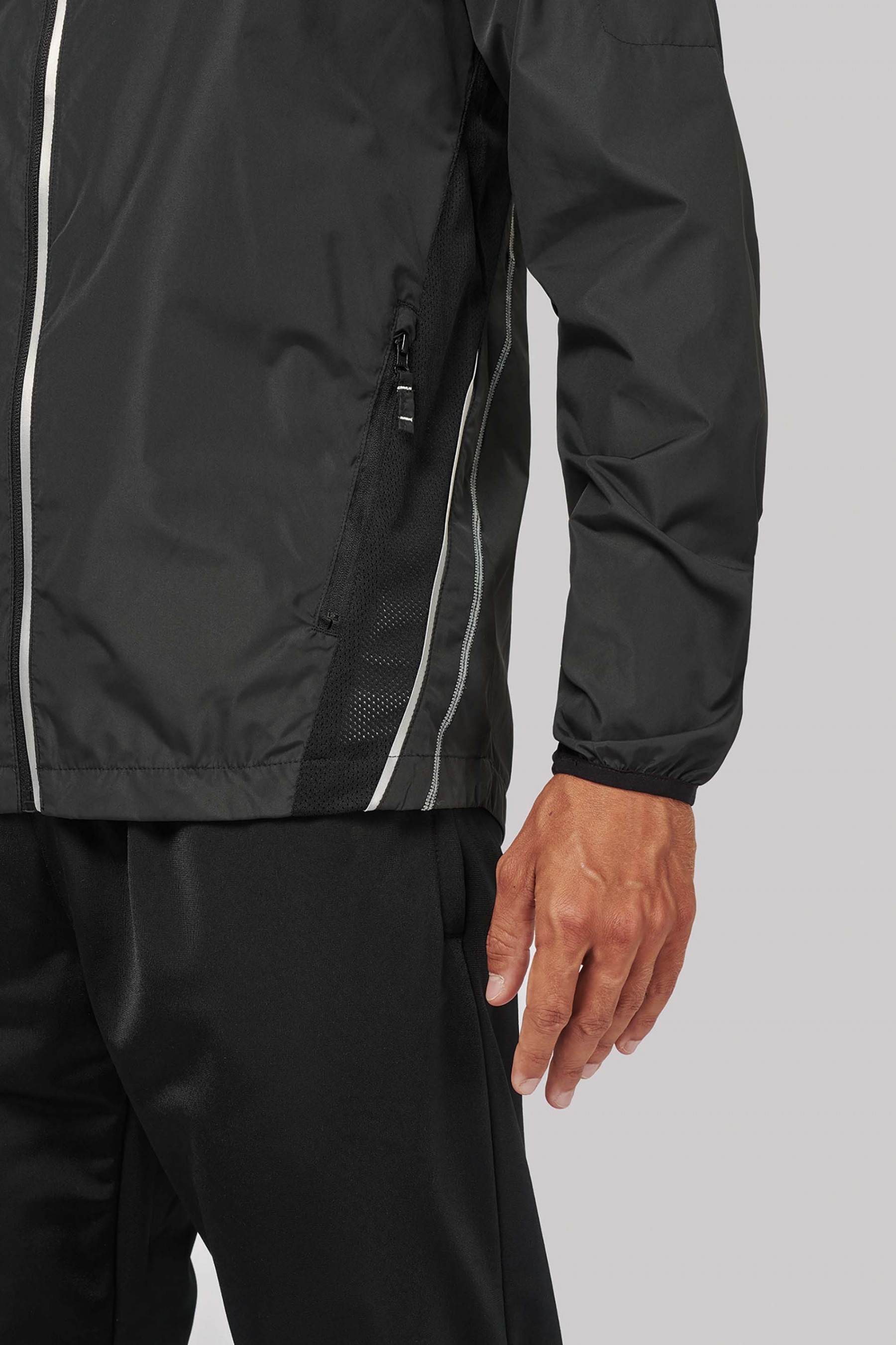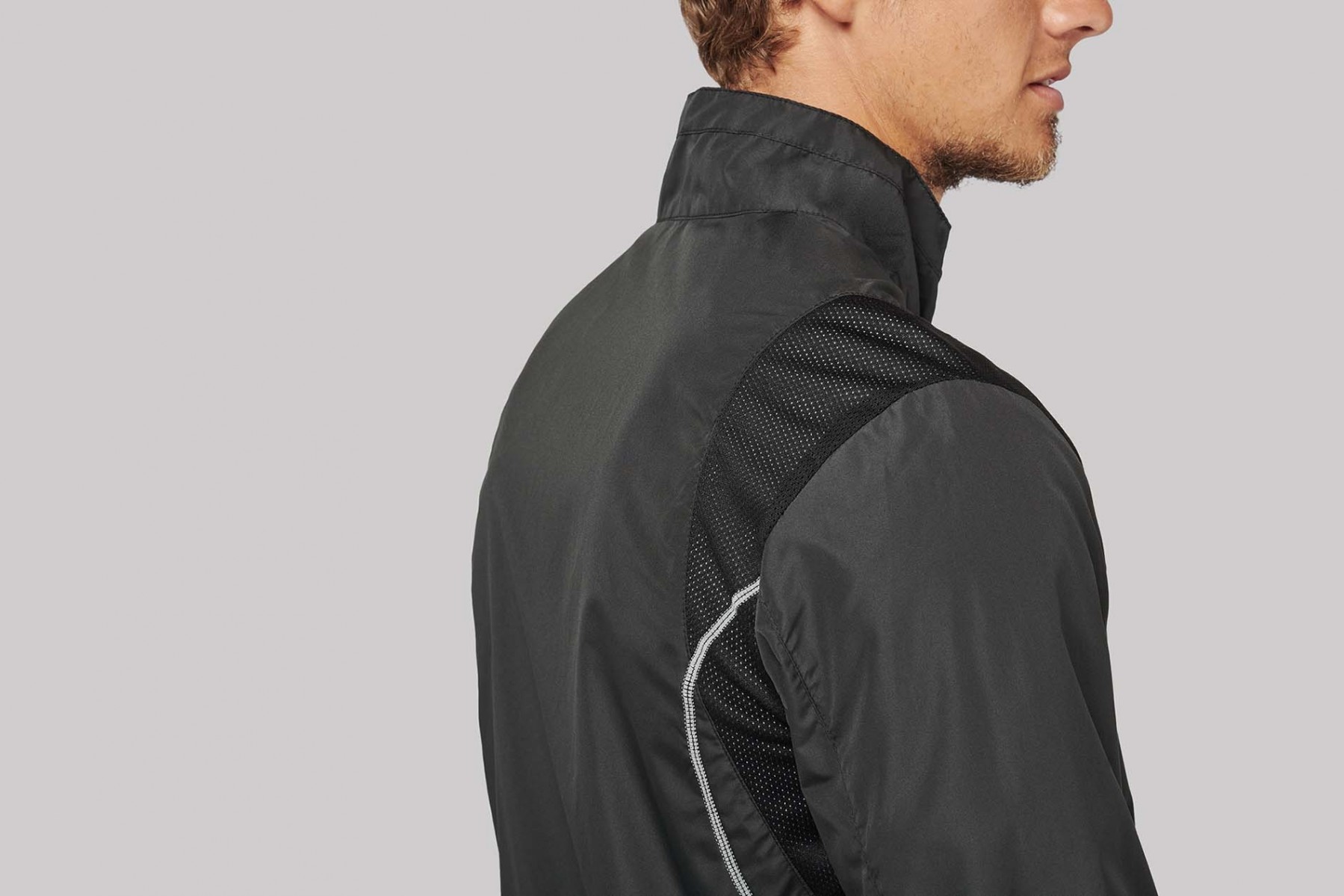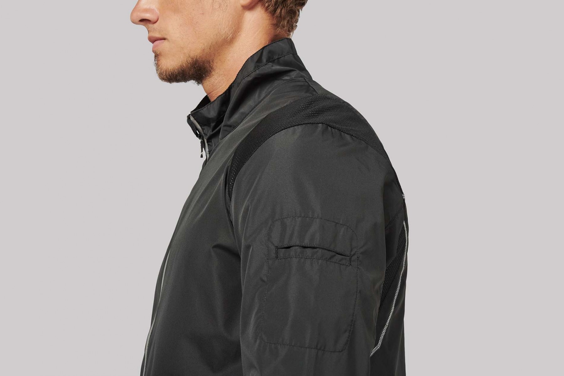100% polyester microfibre avec enduction acrylique. 2 poches zippées devant. Empiècements en filet épaules et côtés pour évacuer la transpiration. Bandes réfléchissantes sur le côté et sur le zip milieu devant. Manche avec petite poche. Bas de manche resserrée par un biais élastiqué.