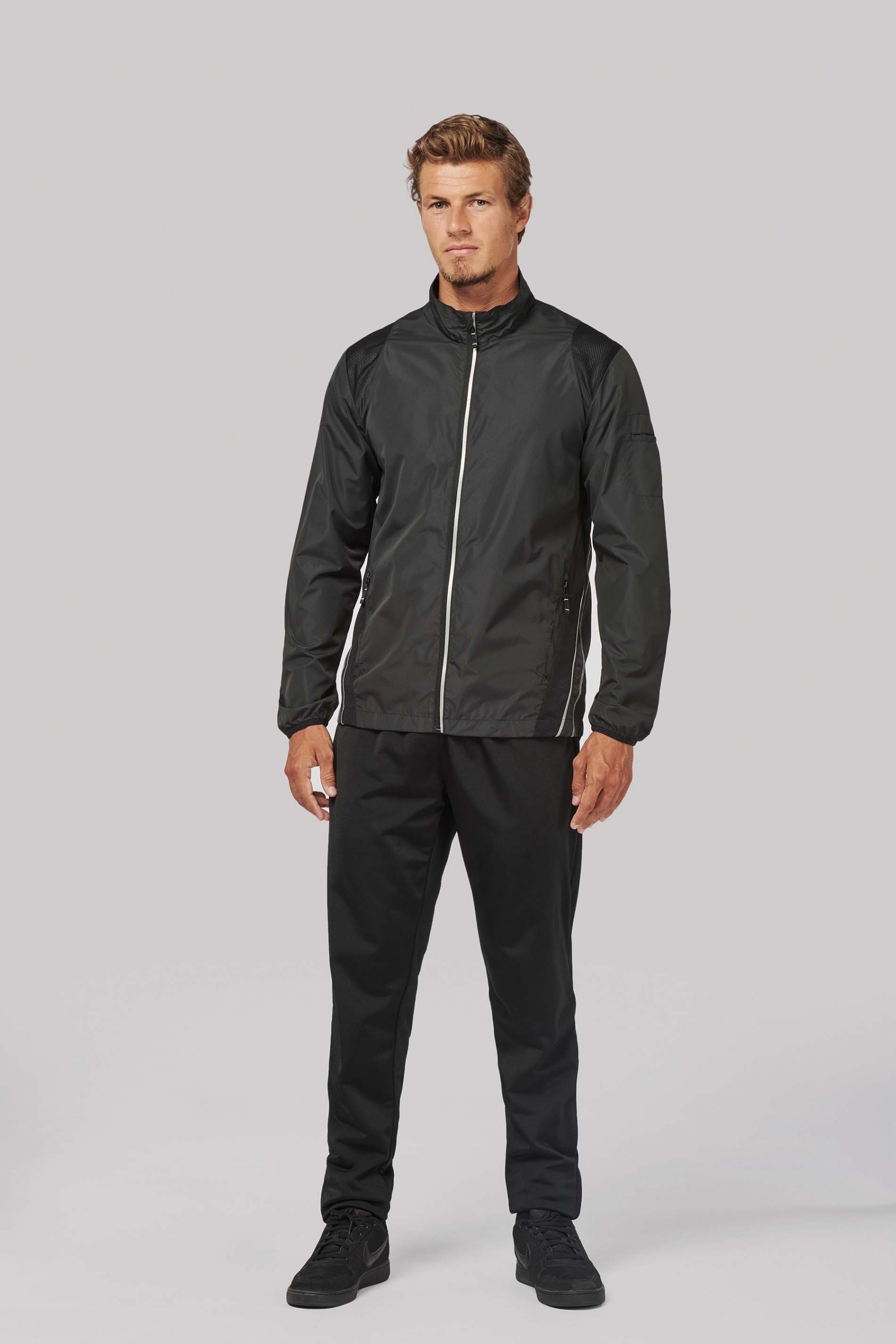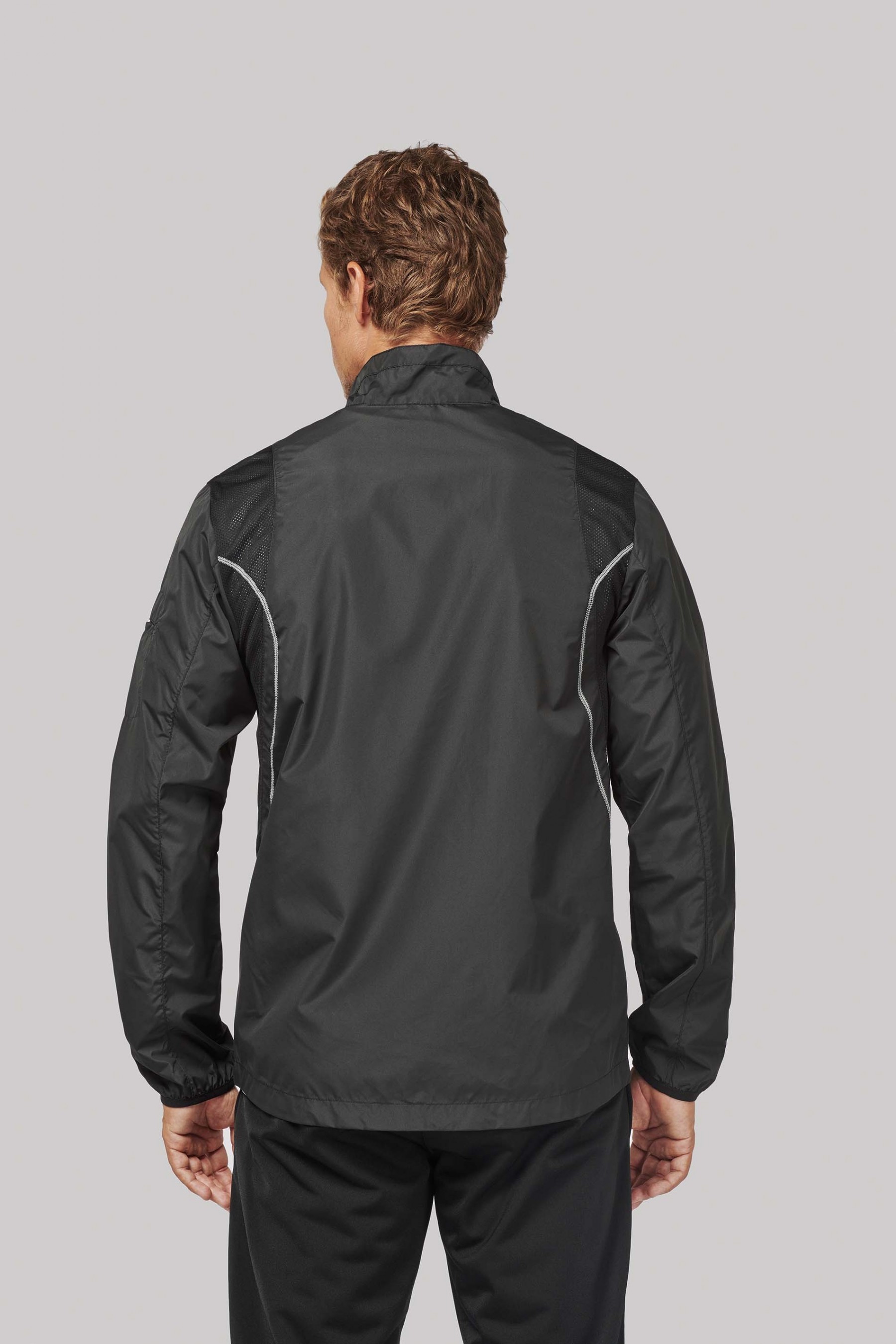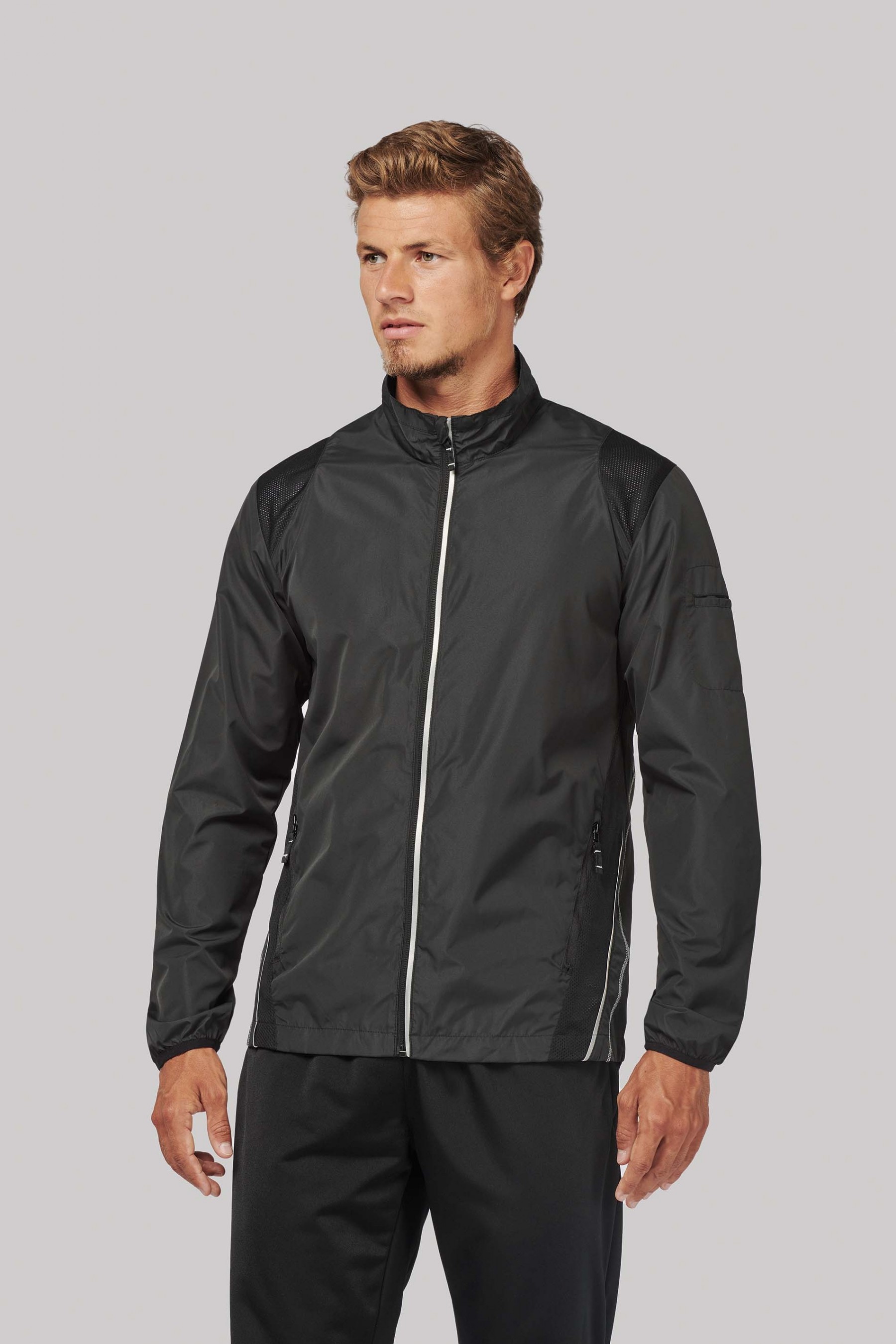 100% polyester microfibre avec enduction acrylique. 2 poches zippées devant. Empiècements en filet épaules et côtés pour évacuer la transpiration. Bandes réfléchissantes sur le côté et sur le zip milieu devant. Manche avec petite poche. Bas de manche resserrée par un biais élastiqué.