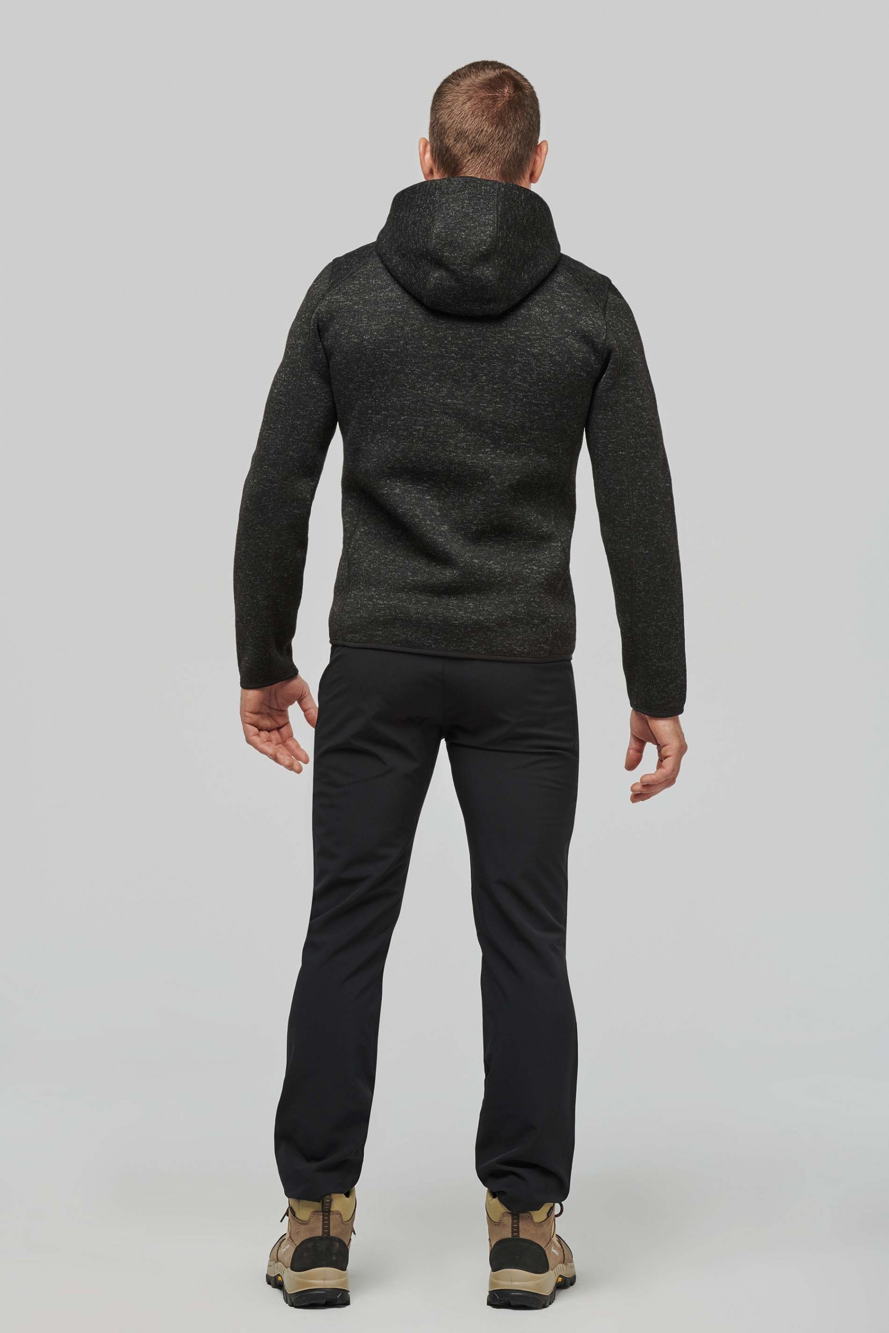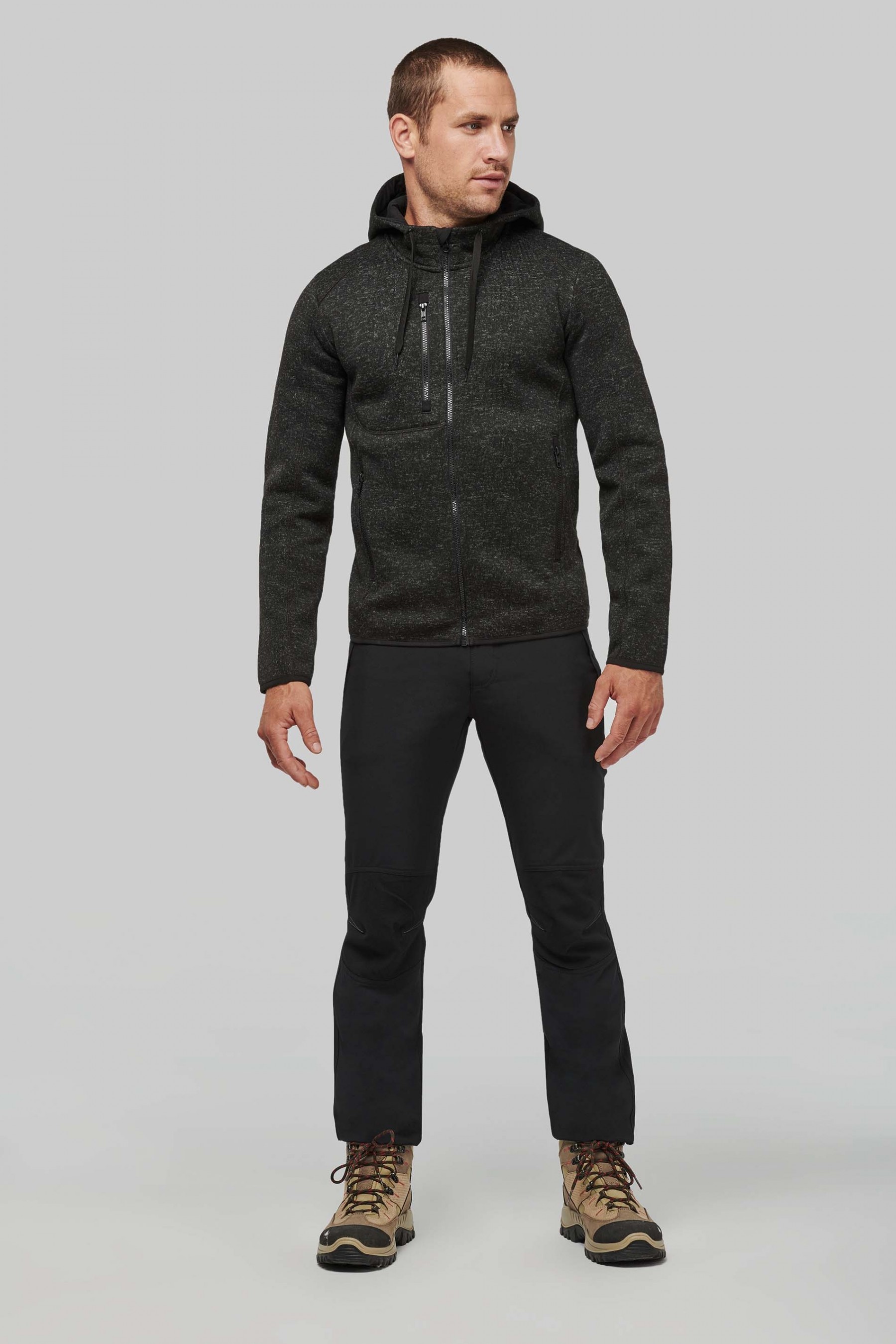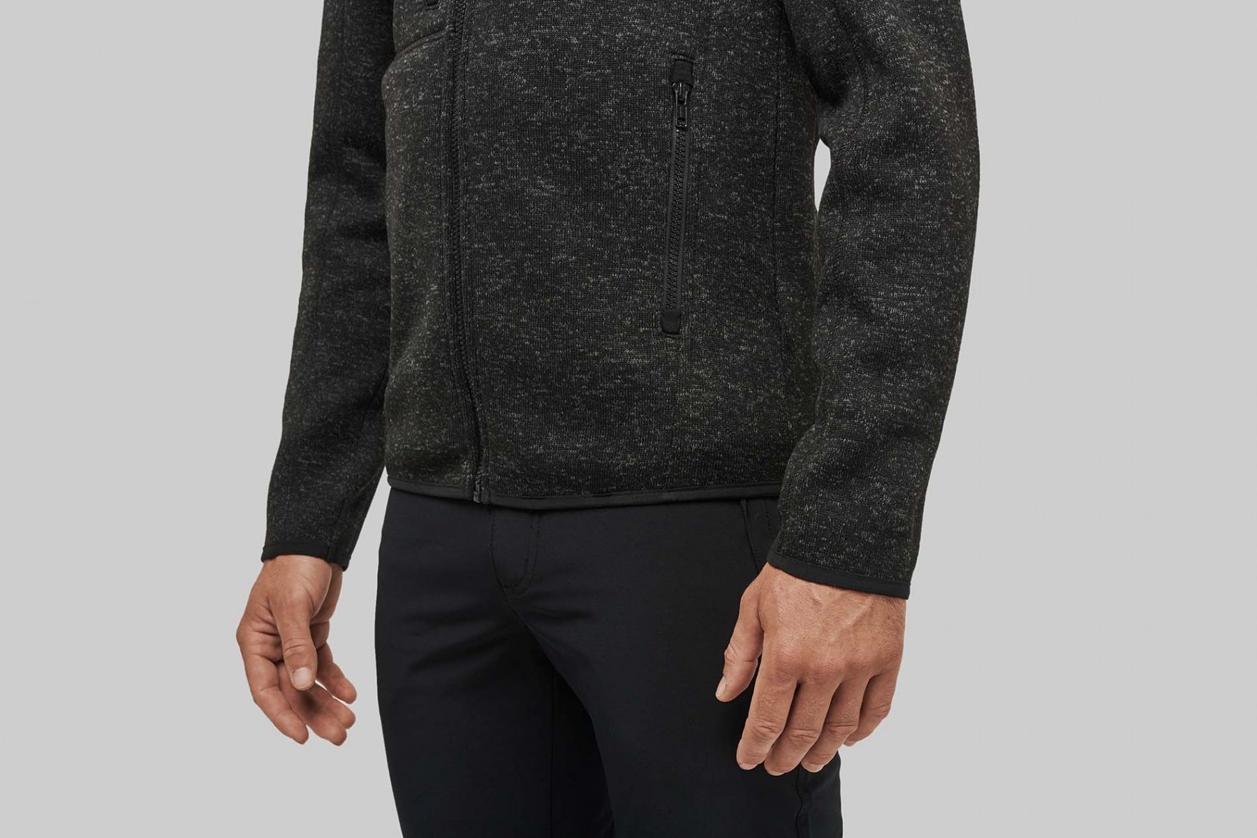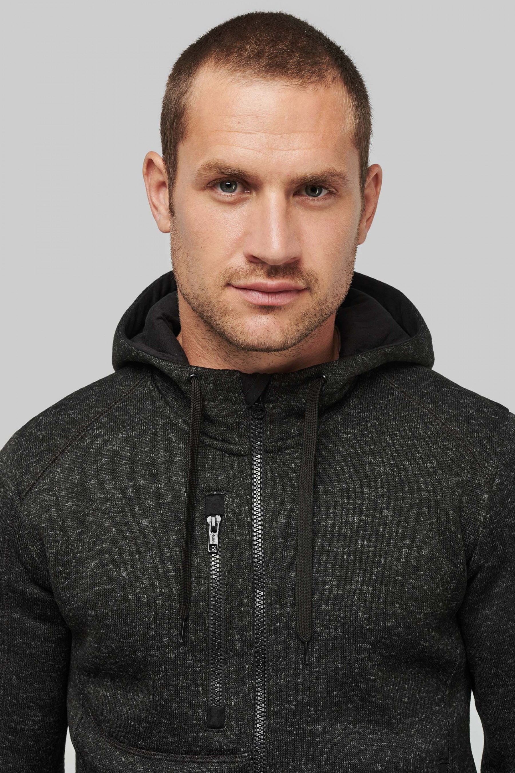 Tricot intérieur gratté 100% polyester. 2 poches devant zippées contrastées et 1 poche poitrine zippée contrastée. Capuche doublure contrastée jersey 100% coton avec cordon de serrage plat contrasté. Bas de manches et de vêtement avec finition biais contrasté élastiqué. Point de recouvrement sur les découpes.