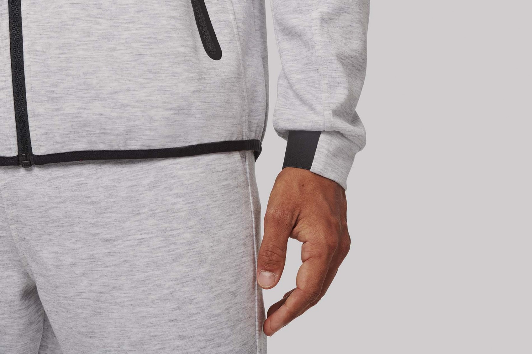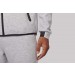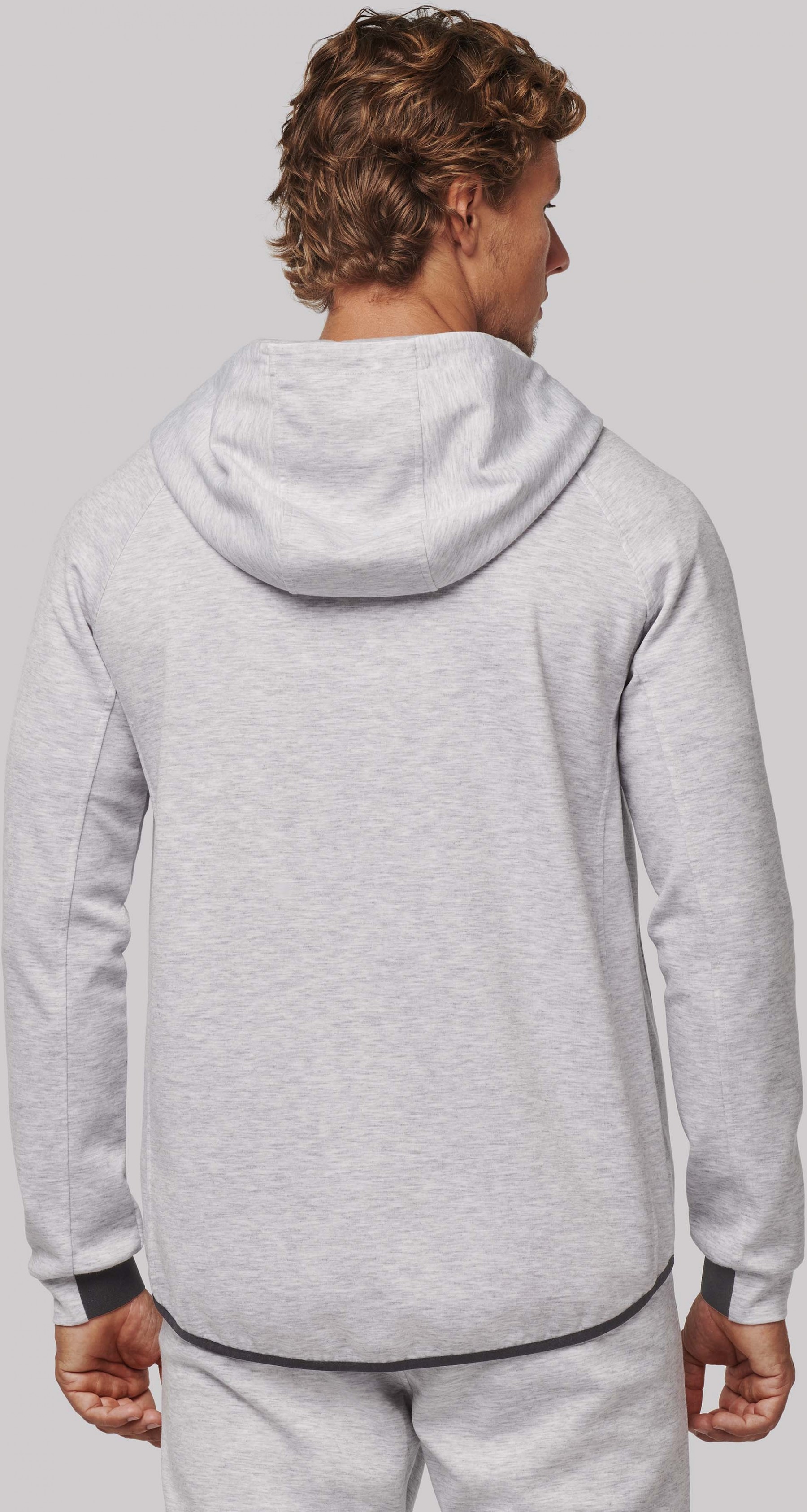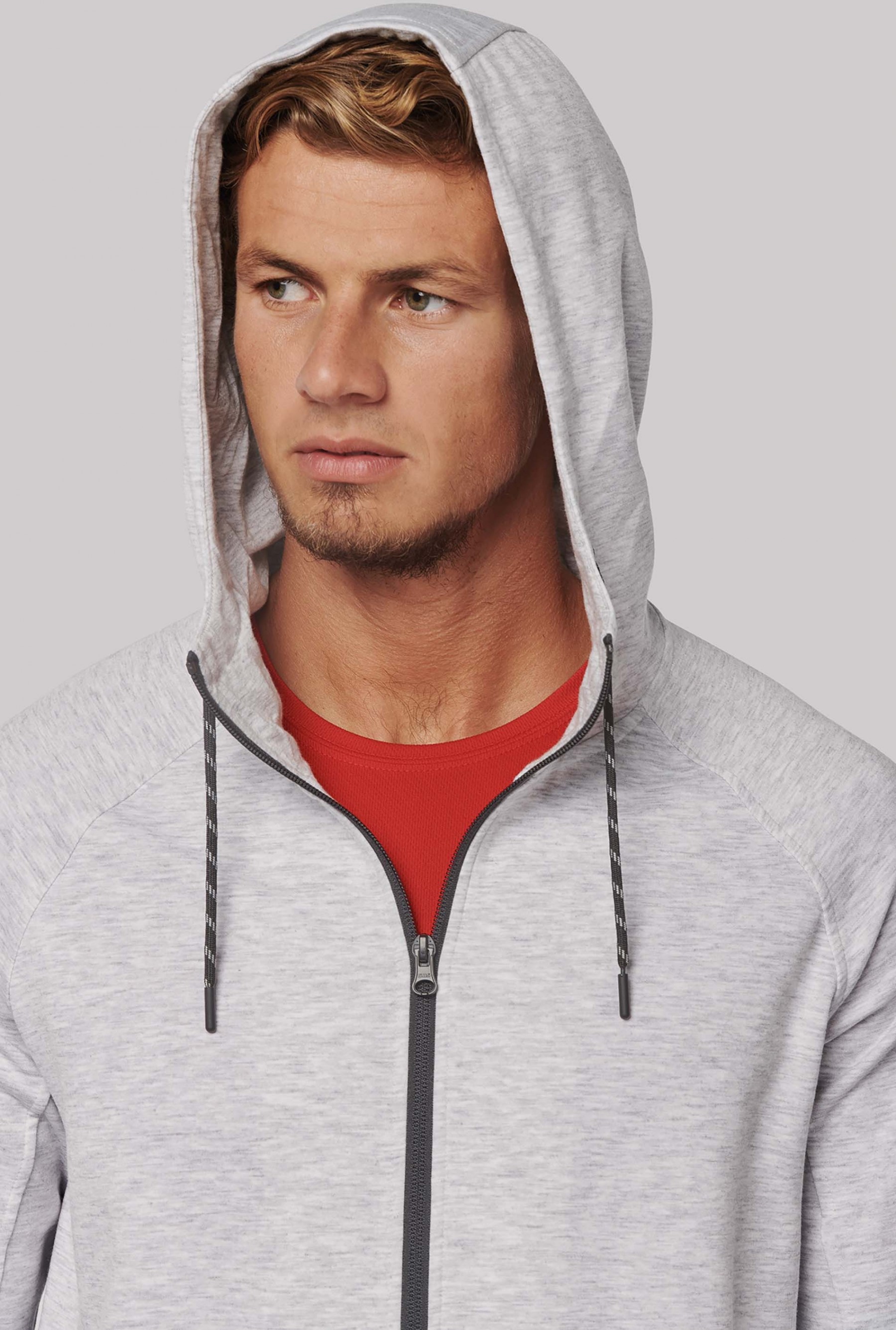 94% polyester / 6% élasthanne (79% polyester / 15% viscose / 6% élasthanne pour coloris chiné). Matière ultra confortable. Fermeture zippée. 2 poches avant zippées finition thermosoudée. Capuche doublure jersey 65% polyester / 35% coton avec cordon de serrage bicolore finition embout plastique. Bas de manches resserrés avec une partie élastiquée contrastée. Bas de vêtement finition biais contrasté.