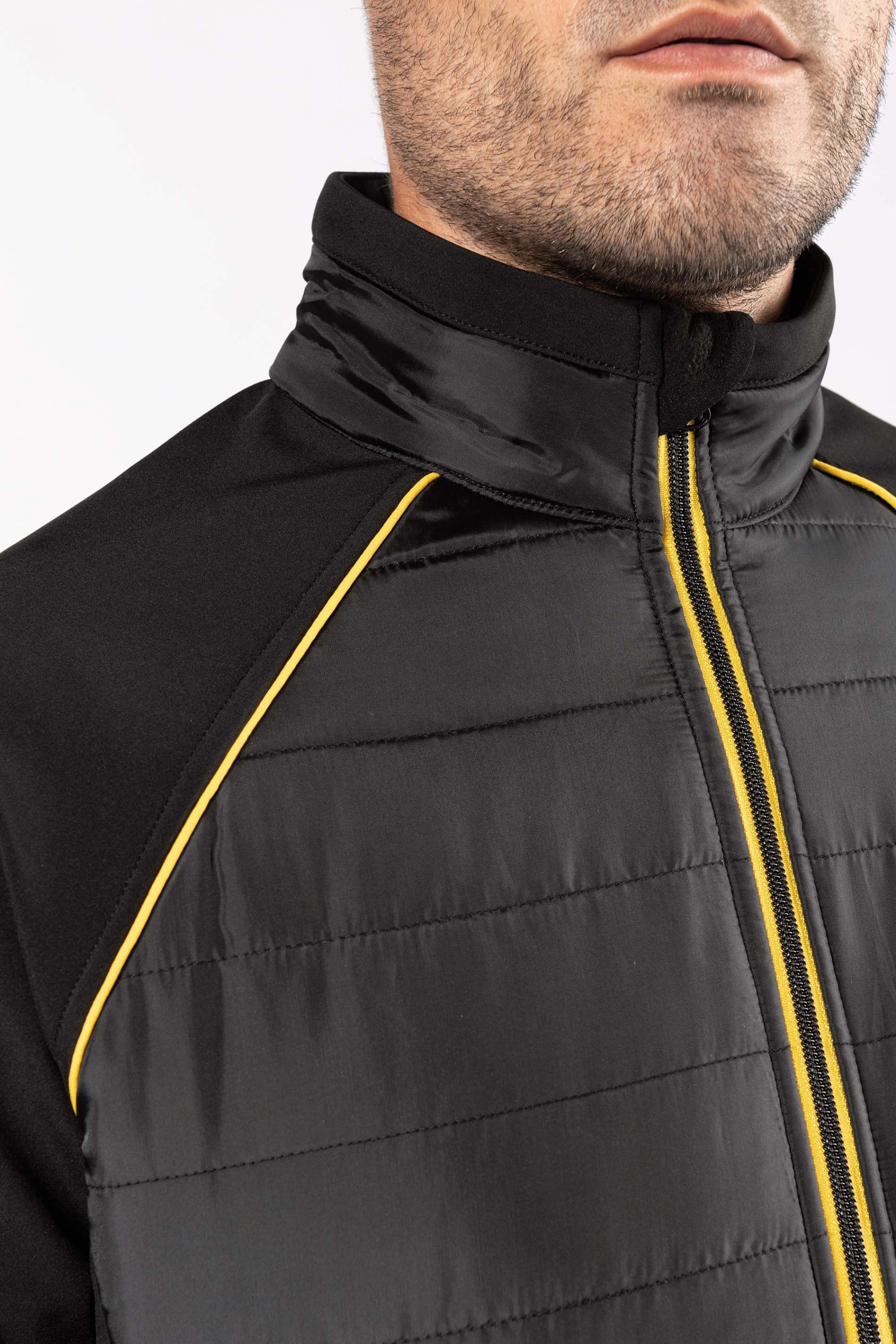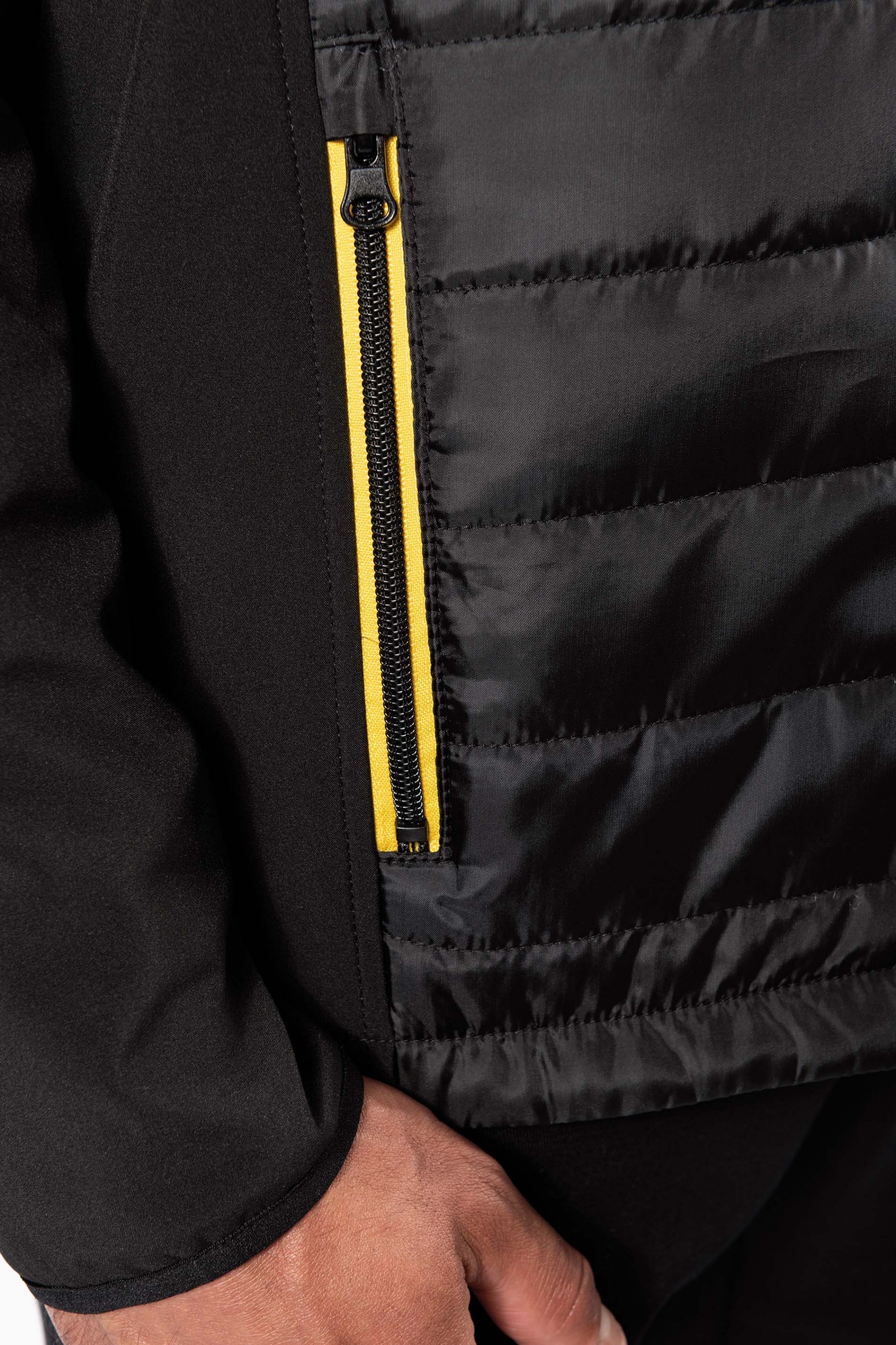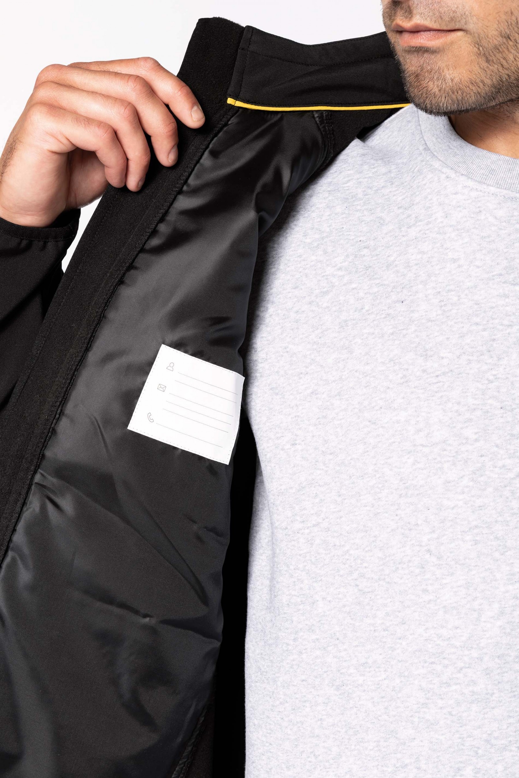 100 % polyester. Softshell 2 couches, tissu extensible dans les 4 sens pour plus d'aisance avec couche intérieure polaire pour plus de chaleur sur les manches et les épaules. Devant et dos : 100 % polyester 75 g taffetas 230T avec enduction. Tissu traité déperlant. 2 poches avant zippées. 1 poche zippée intérieure côté droit. 1 étiquette nom fixée intérieur gauche. Passepoil contrasté aux emmanchures et intérieur col. Fermeture zippée avant et poches contrastée. Zip invisible de personnalisation au bas de vêtement. Idéal pour une utilisation quotidienne.
