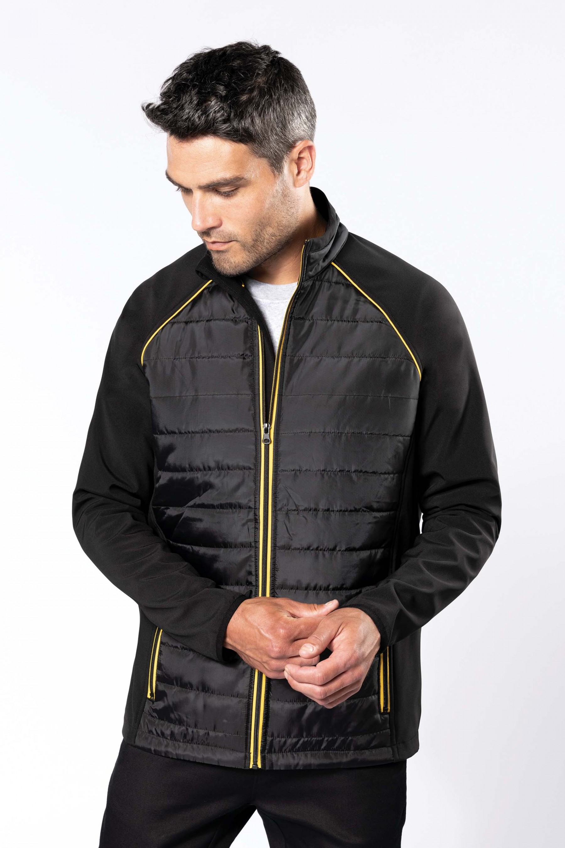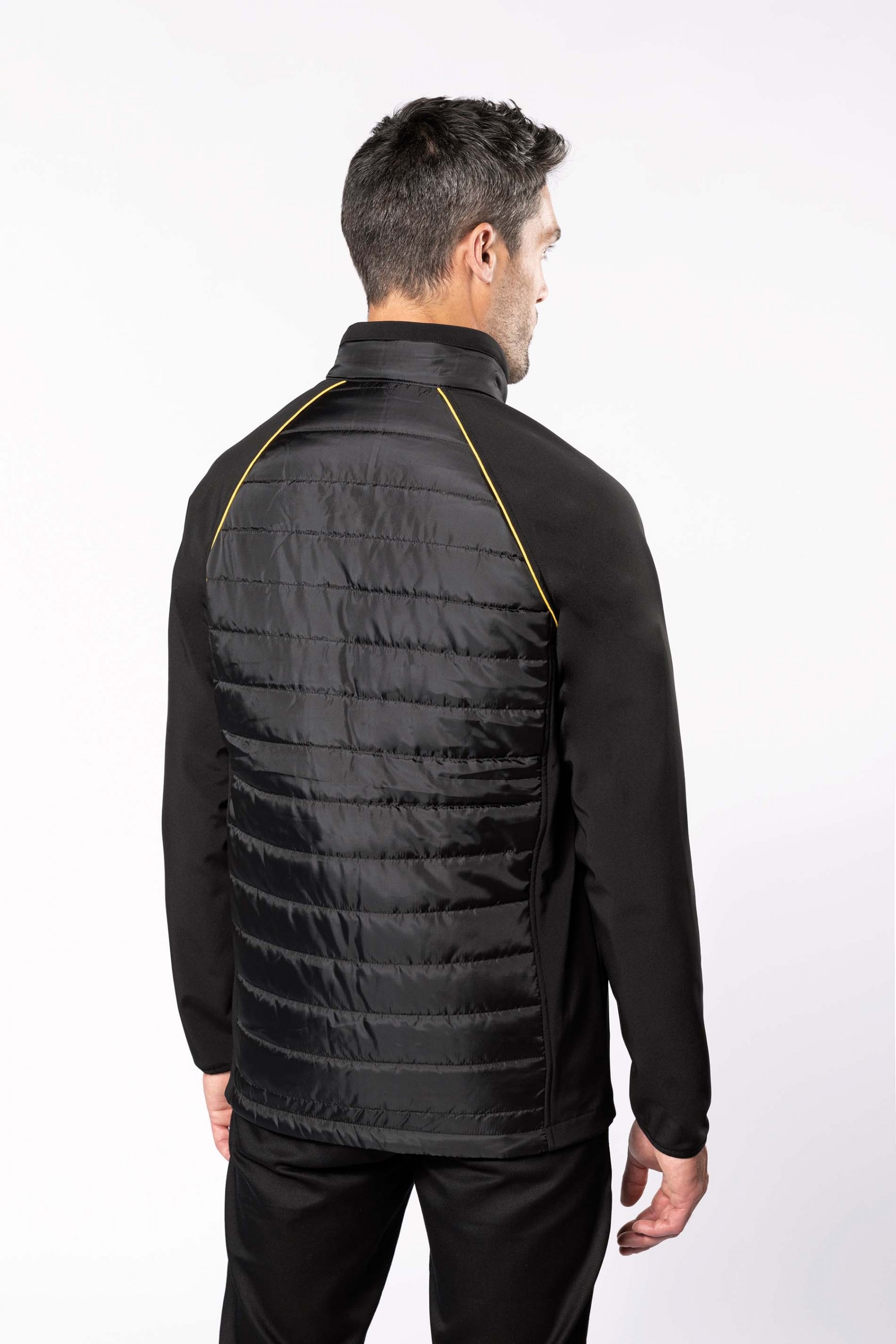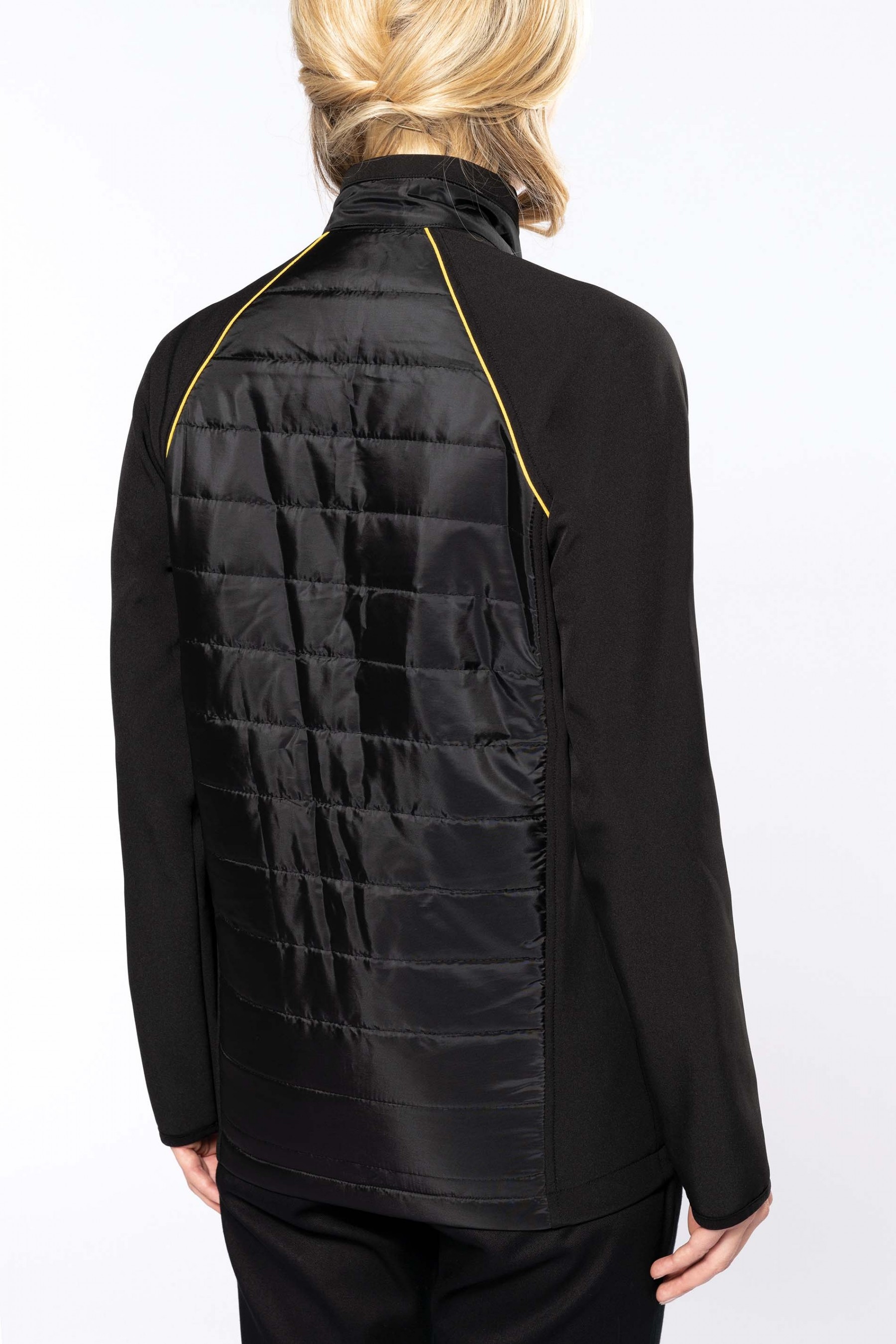 100 % polyester. Softshell 2 couches, tissu extensible dans les 4 sens pour plus d'aisance avec couche intérieure polaire pour plus de chaleur sur les manches et les épaules. Devant et dos : 100 % polyester 75 g taffetas 230T avec enduction. Tissu traité déperlant. 2 poches avant zippées. 1 poche zippée intérieure côté droit. 1 étiquette nom fixée intérieur gauche. Passepoil contrasté aux emmanchures et intérieur col. Fermeture zippée avant et poches contrastée. Zip invisible de personnalisation au bas de vêtement. Idéal pour une utilisation quotidienne.
